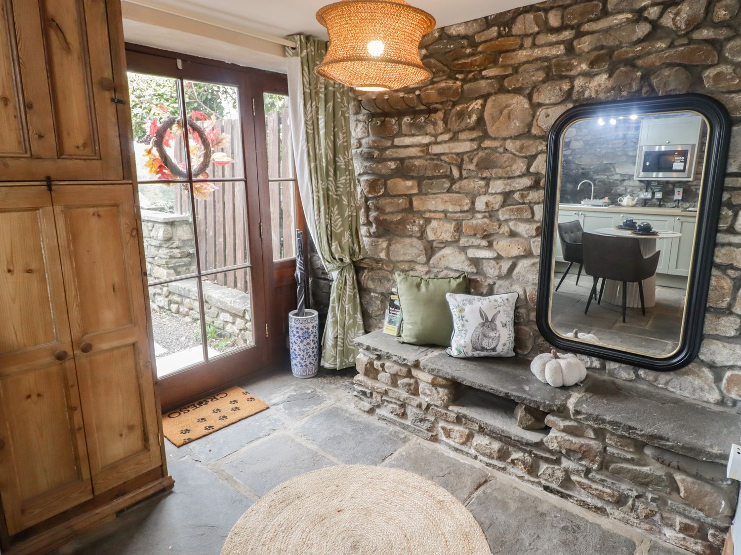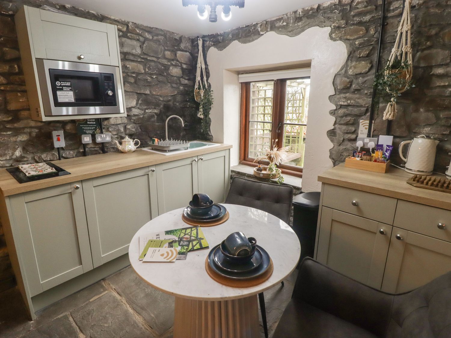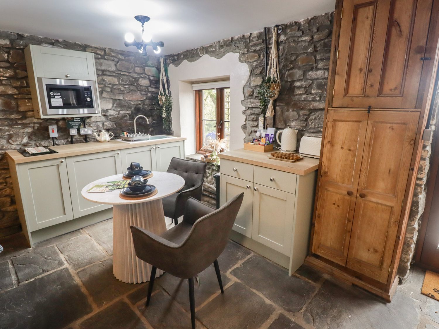 "Ground-floor apartment. One twin bedroom. Shower room with walk-in shower, basin and WC. Open-plan living space with kitchen, dining area and sitting area with woodburning stove"