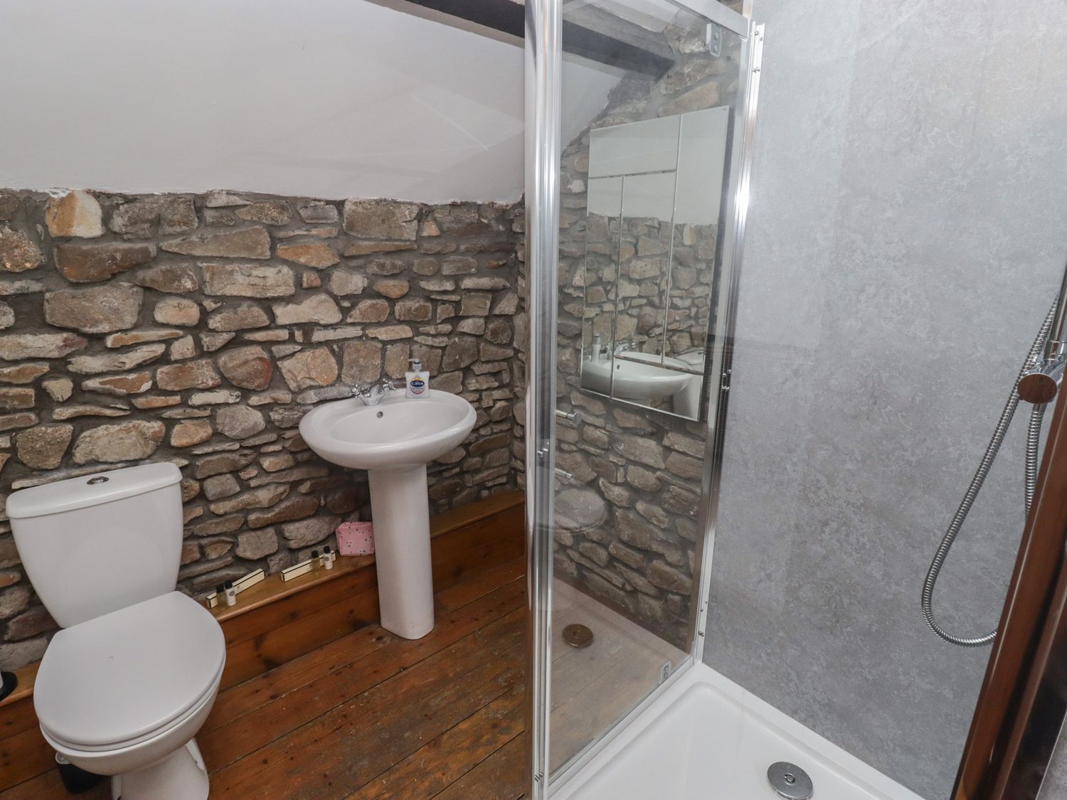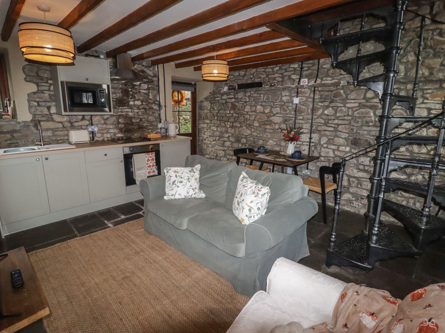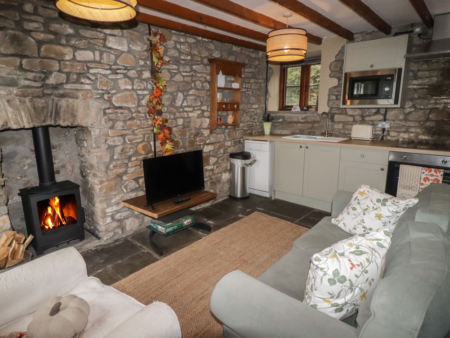 "One double bedroom. Shower room with walk-in shower, basin and WC. Open-plan living space with kitchen, dining area and sitting area with woodburning stove"