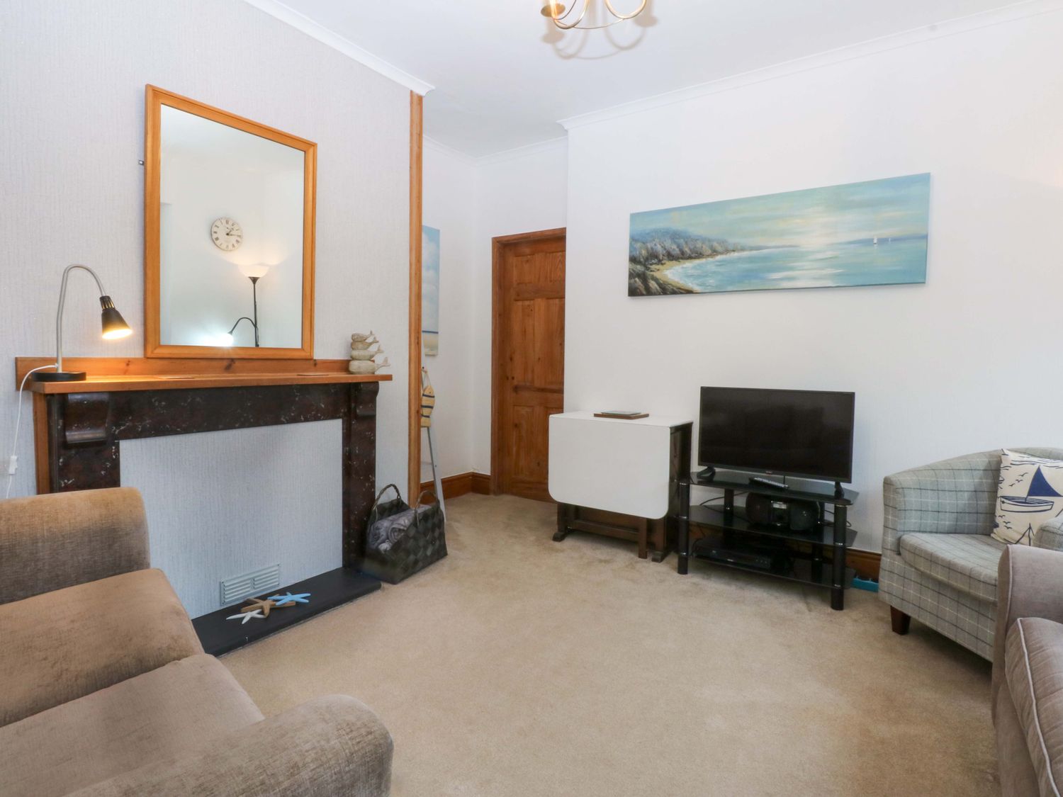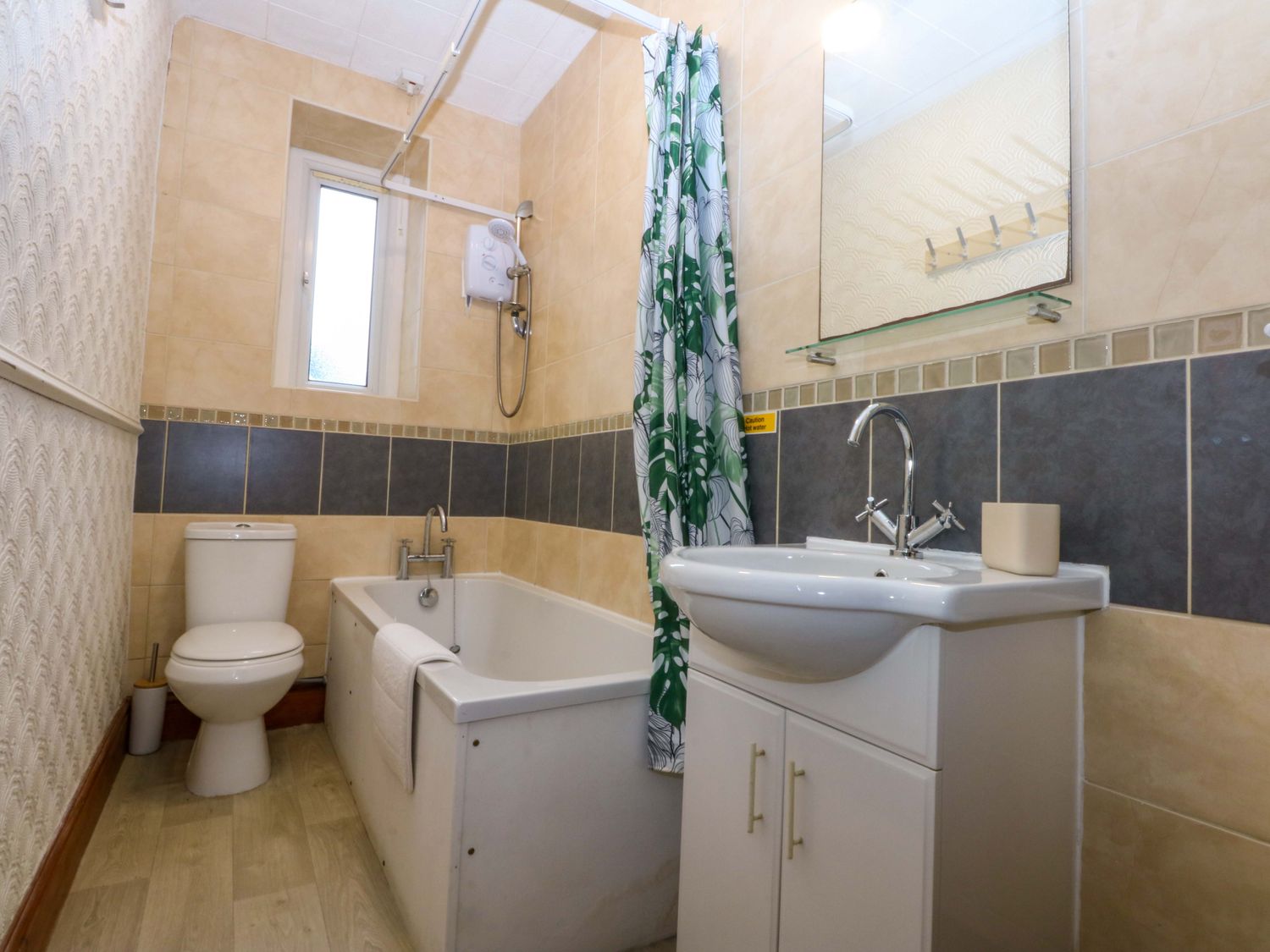 "Two bedrooms: 1 x double, 1 x bunk room. Ground floor bathroom with bath, shower over, basin, WC and heated towel rail. Kitchen. Hallway. Sitting room."