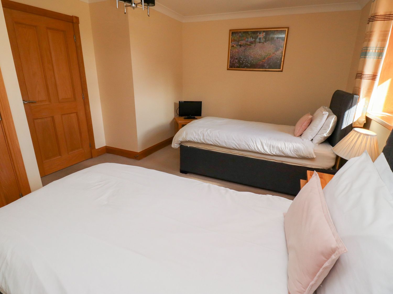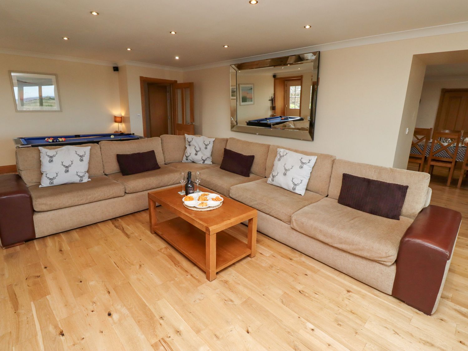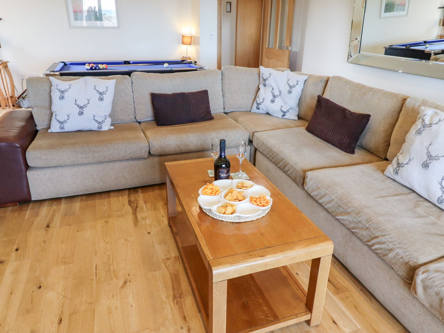 "Six bedrooms: 1 x super king-size double with sofa and en-suite bath, separate shower, double basin and WC leading to 1 x twin, 1 x super king-size double (zip/link, can be twin on request), 1 x ground floor super king-size double, 1 x twin, 1 x ground floor twin. Shower room with shower, basin and WC. Ground floor bathroom with bath, separate shower, basin and WC. Kitchen with dining area. Utility. Sitting room with woodburning stove and snooker table. Shared childrens play area "