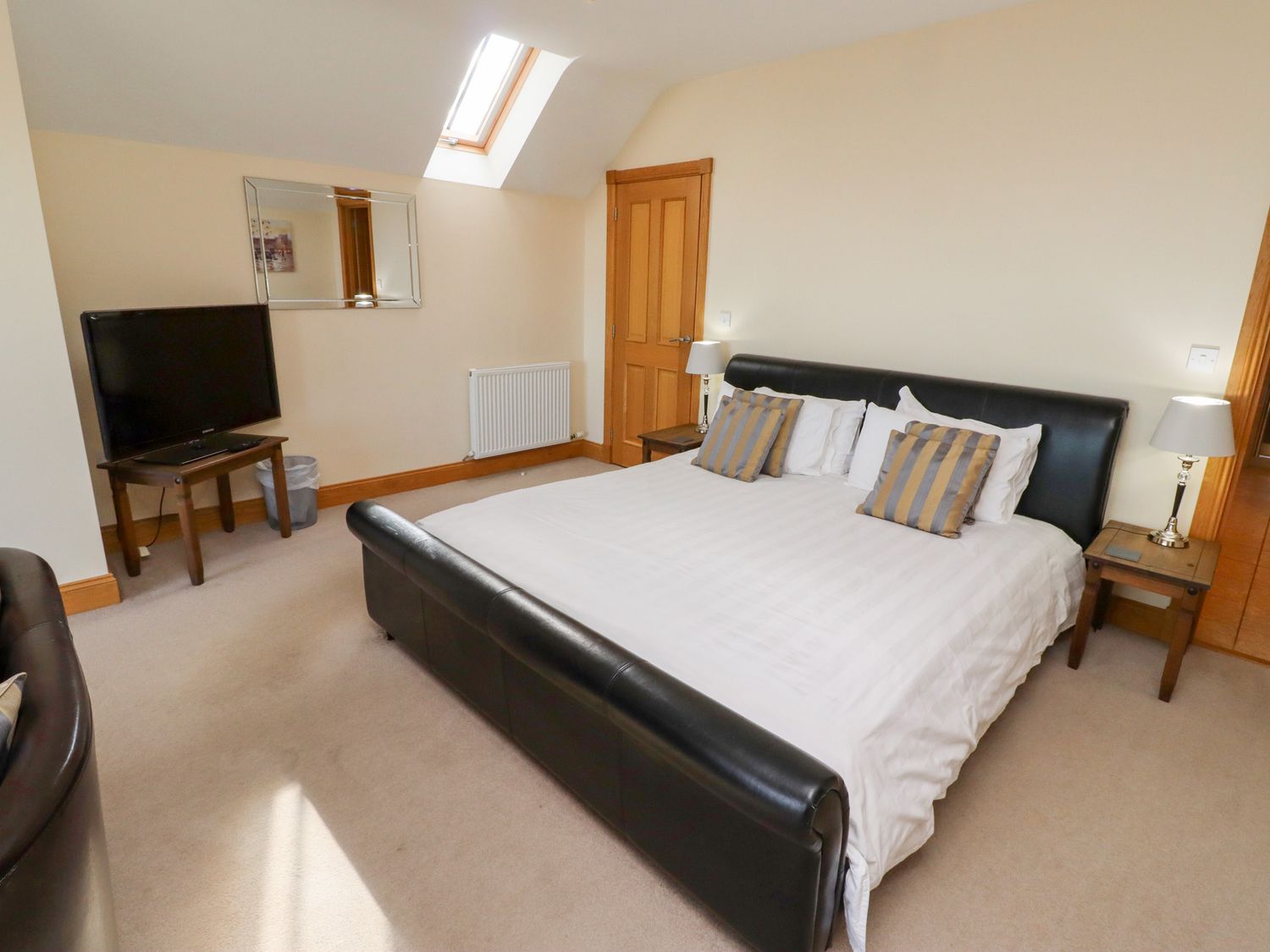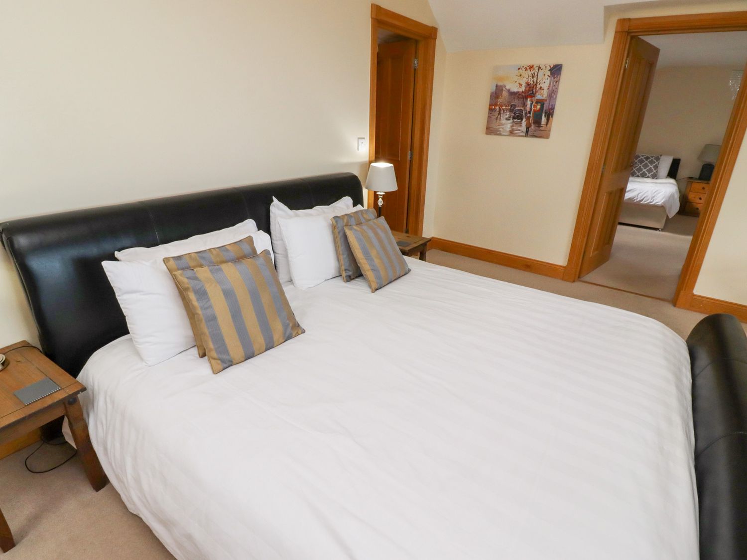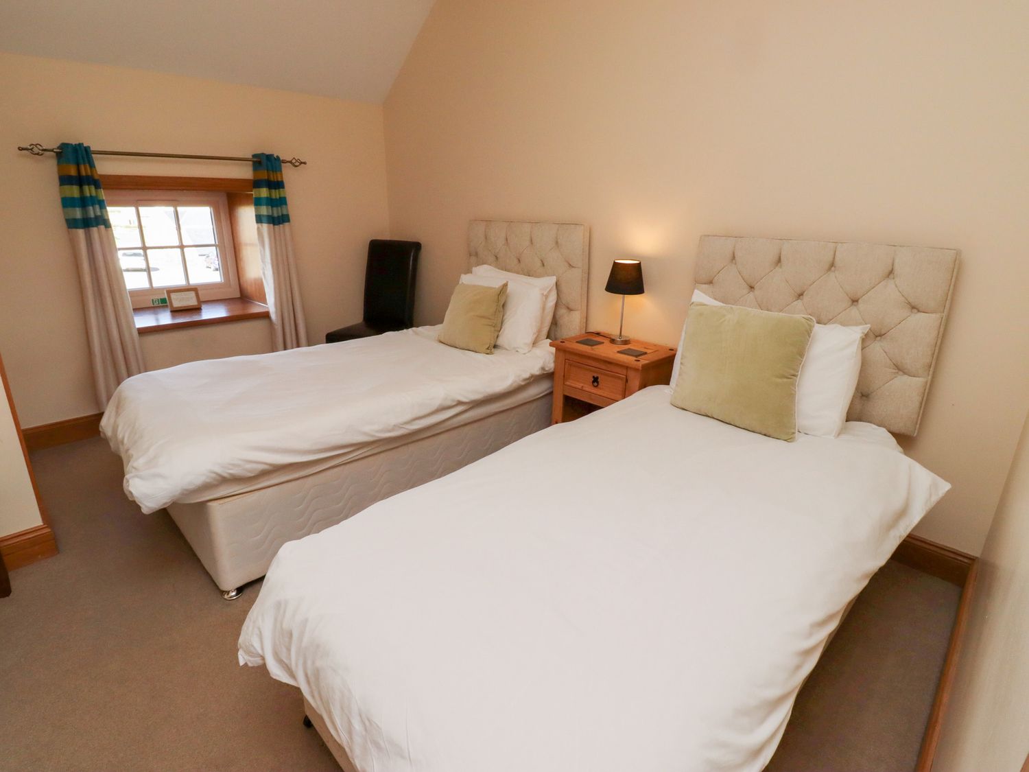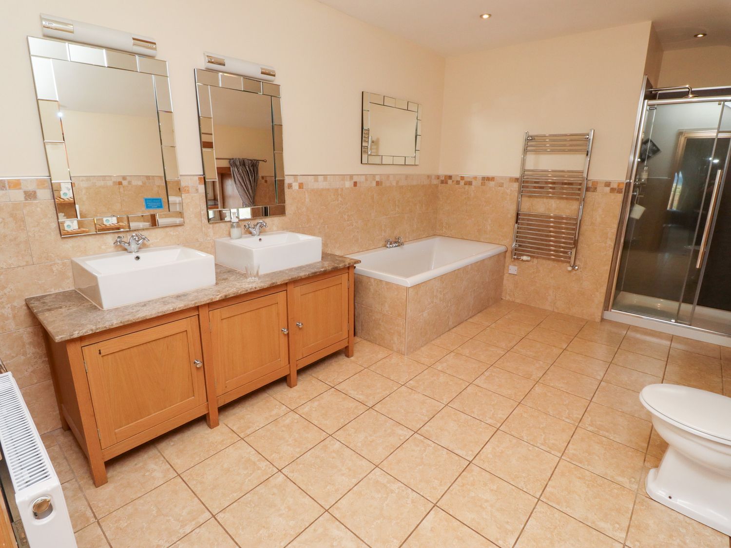 "Six bedrooms: 1 x super king-size double with sofa and en-suite bath, separate shower, double basin and WC leading to 1 x twin, 1 x super king-size double (zip/link, can be twin on request), 1 x ground floor super king-size double, 1 x twin, 1 x ground floor twin. Shower room with shower, basin and WC. Ground floor bathroom with bath, separate shower, basin and WC. Kitchen with dining area. Utility. Sitting room with woodburning stove and snooker table. Shared childrens play area "