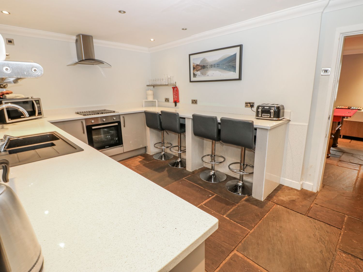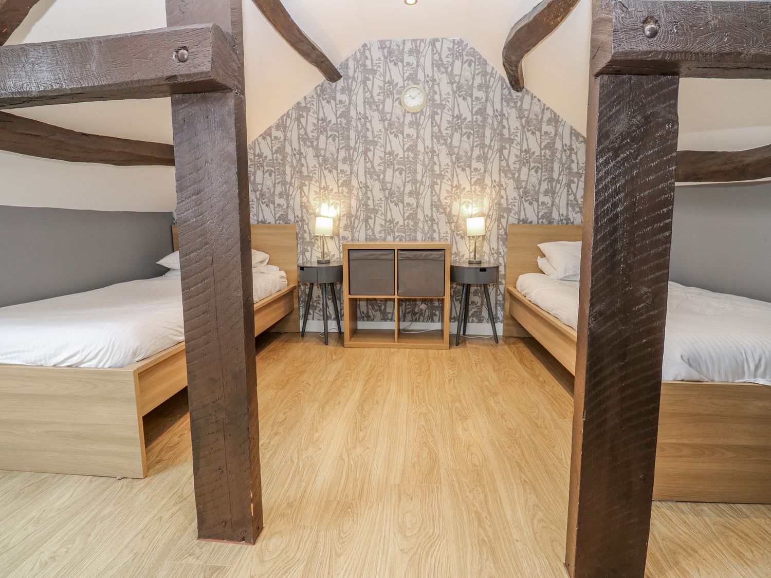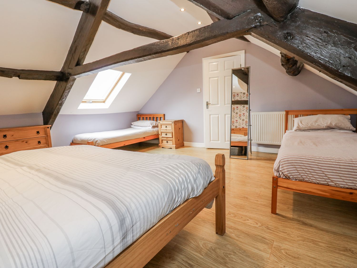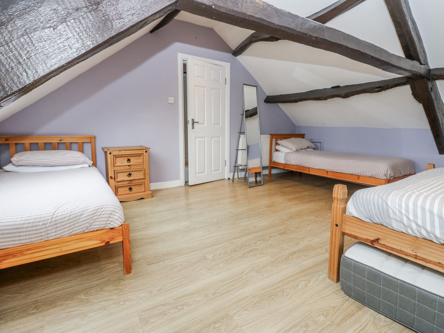 "Over three floors. Five bedrooms: 1 x double with en-suite bath, hand-held shower, basin and WC, 2 x double, 1 x second-floor family room with double and 2 singles, 1 x second-floor twin. Family bathroom with bath, walk-in shower, basin and WC. Ground-floor shower room with walk-in shower, basin and WC. Kitchen. Utility. Living/dining room with woodburning stove. Games room"