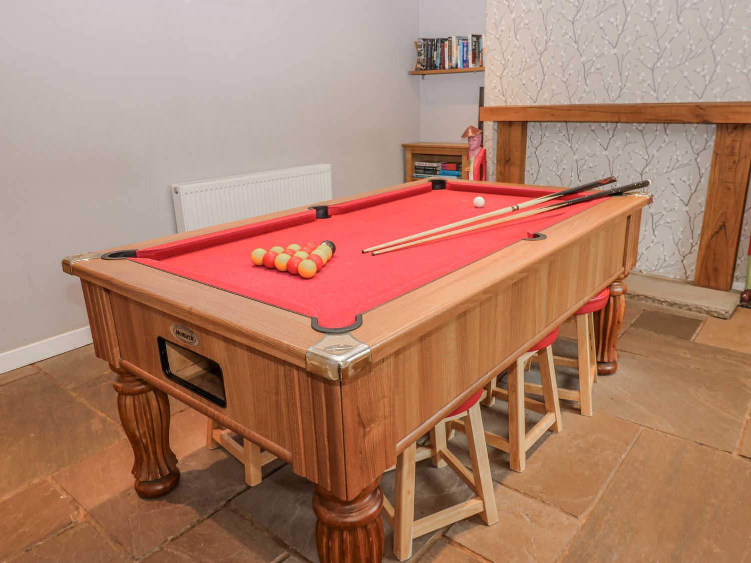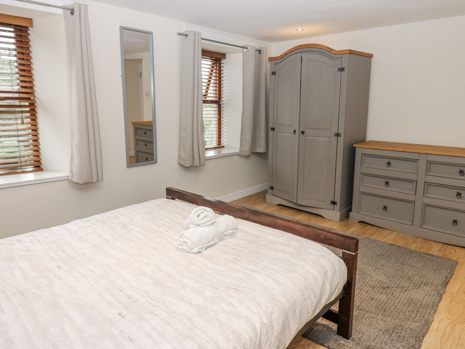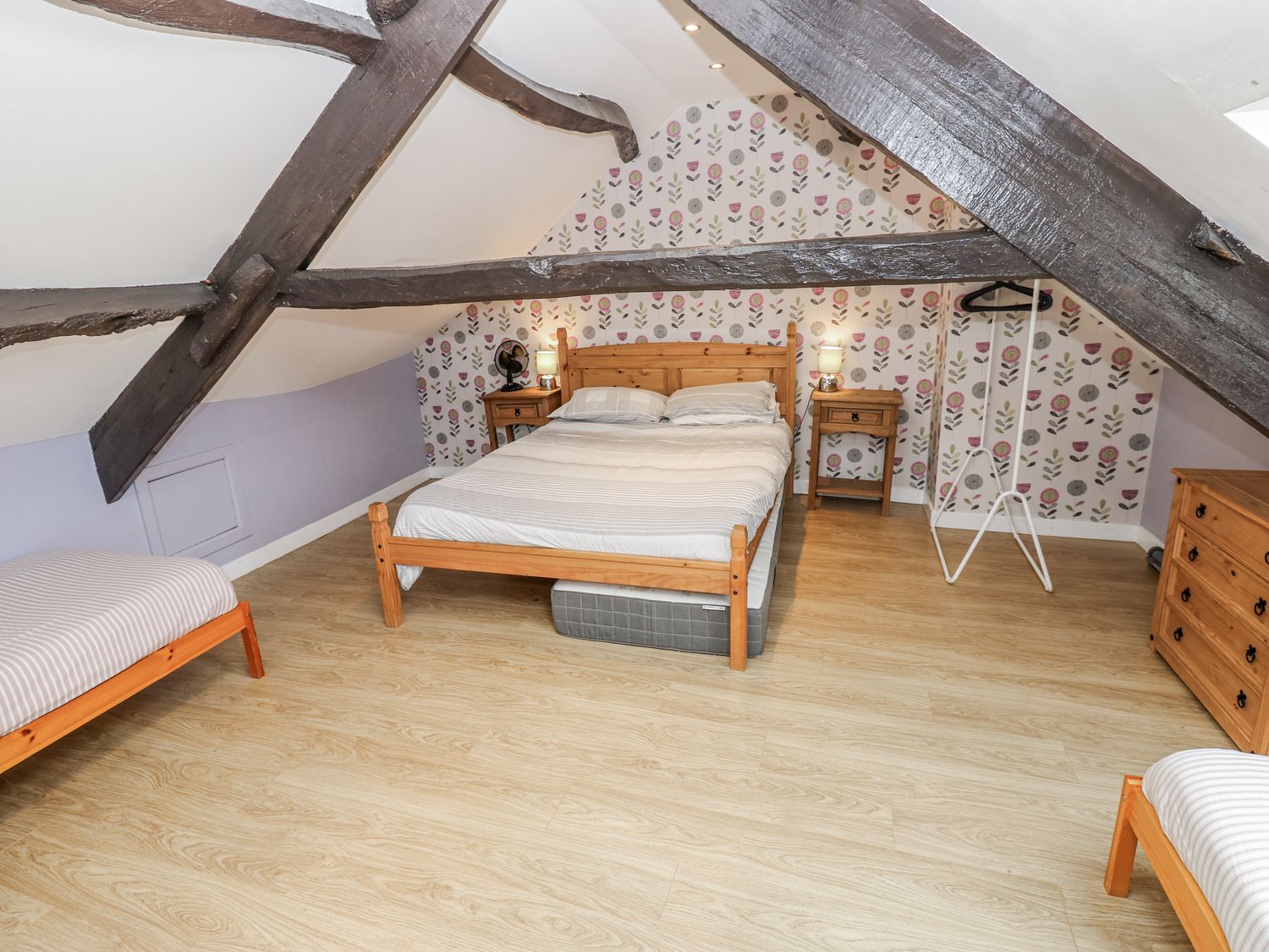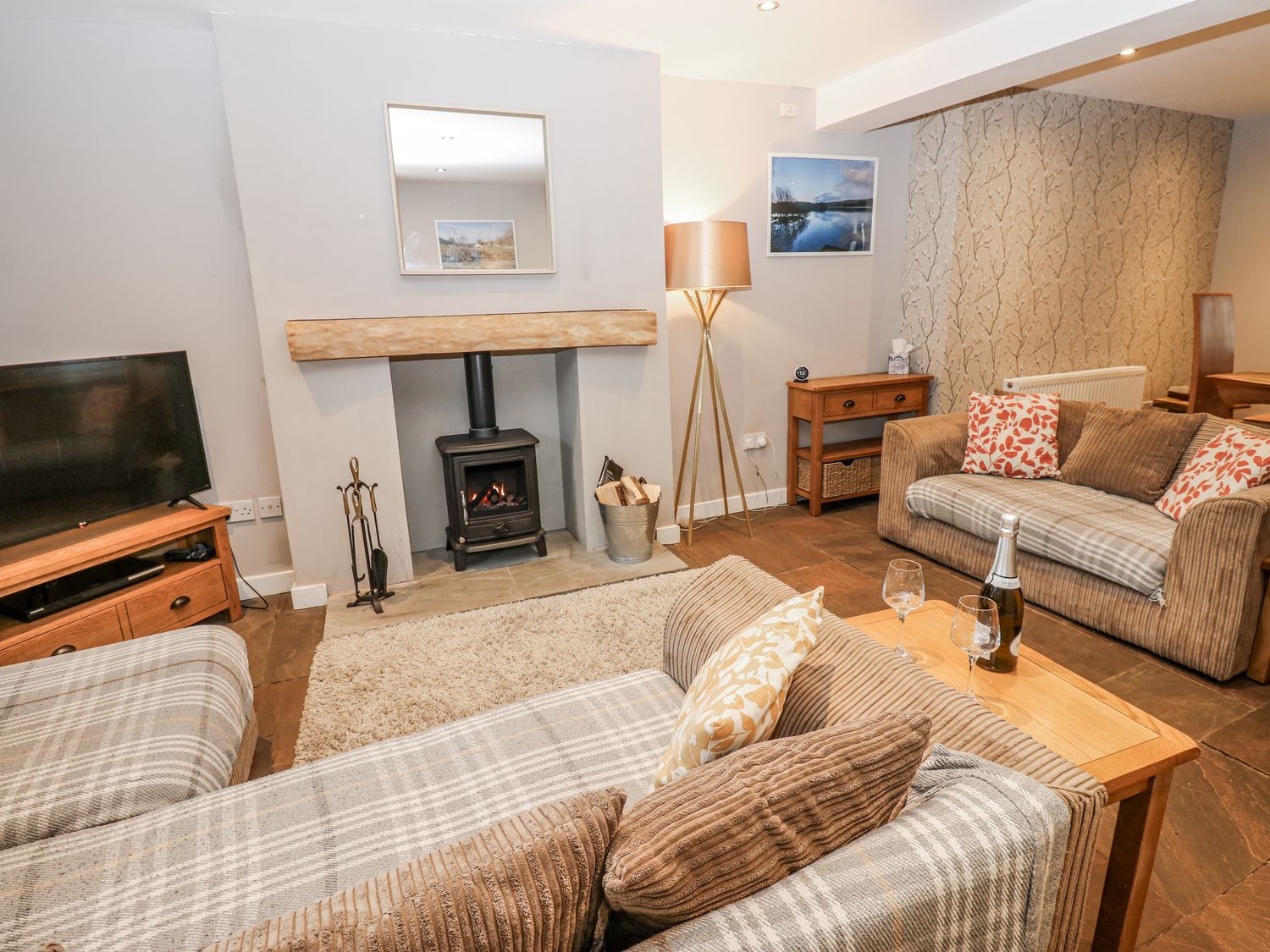 "Over three floors. Five bedrooms: 1 x double with en-suite bath, hand-held shower, basin and WC, 2 x double, 1 x second-floor family room with double and 2 singles, 1 x second-floor twin. Family bathroom with bath, walk-in shower, basin and WC. Ground-floor shower room with walk-in shower, basin and WC. Kitchen. Utility. Living/dining room with woodburning stove. Games room"