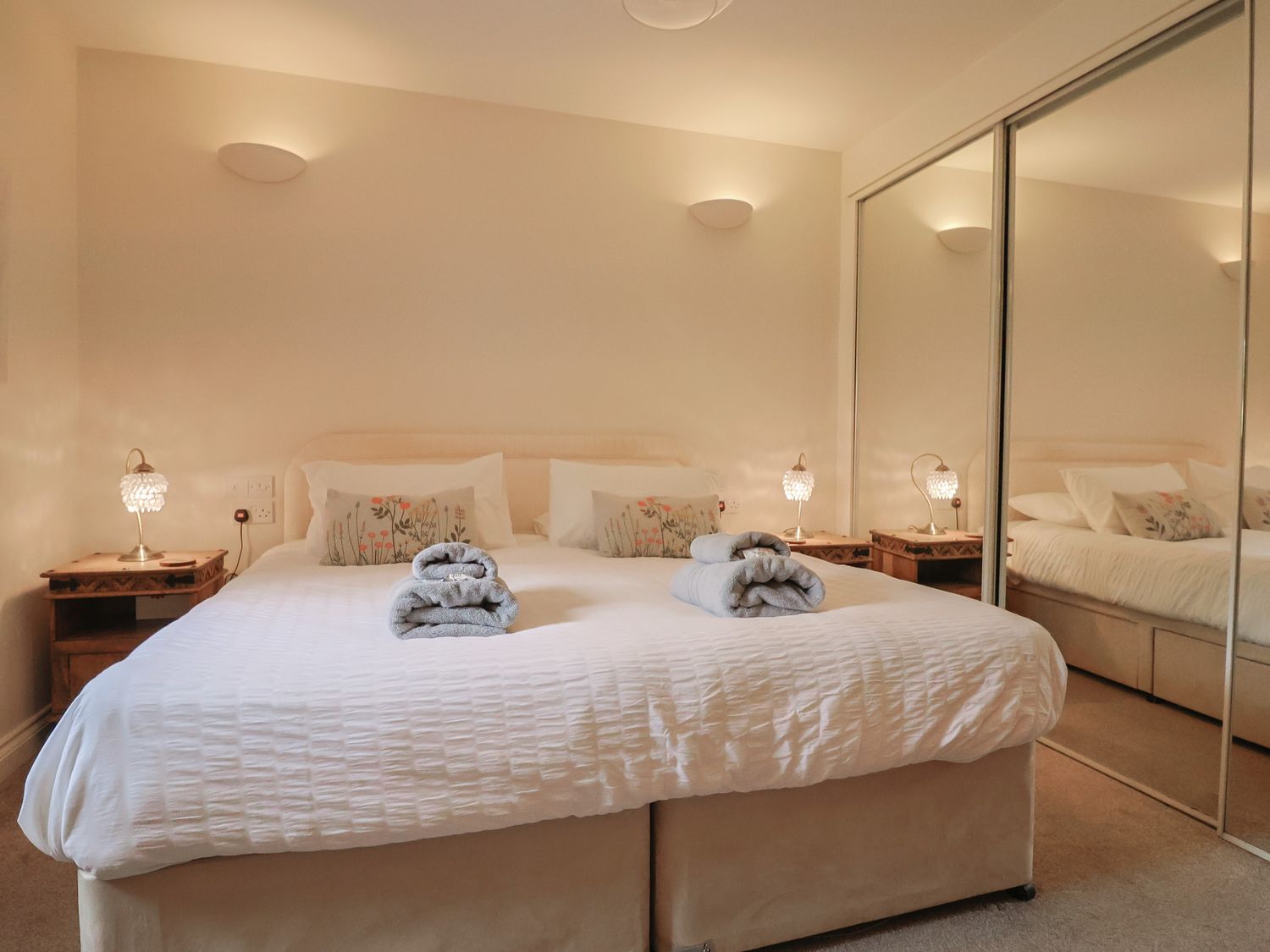 "Single-storey. Two bedrooms: 1 x king-size, 1 x super-king-size with zip/link beds which can be made into twin on request (please specify at time of booking). Shower room with walk-in shower, wash basin, towel rail and WC. Open-plan living space with kitchen, dining area, and sitting area. "