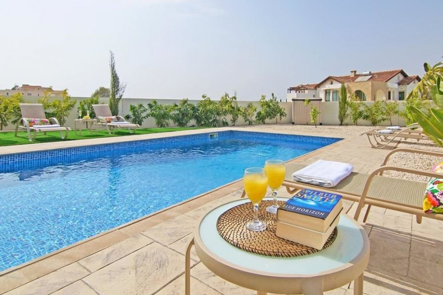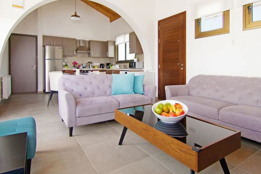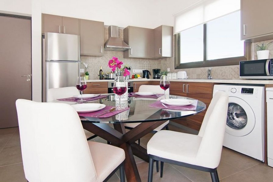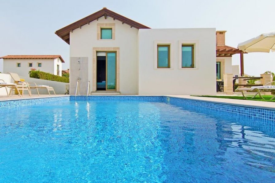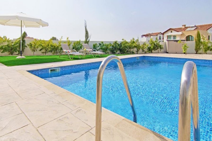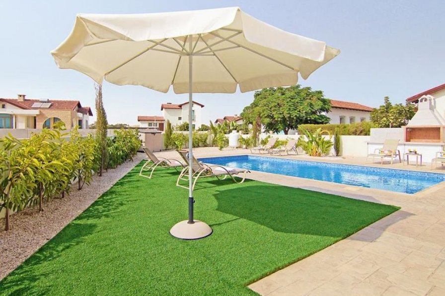 4-room house, detached, for 6 people, 100 m2, modern furnishings. **Inside** * Living/dining room with local TV, satellite TV, DVD and dining-table * Smoking not allowed * Internet (Wireless LAN [WLAN]) * Sleeping room with 1 double bed * Sleeping room with 1 double bed * Sleeping room with 1 double bed * Kitchen with 4 hot plates, micro wave, oven, dining table, dishwasher, fridge and deep freezer * Bath-room and shower/WC * Terrace, patio, terrace furniture * Other equipment: safe, hair dryer, iron, washing machine **Outside** * Modern villa "ATHKYB1" * House Equipment: air conditioning, washing machine (private use) * Access & Parking: private parking * All-season motor access to the house * Situation: in the centre of Ayia Thekla, on the outskirts of Ayia Napa * Surroundings of the house: grounds (private use), swimming pool (private use, length 8 m x width 4 m), outside shower (private use) * Facilities and distances: supermarket 2.5 km, restaurant 2.5 km, sandy beach 3 km