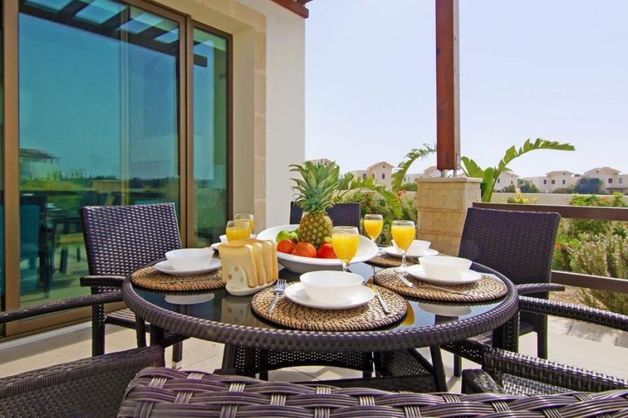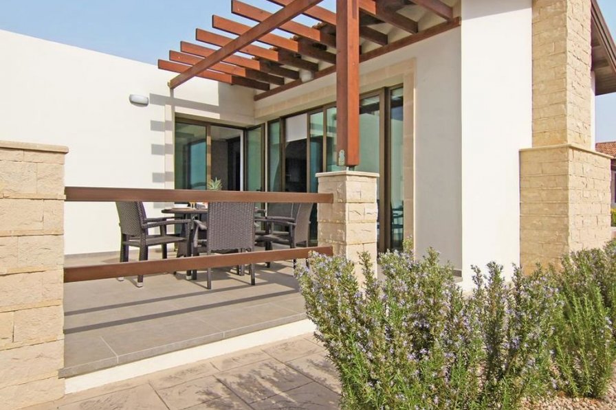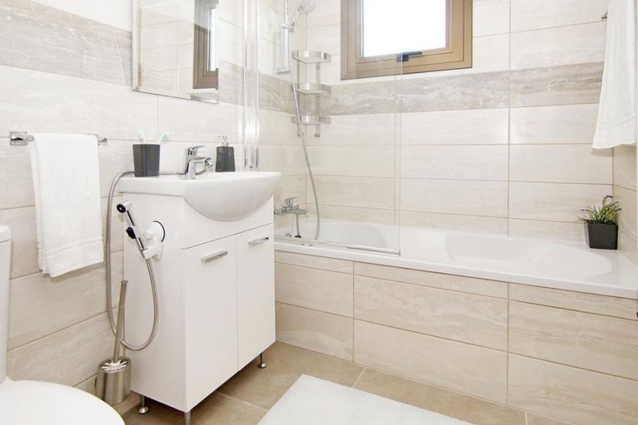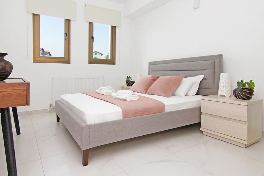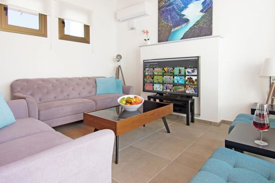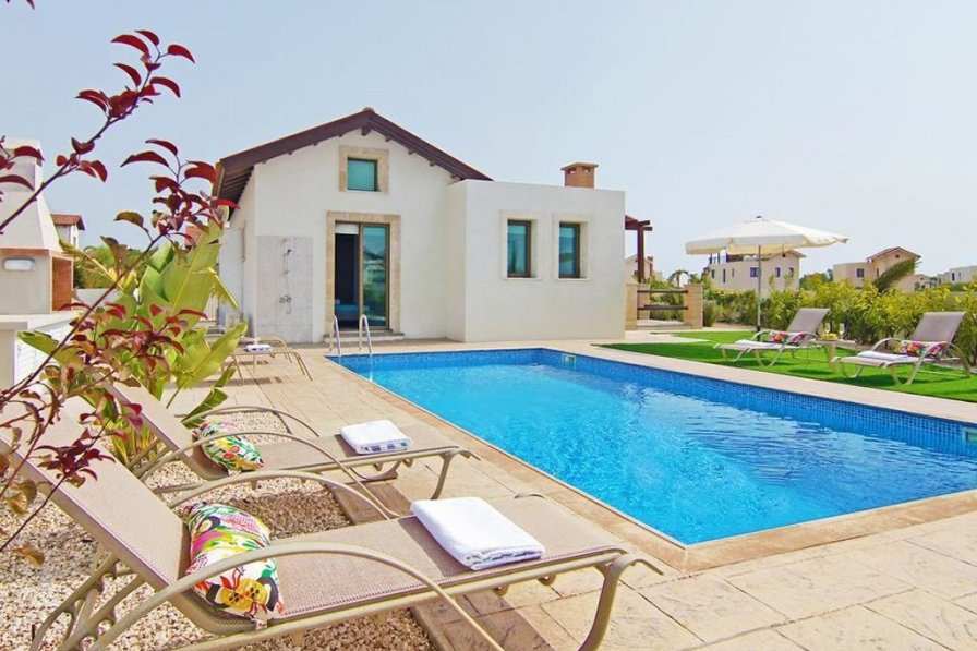 4-room house, detached, for 6 people, 100 m2, modern furnishings. **Inside** * Living/dining room with local TV, satellite TV, DVD and dining-table * Smoking not allowed * Internet (Wireless LAN [WLAN]) * Sleeping room with 1 double bed * Sleeping room with 1 double bed * Sleeping room with 1 double bed * Kitchen with 4 hot plates, micro wave, oven, dining table, dishwasher, fridge and deep freezer * Bath-room and shower/WC * Terrace, patio, terrace furniture * Other equipment: safe, hair dryer, iron, washing machine **Outside** * Modern villa "ATHKYB1" * House Equipment: air conditioning, washing machine (private use) * Access & Parking: private parking * All-season motor access to the house * Situation: in the centre of Ayia Thekla, on the outskirts of Ayia Napa * Surroundings of the house: grounds (private use), swimming pool (private use, length 8 m x width 4 m), outside shower (private use) * Facilities and distances: supermarket 2.5 km, restaurant 2.5 km, sandy beach 3 km