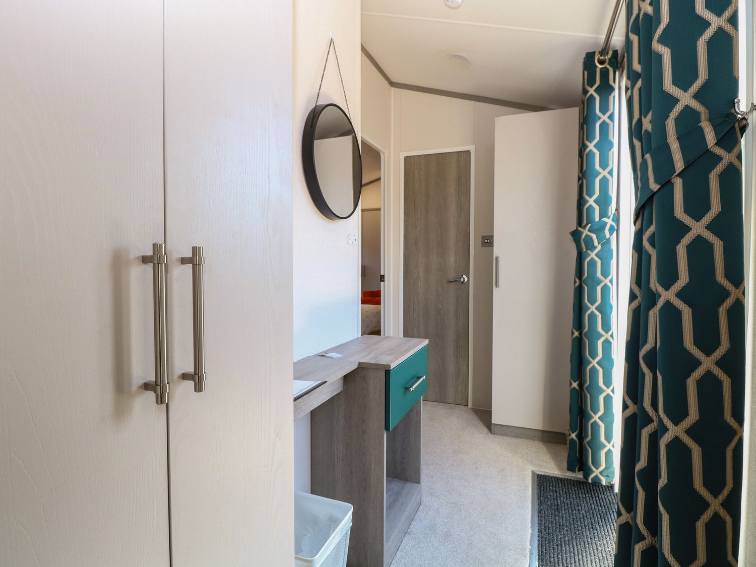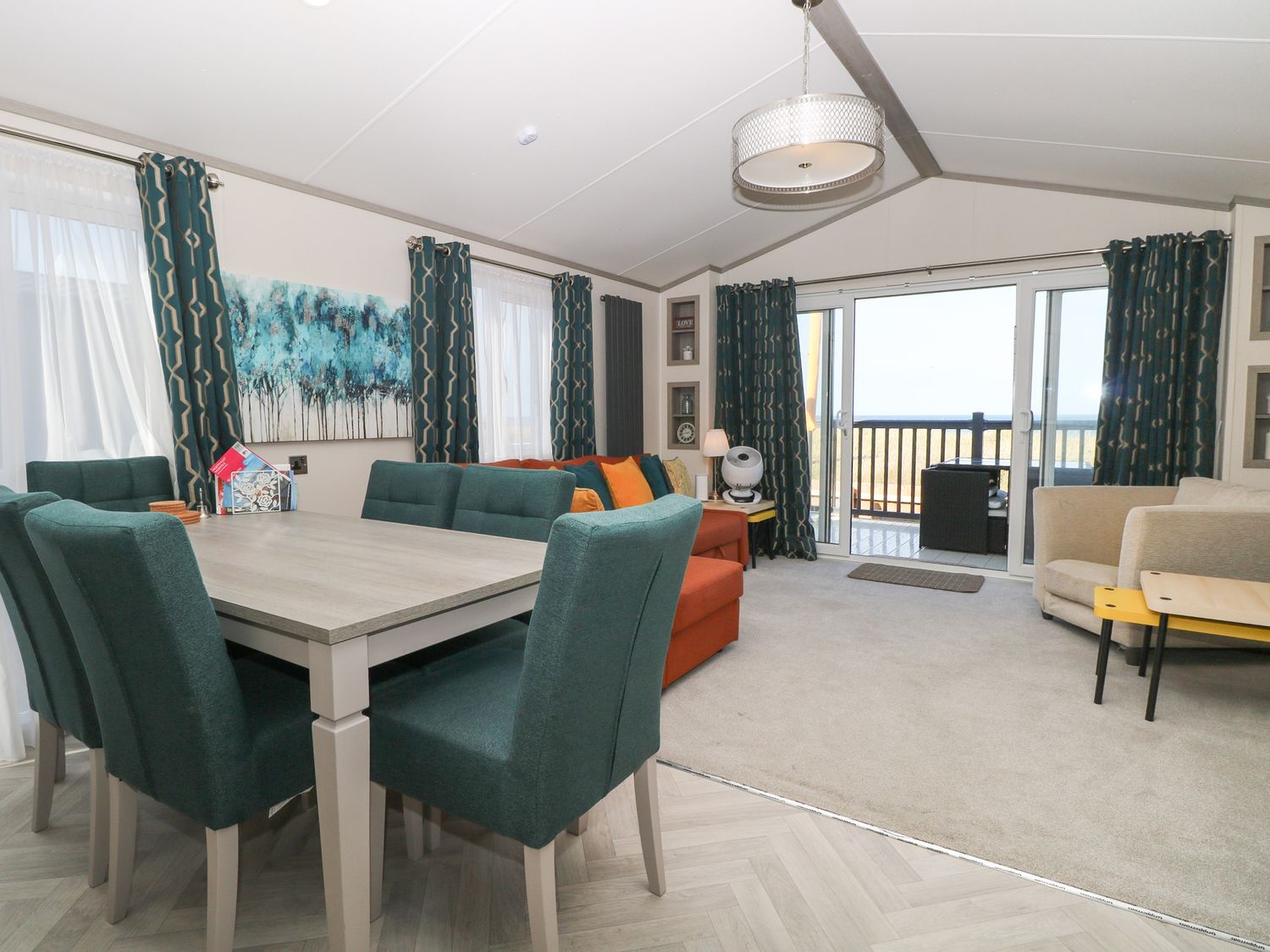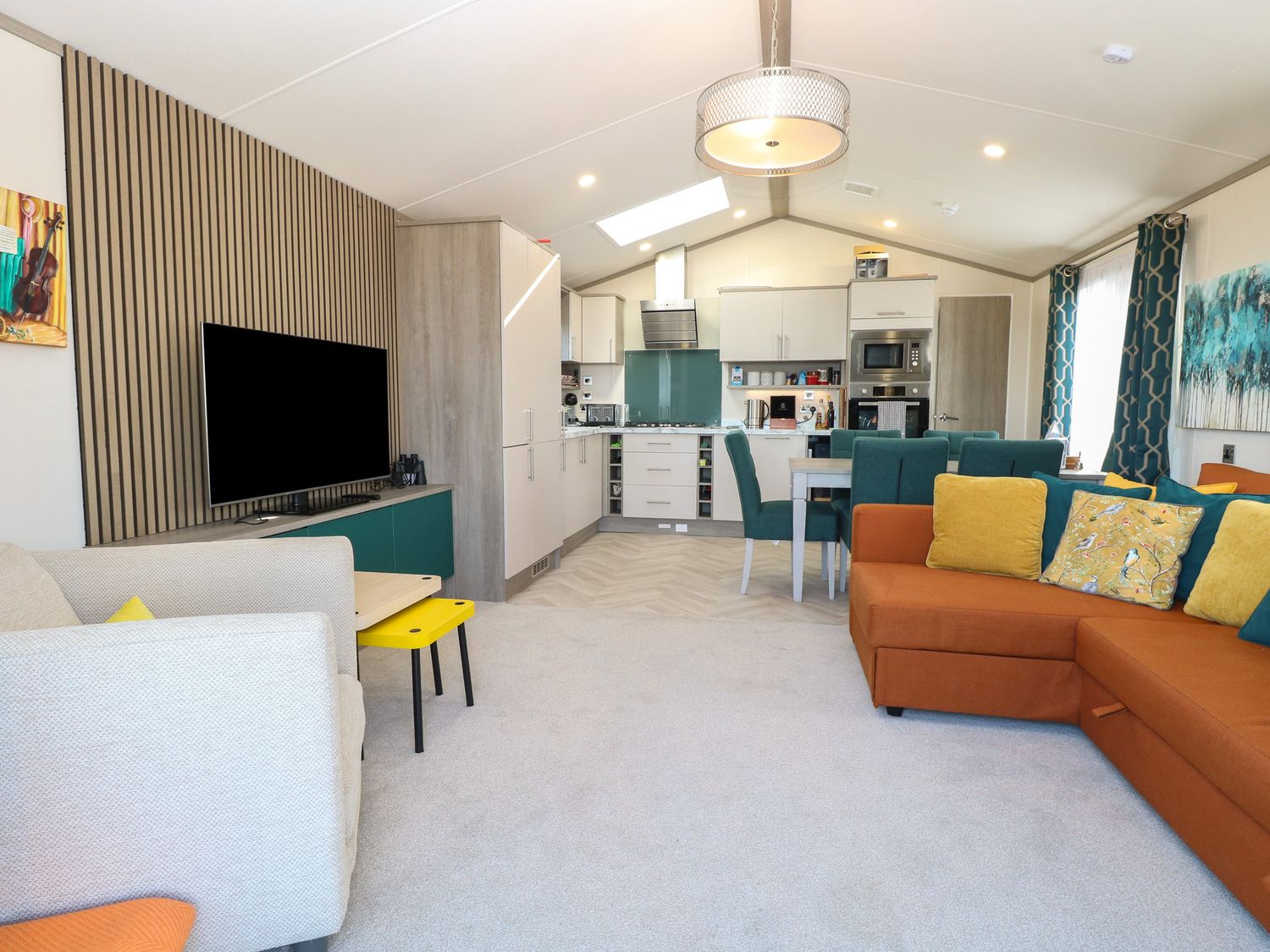 "Single-storey. Two bedrooms: 1 x super-king-size with en-suite walk-in shower, basin and WC, 1 x twin with Smart TV, Shower room with walk-in shower, basin and WC. Open-plan living space with kitchen, dining area, and sitting area"