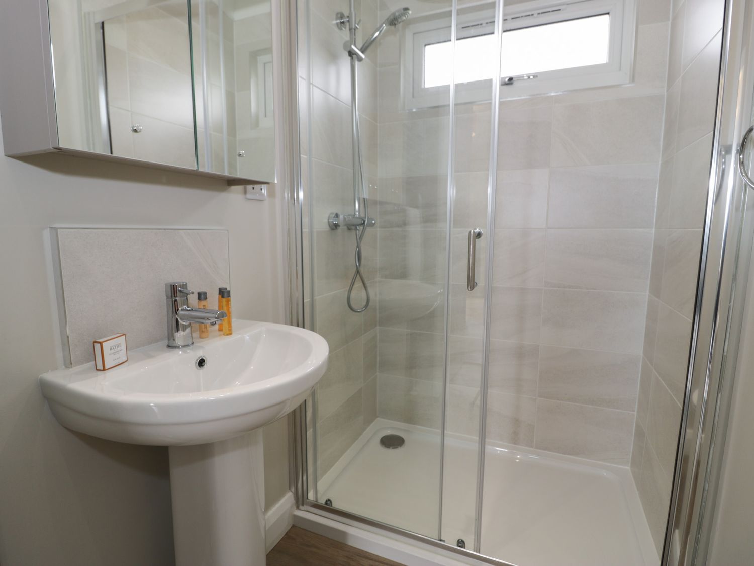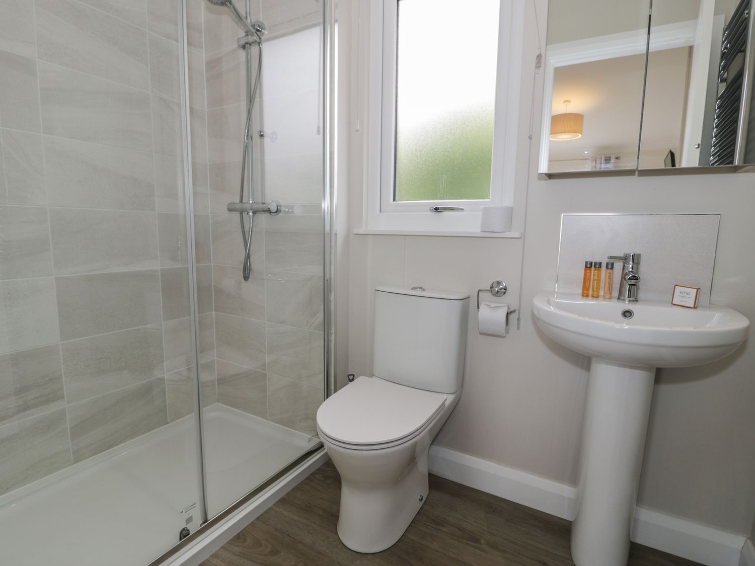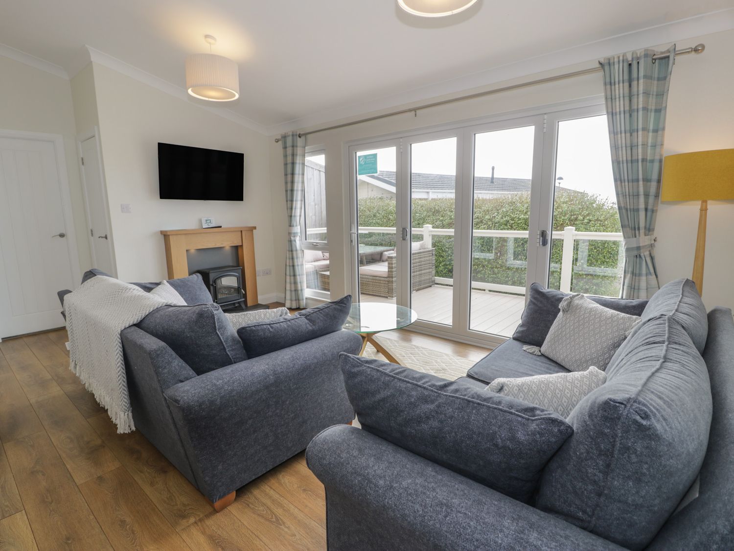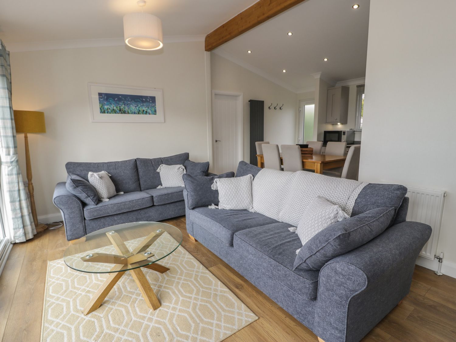 "Single-storey. Three bedrooms: 1 x double with Smart TV and en-suite with walk-in shower and basin and WC, 2 x twin. Shower room with walk-in shower, basin, WC. Open-plan living space with kitchen, dining area and sitting area with electric fire"