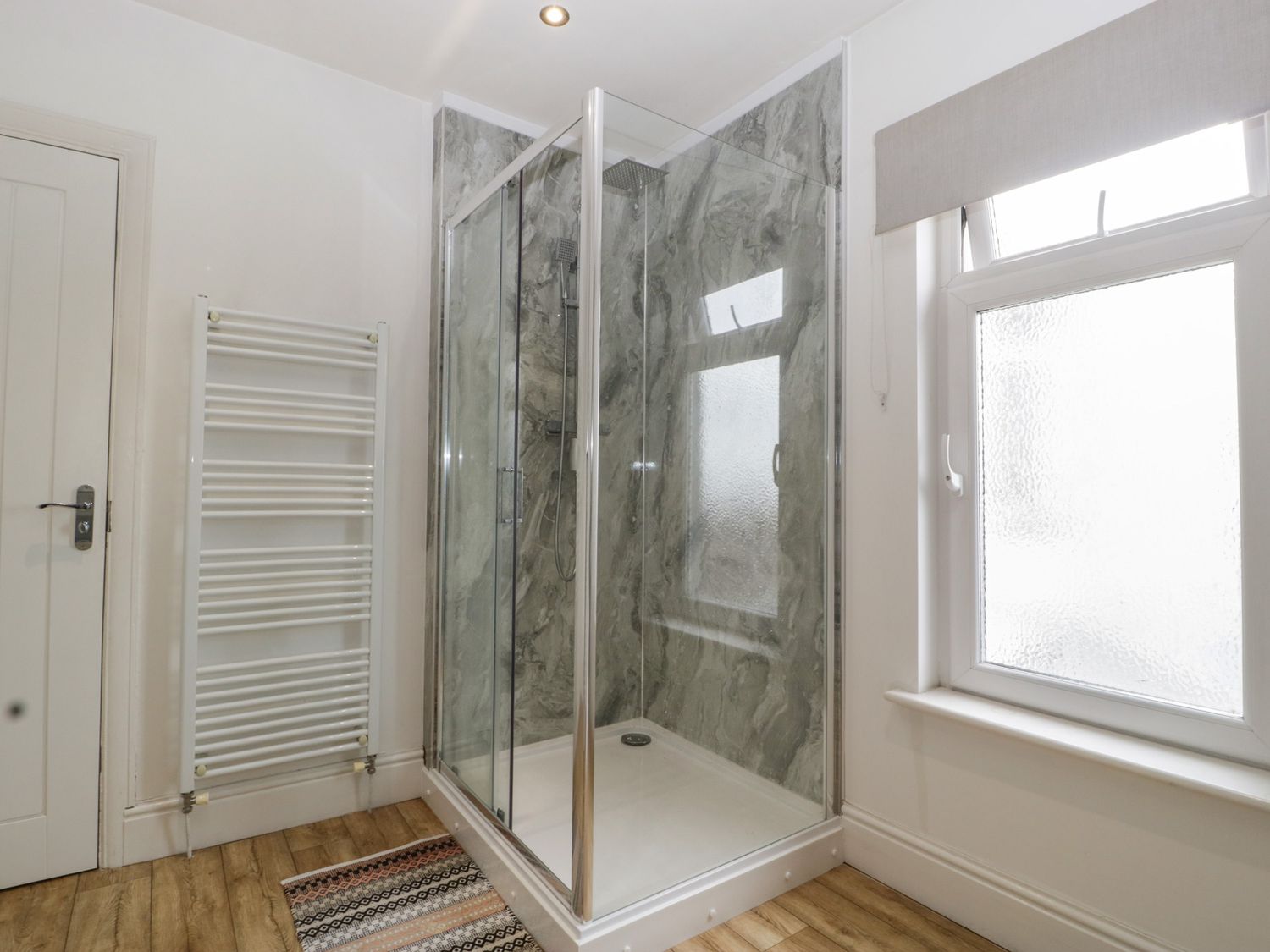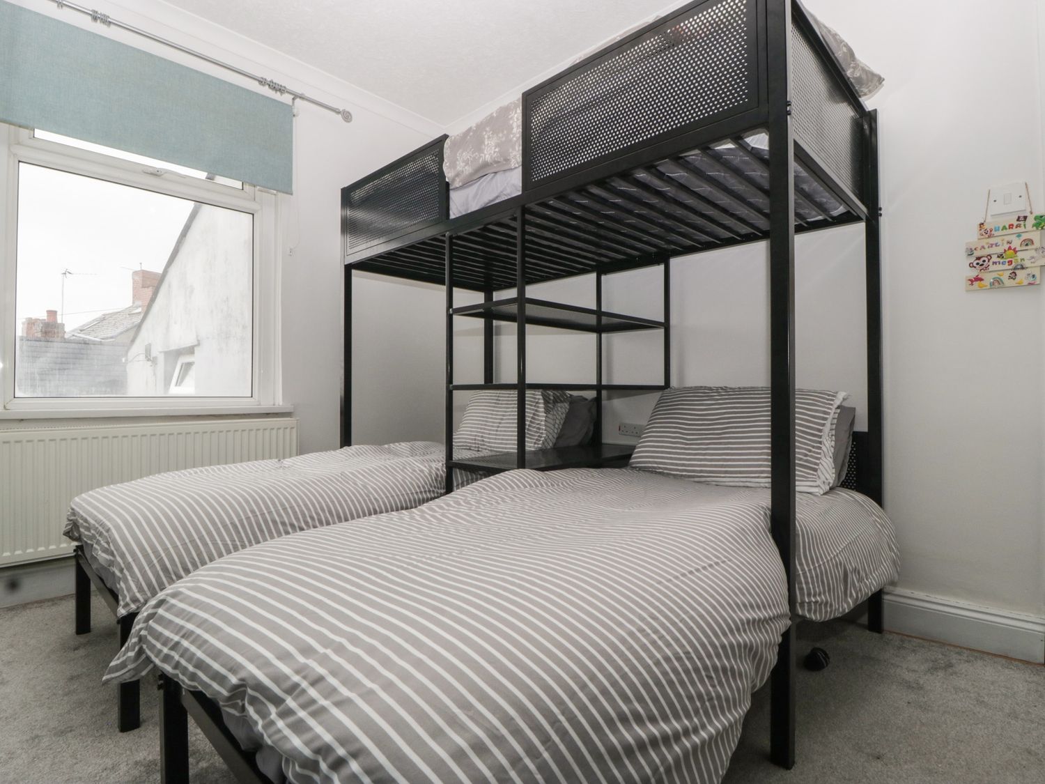 "Two bedrooms: 1 x double, 1 x triple bunk (twin below, single above). Bathroom with bath, walk-in shower, basin and WC. Kitchen. Living/dining room with gas fire."