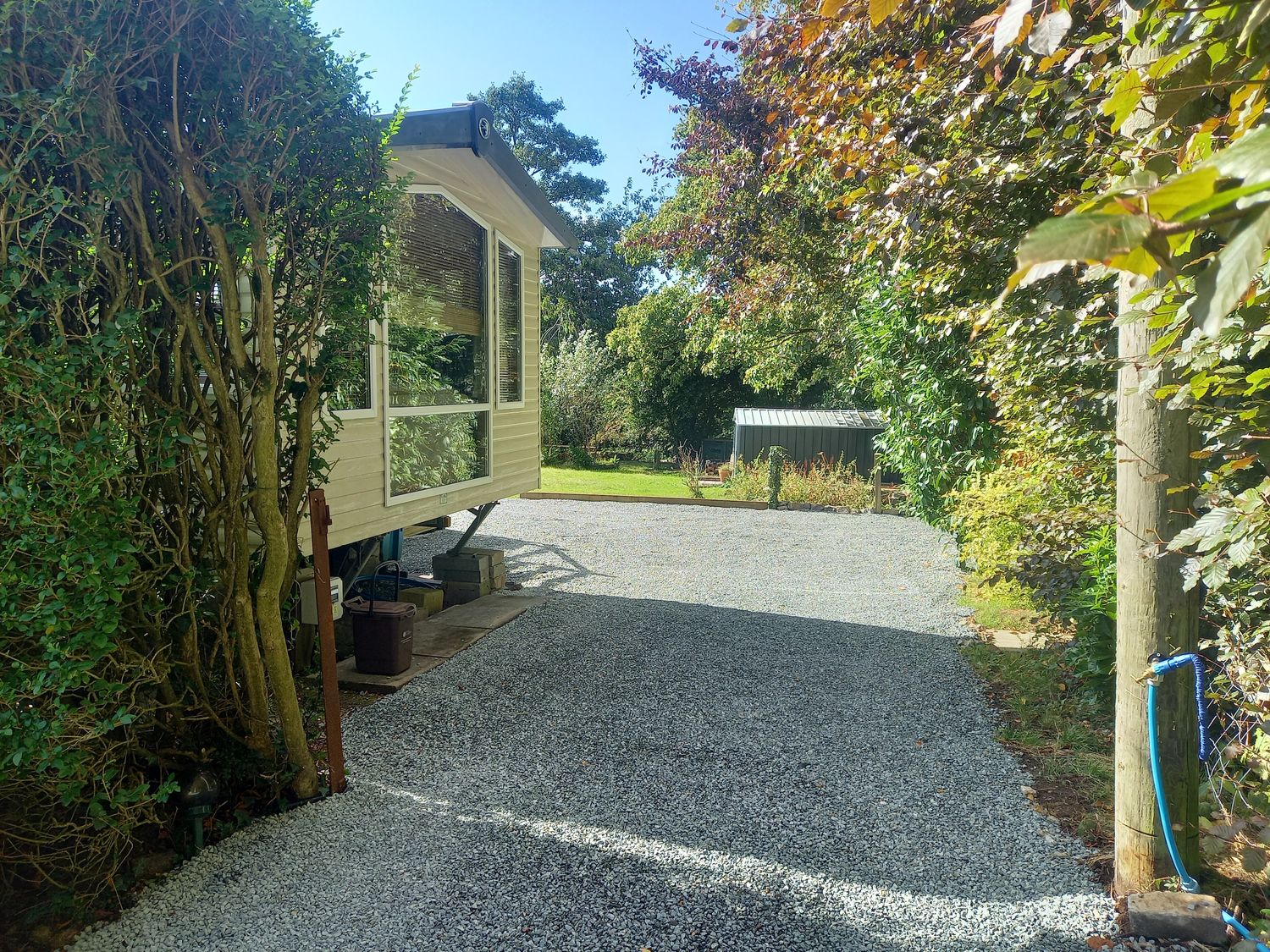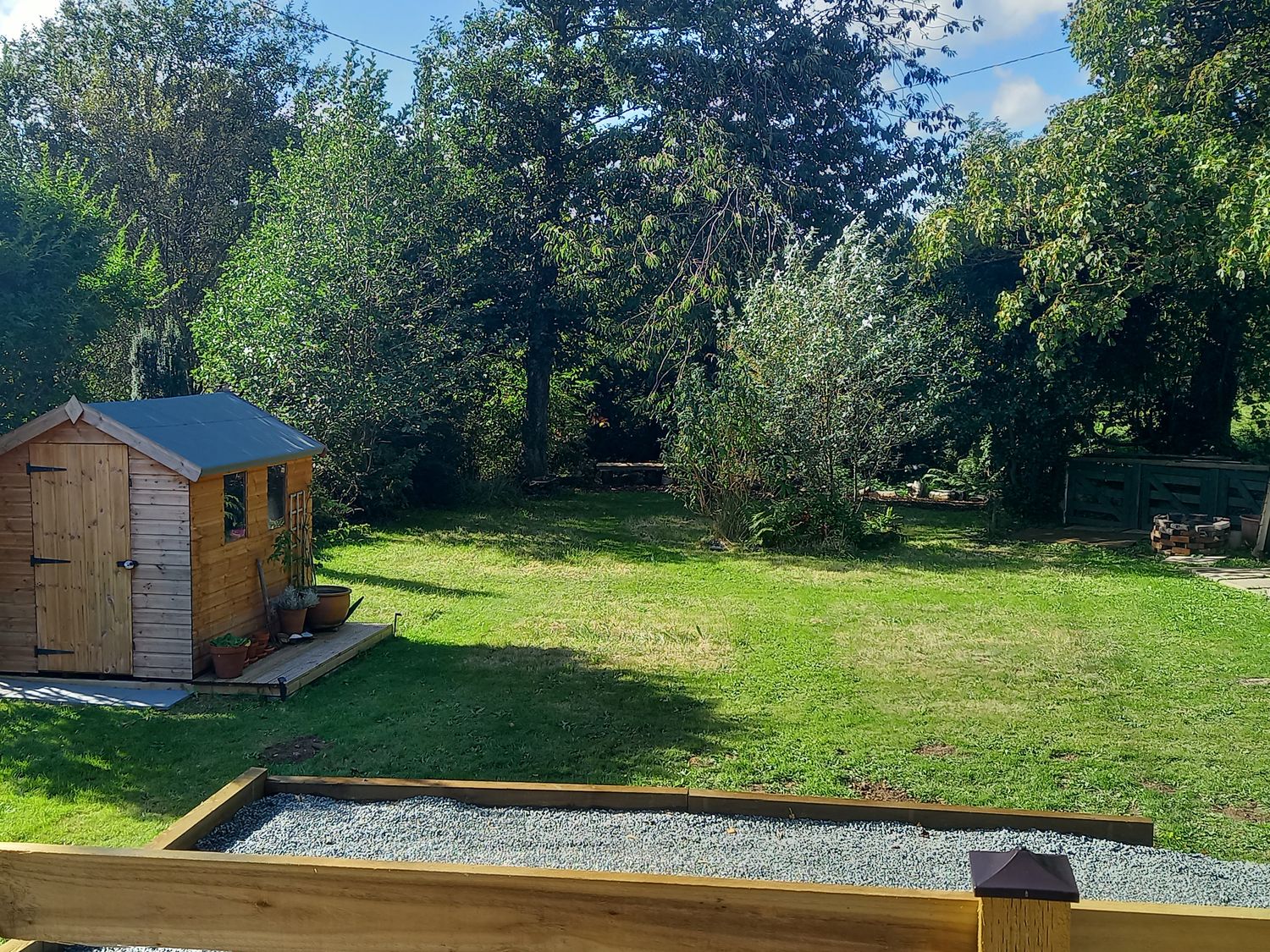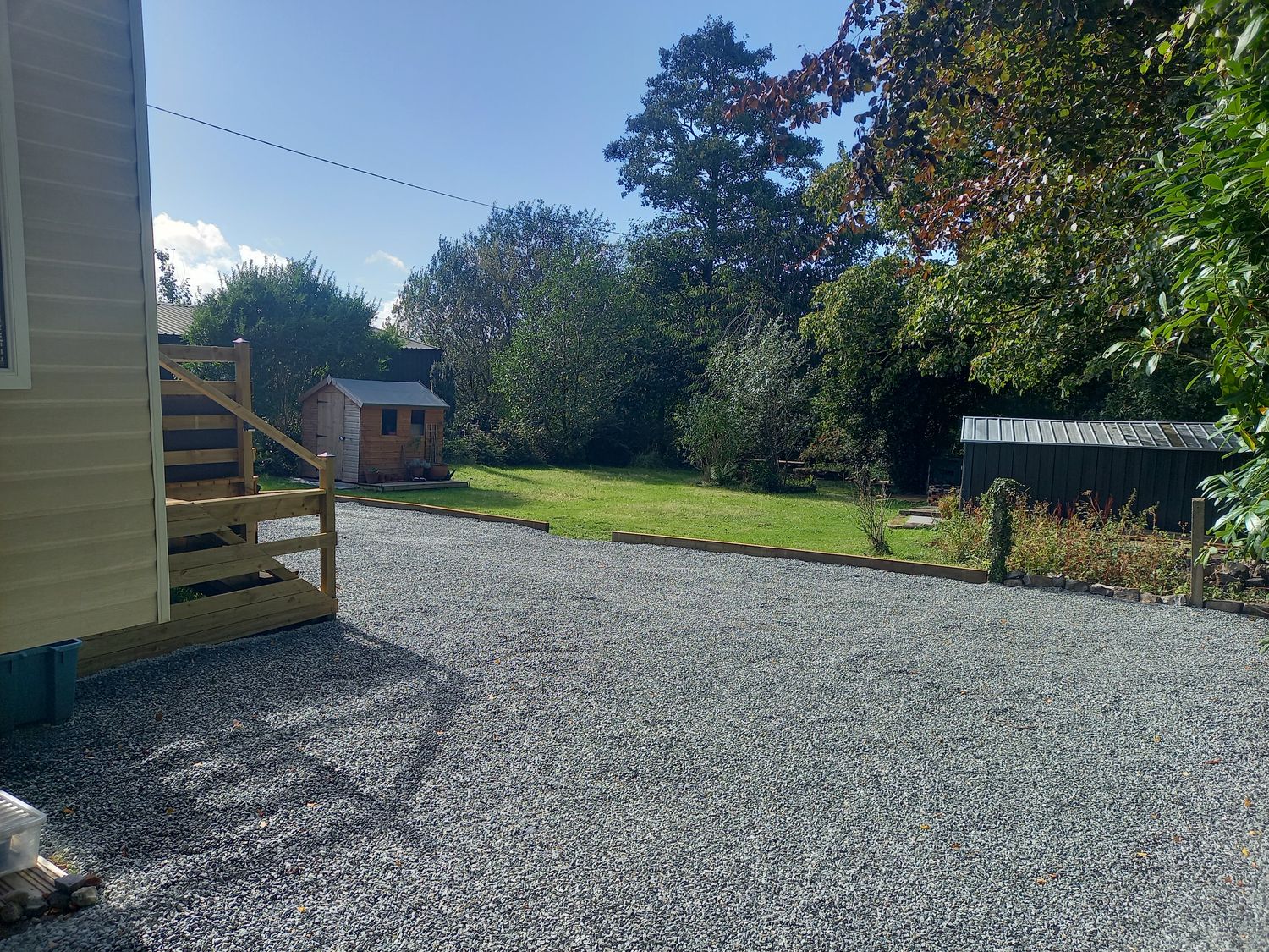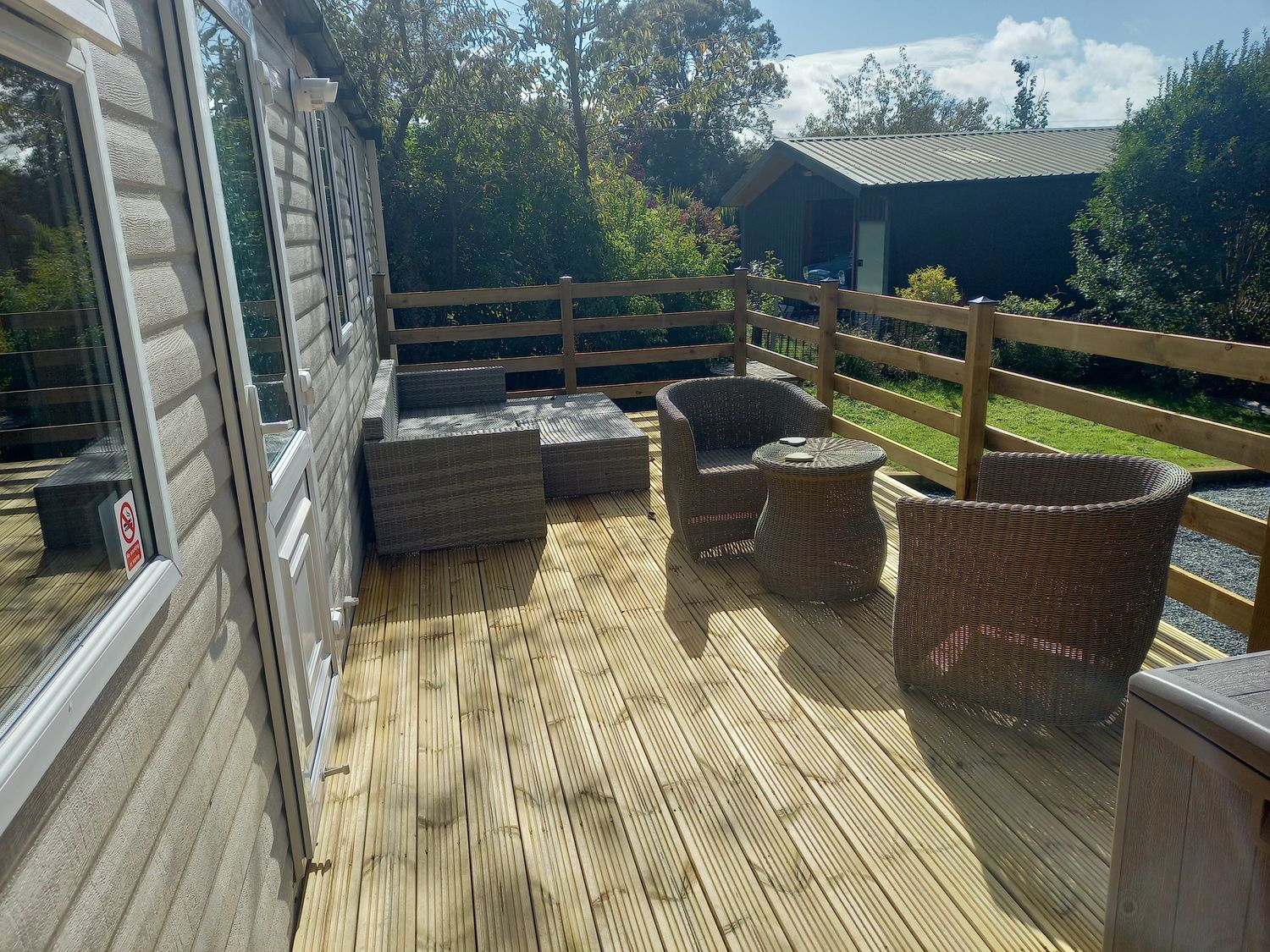 "Emma No.6, a single-storey caravan, consists of a kitchen with gas oven and hob, fridge/ freezer, kettle, and toaster, a dining room with seating for four guests, and a sitting room with electric fire and TV, corner sofa, and sofa. The bedrooms consist of a king-size with en-suite and double. There is a shower room with walk-in shower, basin, and WC. WiFi, fuel, power, bed linen, and towels are included in the rent. Outside, there is a front decking, access to garden with lawn, furniture,and large garden with stream. One well-behaved dog welcome. Sorry, no smoking. Within 0.7 miles you will find a shop, within 2 miles a pub and within 0.4 miles a river. Emma No.6 offers a splendid retreat, whatever time of year. Note: There is a stream at the bottom of the garden with a four-foot drop to it, please take care."