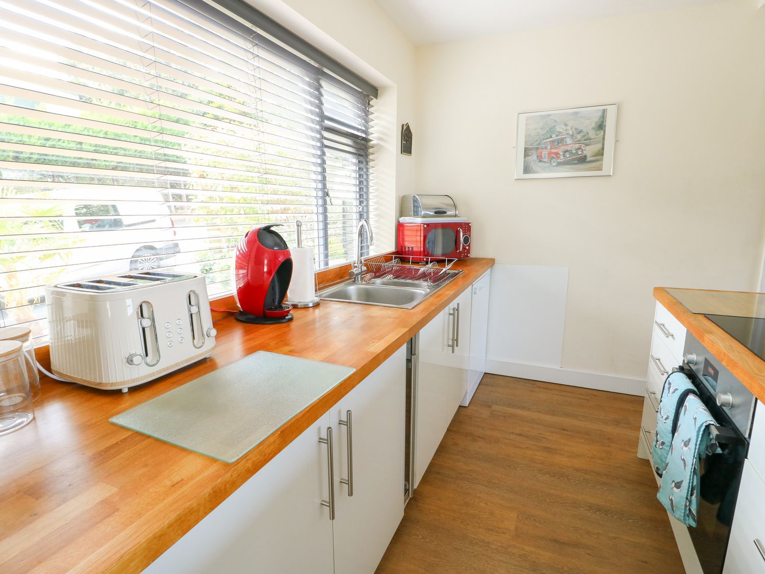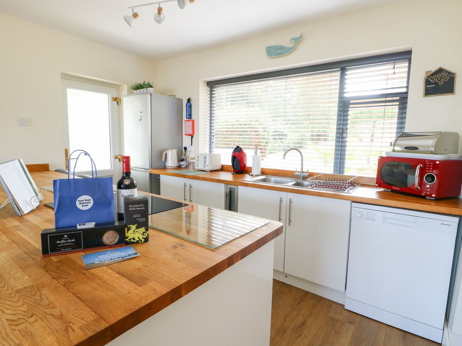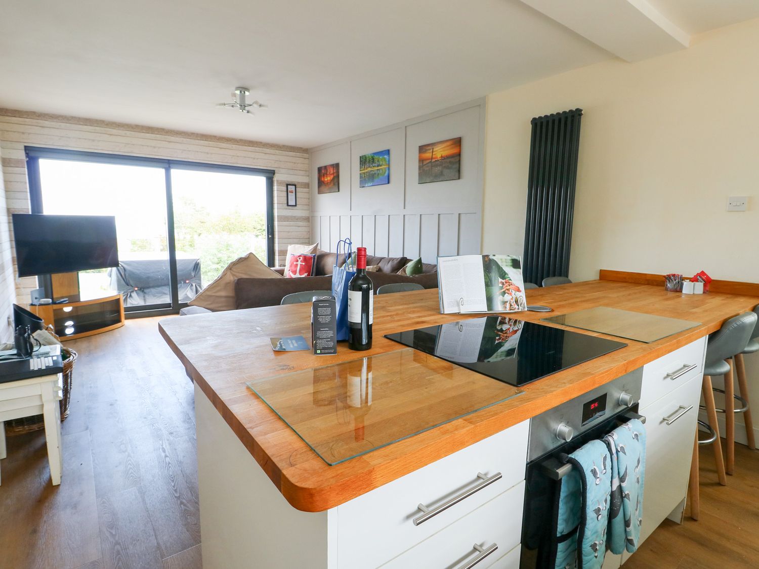 "Single-storey. Three bedrooms: 1 x king-size with en-suite shower, basin, and WC, 1 x king-size with Smart TV, 1 x twin (beds have zip-link so can be made in to a king-size bed on request) with Smart TV. Travel cot with mattress available upon request. Bathroom with bath, shower over, basin, heated towel rail and WC. Open-plan living space with kitchen, dining area and sitting area with multi-burning stove. External utility "
