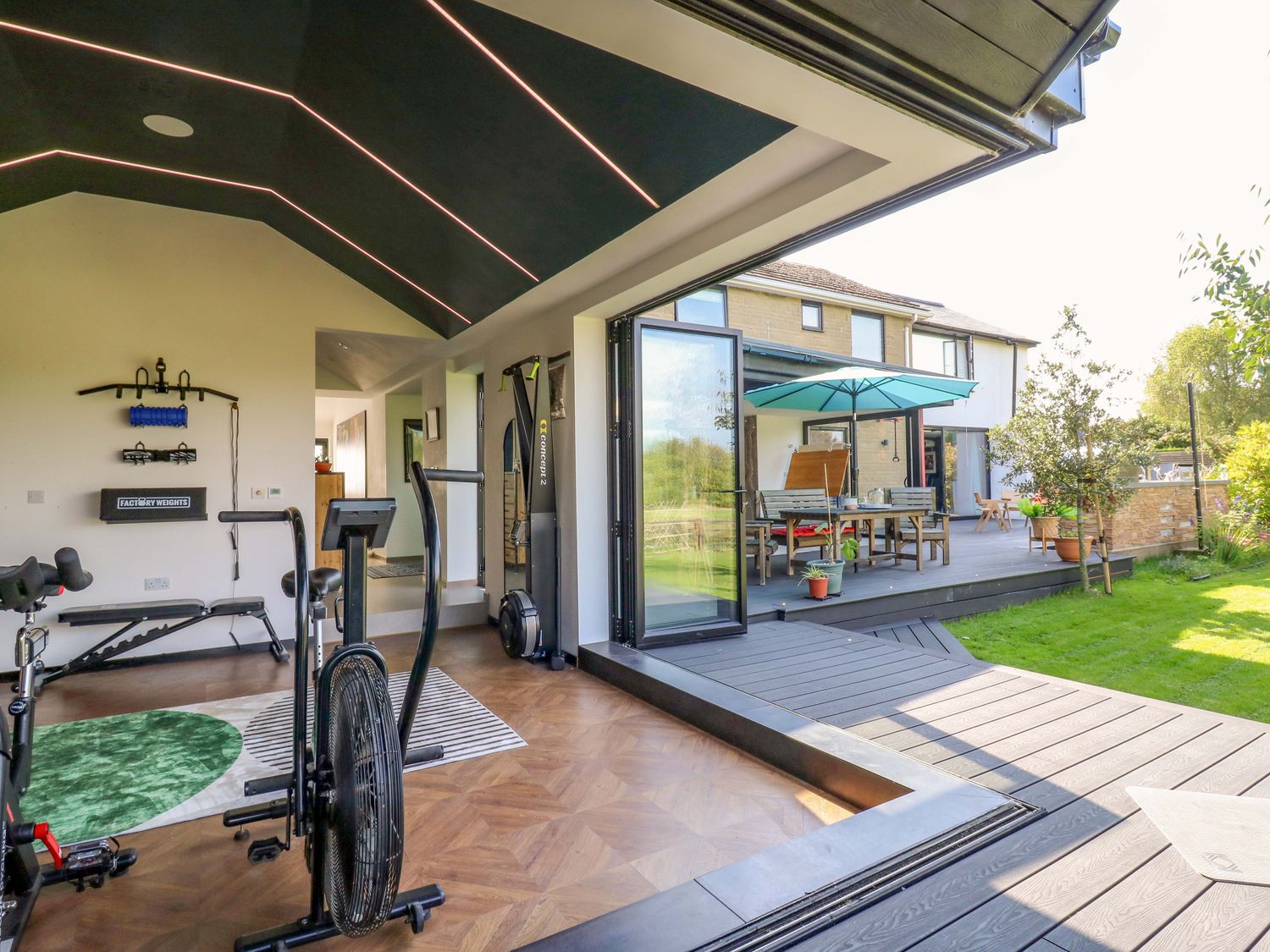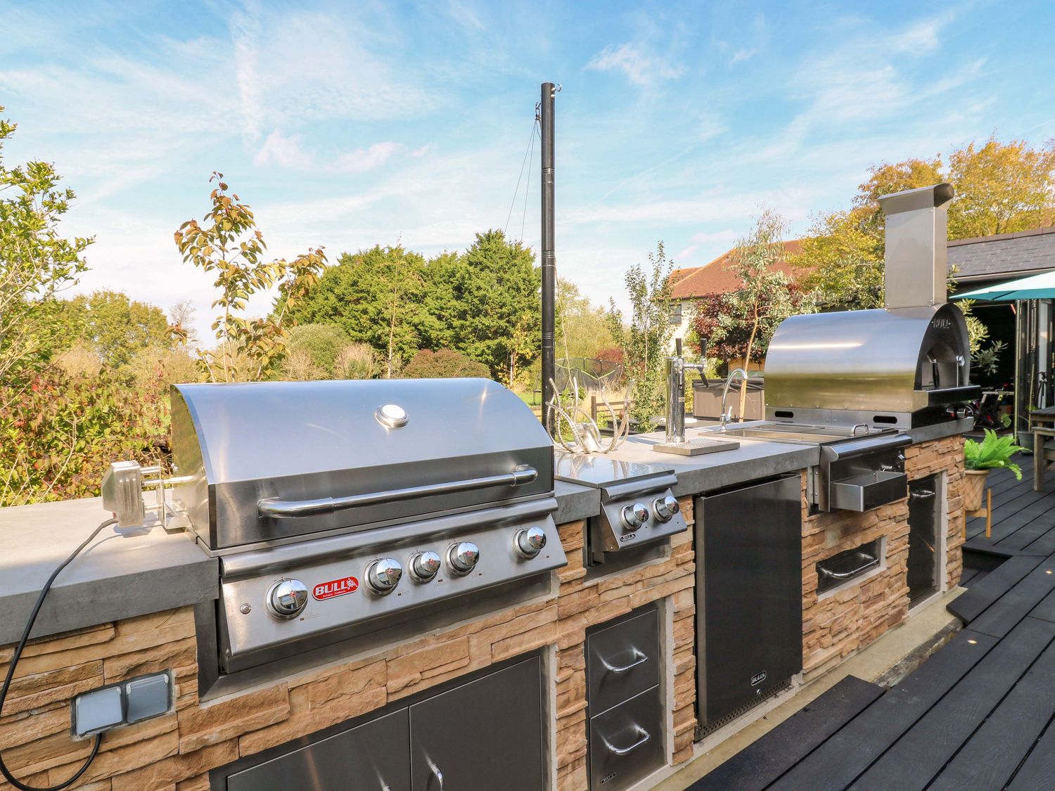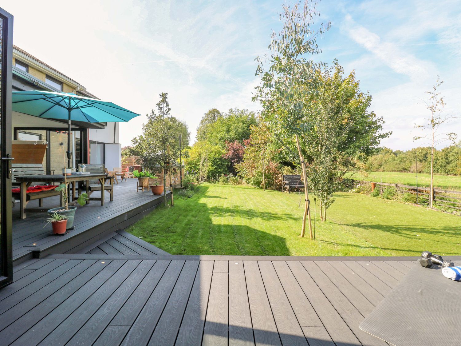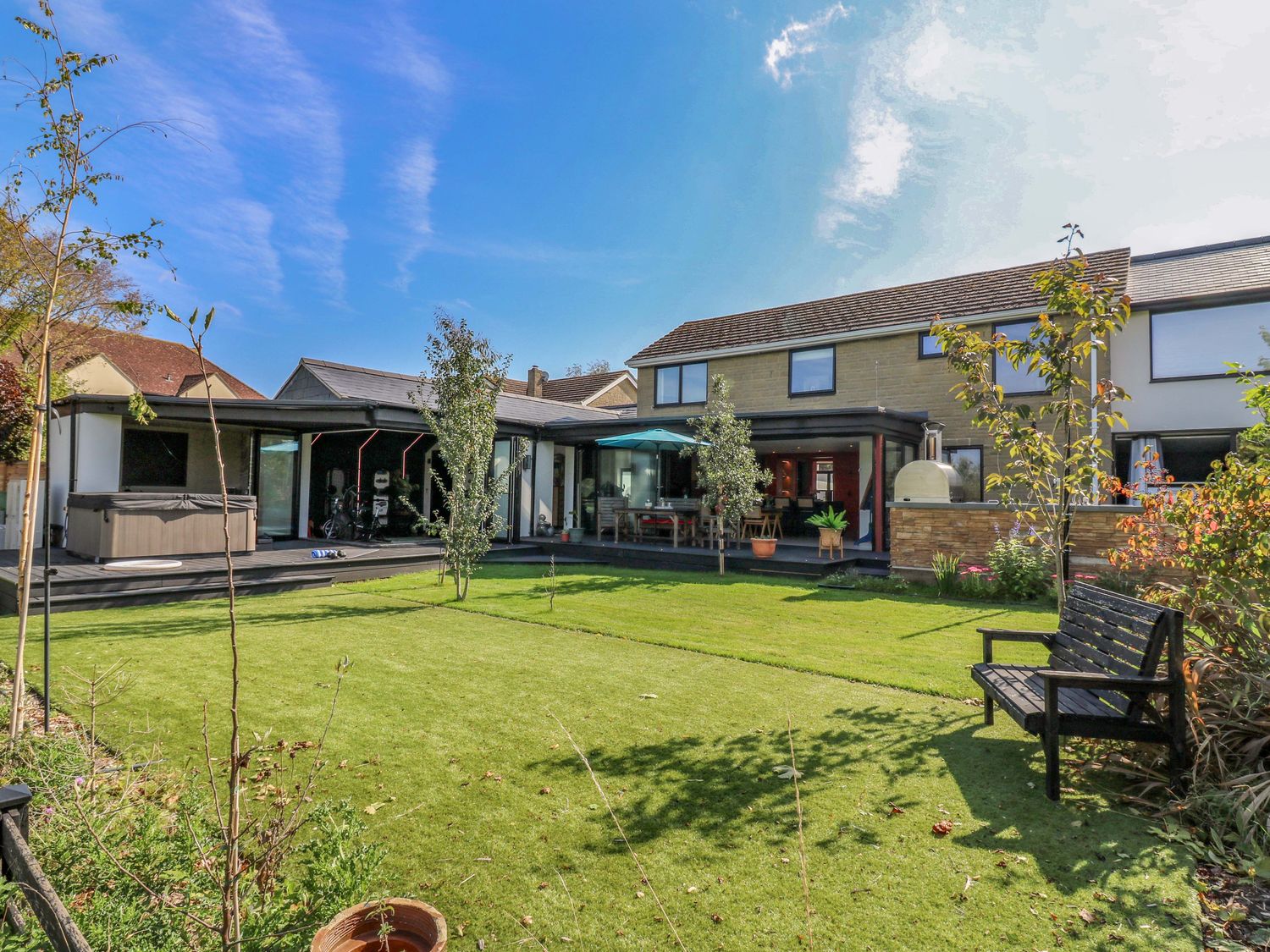 "Manor Farm House, a house consists of a kitchen/diner with electric double oven, electric hob, microwave, fridge/freezer, dishwasher, kitchen island breakfast bar, and dining table for 12, a kitchen with in the annex, a utility with washing machine and tumble dryer, a sitting room with annex, a gym room with gym equipment and sauna, two cloakrooms with basin and golden WC, a study with three armchairs and piano, and a cinema room with cinema sofa, 4k projector, blackout blinds, corner sofa, electric fire, and speakers. The bedrooms consist of a king-size with en-suite, two doubles, double with en-suite, and two ground-floor double with en-suites. There is a bathroom with freestanding bath, walk-in shower, basin, heated towel rail and WC, and a second bathroom all in a Hollywood Hills style. WiFi, fuel, power, bed linen, and towels included in the rent. Outside, there is an enclosed rear garden with decking, furniture, lawn, pizza oven, bar, beer tap, barbecue, hot tub, trampoline and private driveway parking for three cars. One well-behaved pet welcome. Sorry, no smoking. Visit Manor Farm House for your next adventure. Note: Annex connected by a corridor. Note: Pets must stay on the ground floor."