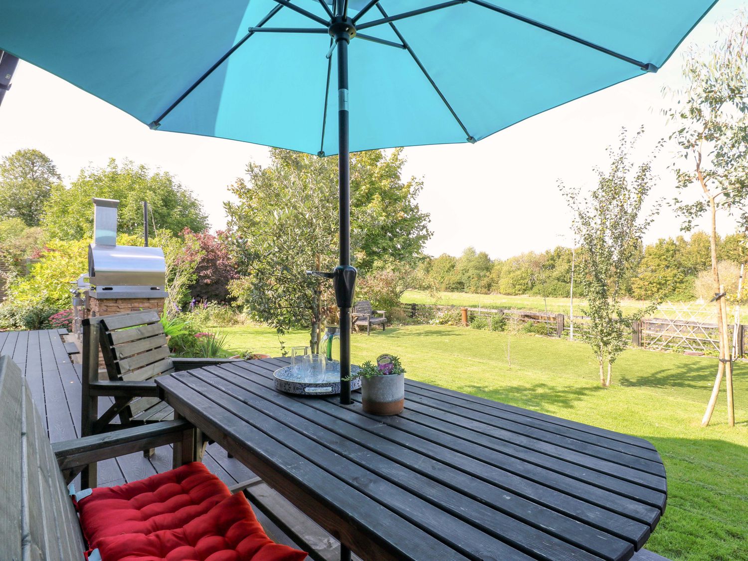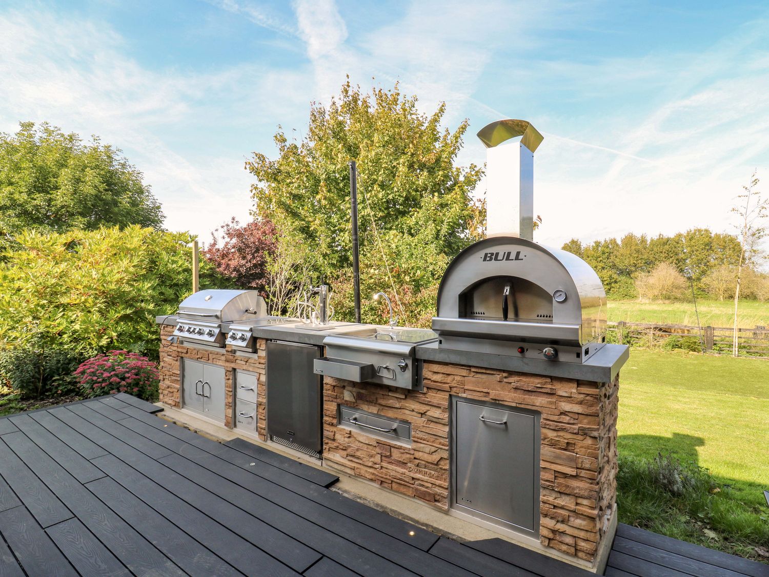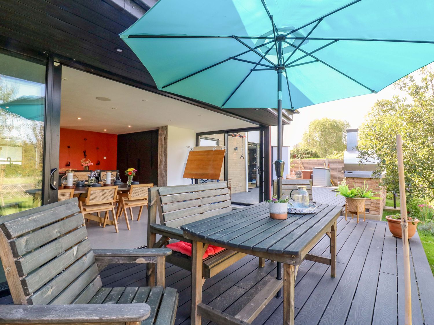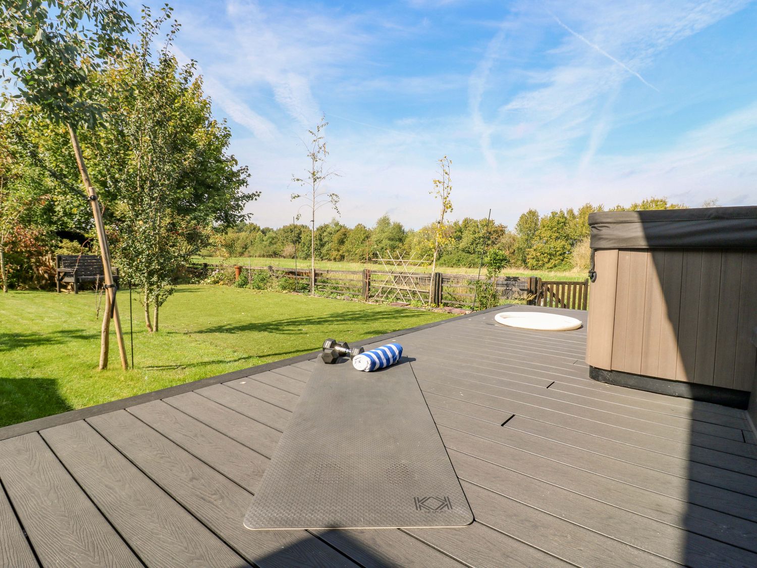 "Manor Farm House, a house consists of a kitchen/diner with electric double oven, electric hob, microwave, fridge/freezer, dishwasher, kitchen island breakfast bar, and dining table for 12, a kitchen with in the annex, a utility with washing machine and tumble dryer, a sitting room with annex, a gym room with gym equipment and sauna, two cloakrooms with basin and golden WC, a study with three armchairs and piano, and a cinema room with cinema sofa, 4k projector, blackout blinds, corner sofa, electric fire, and speakers. The bedrooms consist of a king-size with en-suite, two doubles, double with en-suite, and two ground-floor double with en-suites. There is a bathroom with freestanding bath, walk-in shower, basin, heated towel rail and WC, and a second bathroom all in a Hollywood Hills style. WiFi, fuel, power, bed linen, and towels included in the rent. Outside, there is an enclosed rear garden with decking, furniture, lawn, pizza oven, bar, beer tap, barbecue, hot tub, trampoline and private driveway parking for three cars. One well-behaved pet welcome. Sorry, no smoking. Visit Manor Farm House for your next adventure. Note: Annex connected by a corridor. Note: Pets must stay on the ground floor."