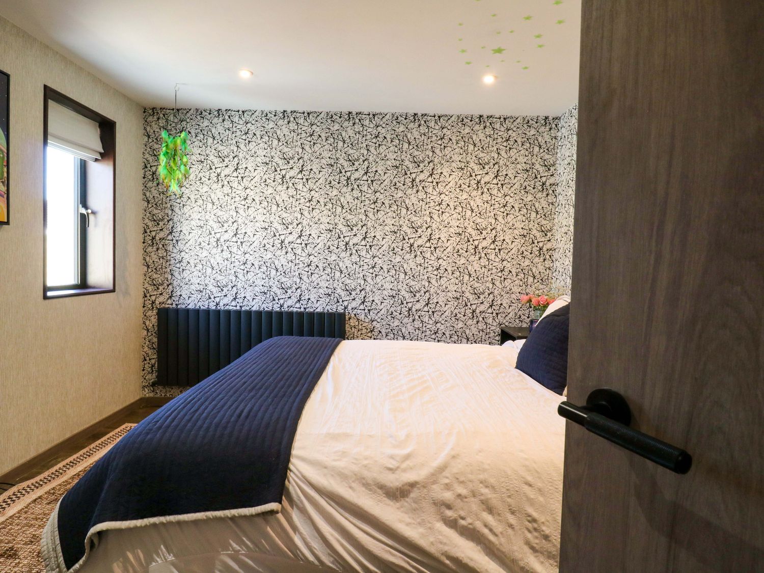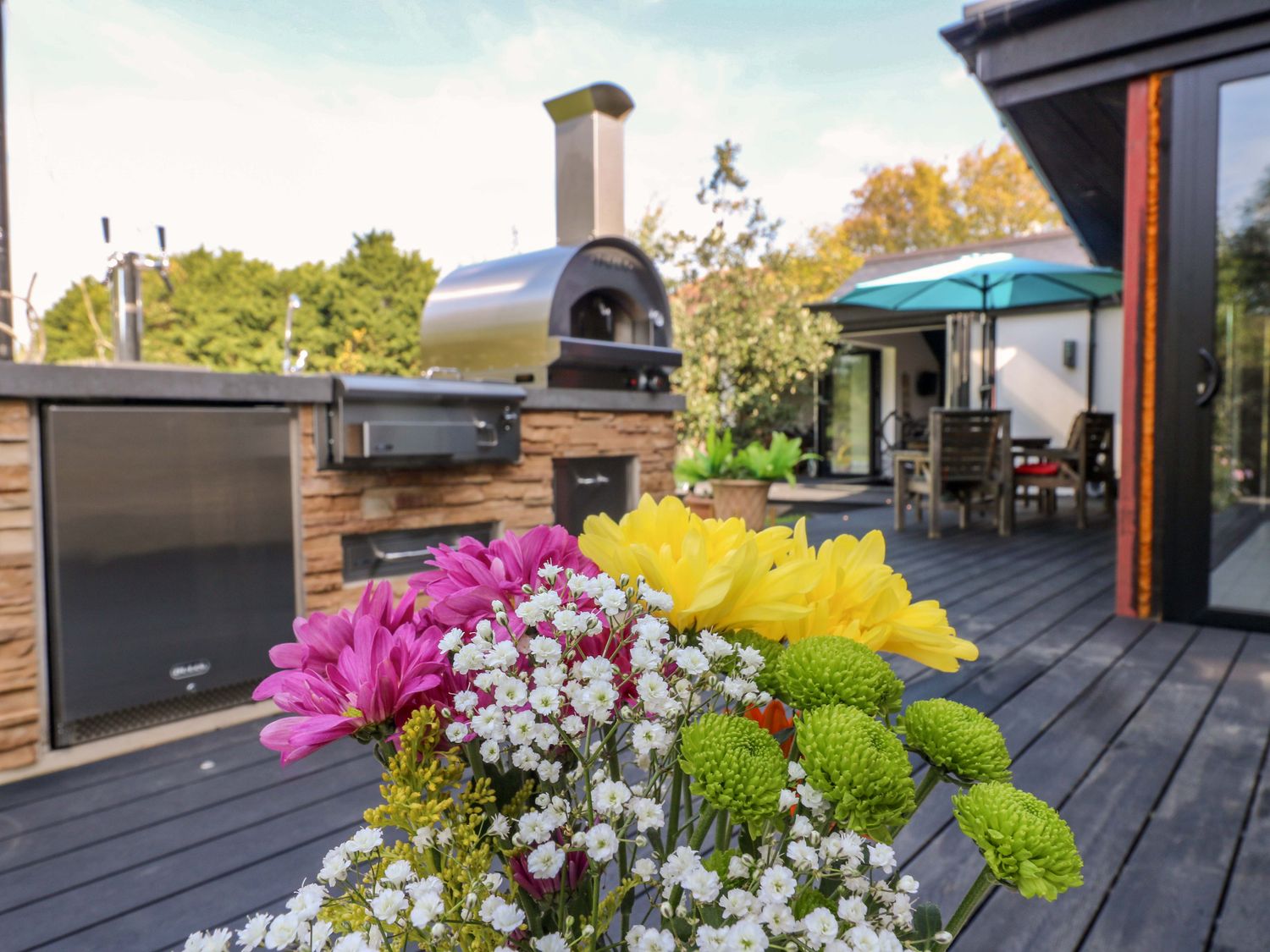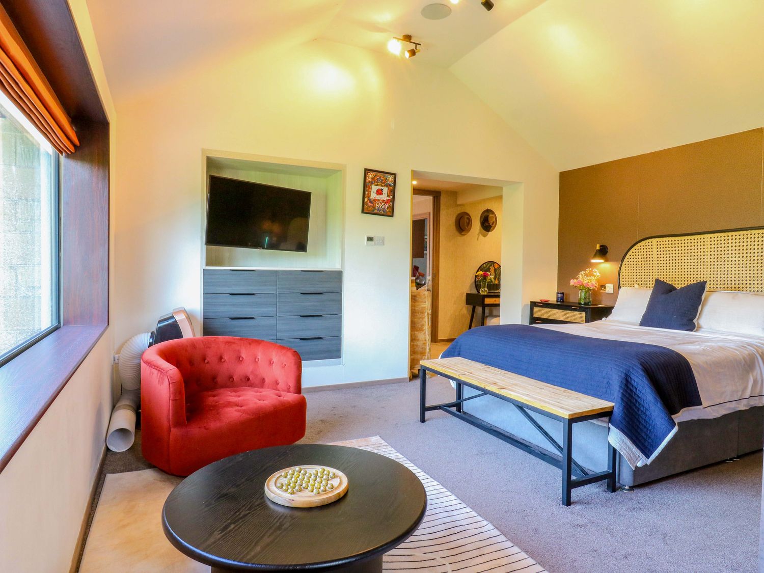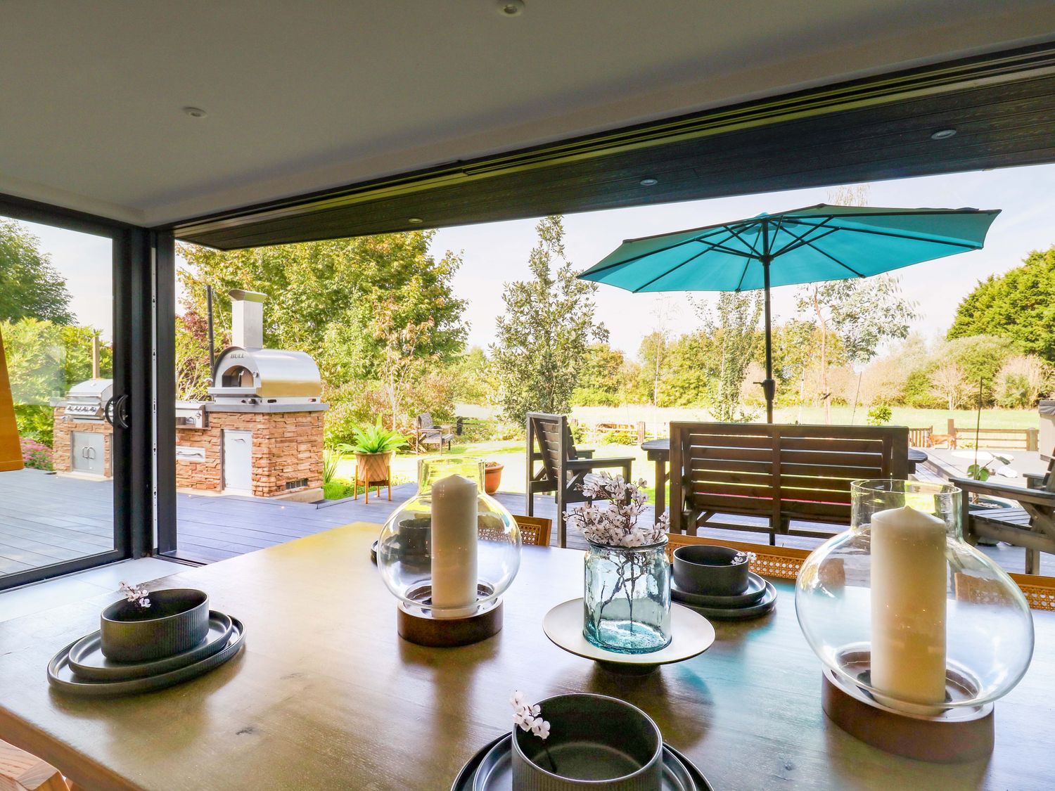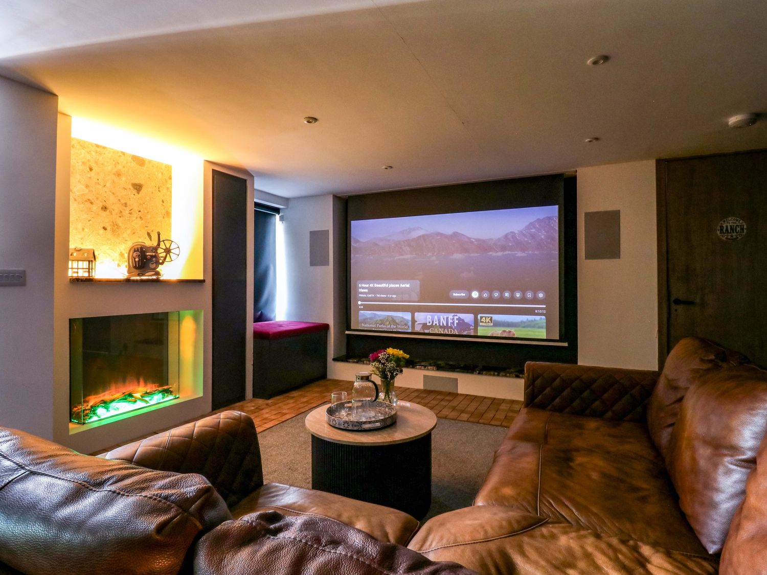 "Manor Farm House, a house consists of a kitchen/diner with electric double oven, electric hob, microwave, fridge/freezer, dishwasher, kitchen island breakfast bar, and dining table for 12, a kitchen with in the annex, a utility with washing machine and tumble dryer, a sitting room with annex, a gym room with gym equipment and sauna, two cloakrooms with basin and golden WC, a study with three armchairs and piano, and a cinema room with cinema sofa, 4k projector, blackout blinds, corner sofa, electric fire, and speakers. The bedrooms consist of a king-size with en-suite, two doubles, double with en-suite, and two ground-floor double with en-suites. There is a bathroom with freestanding bath, walk-in shower, basin, heated towel rail and WC, and a second bathroom all in a Hollywood Hills style. WiFi, fuel, power, bed linen, and towels included in the rent. Outside, there is an enclosed rear garden with decking, furniture, lawn, pizza oven, bar, beer tap, barbecue, hot tub, trampoline and private driveway parking for three cars. One well-behaved pet welcome. Sorry, no smoking. Visit Manor Farm House for your next adventure. Note: Annex connected by a corridor. Note: Pets must stay on the ground floor."