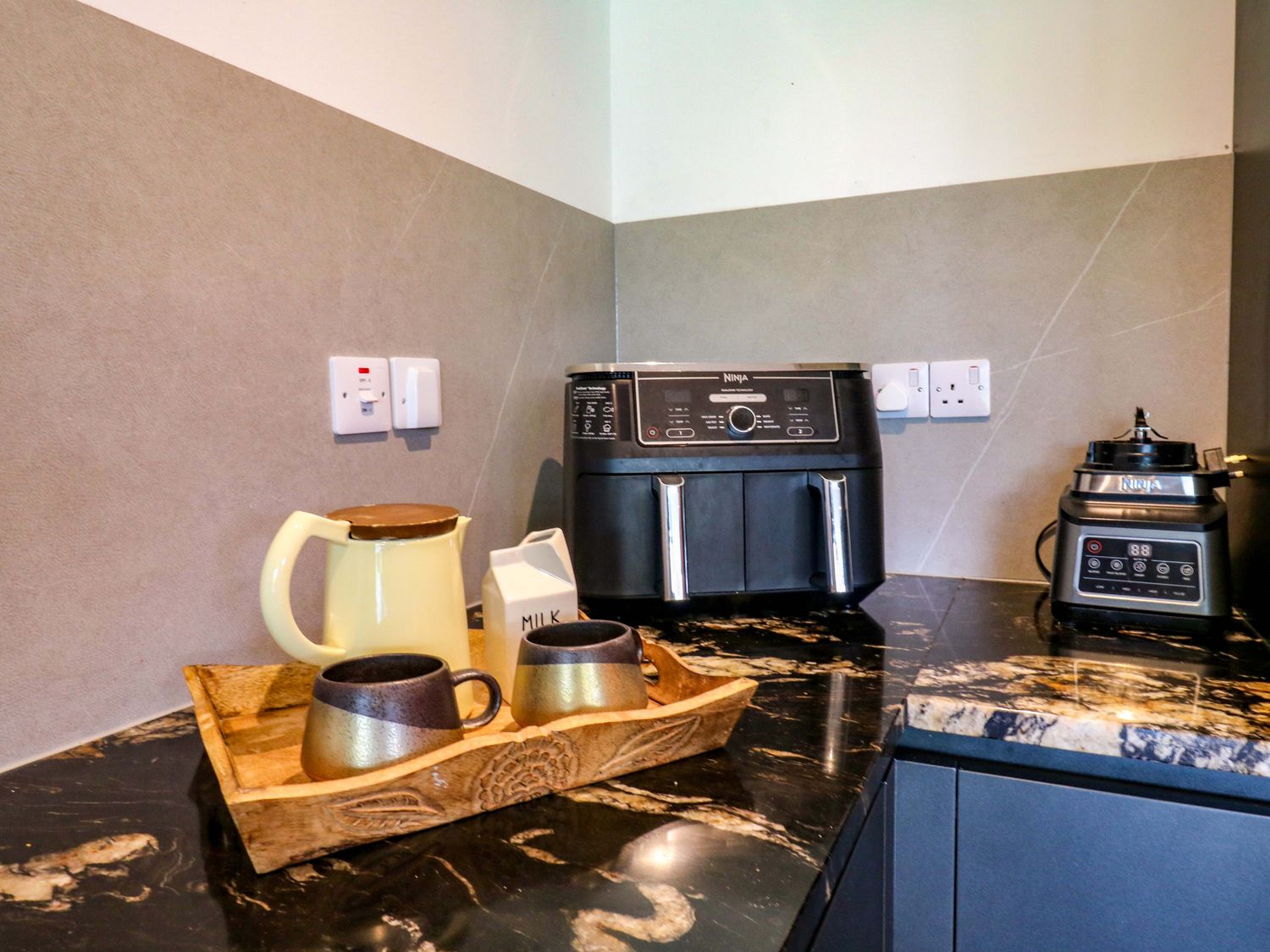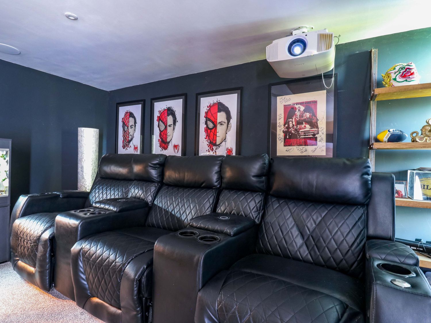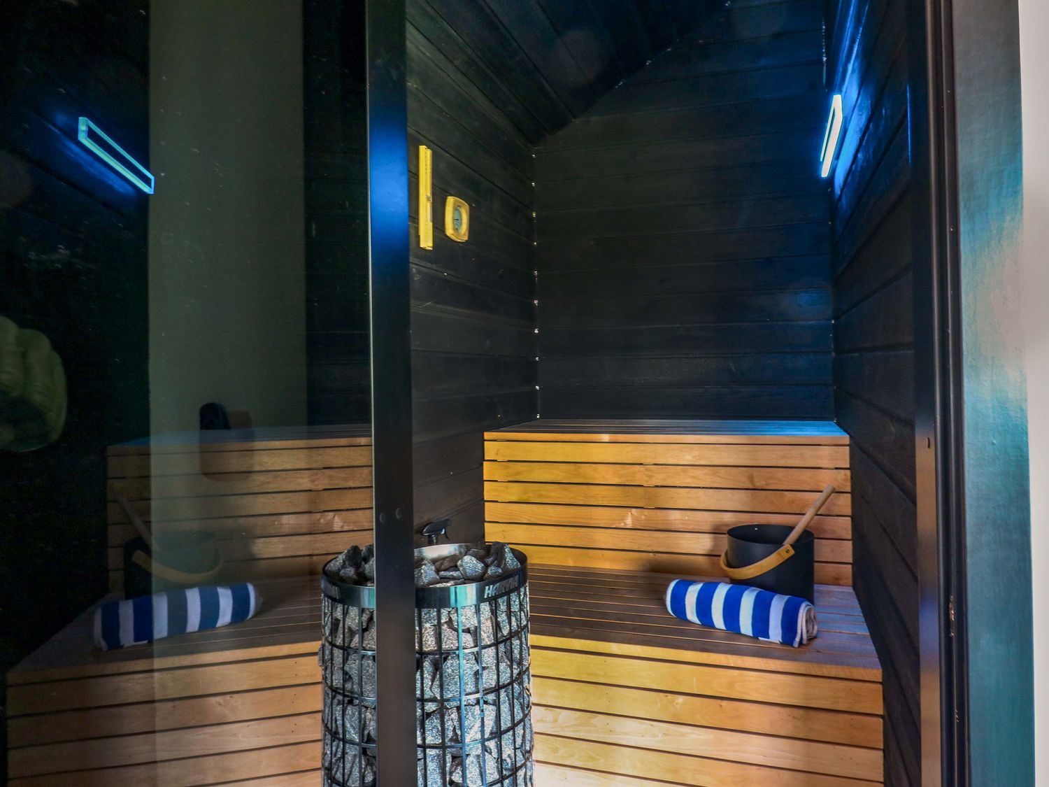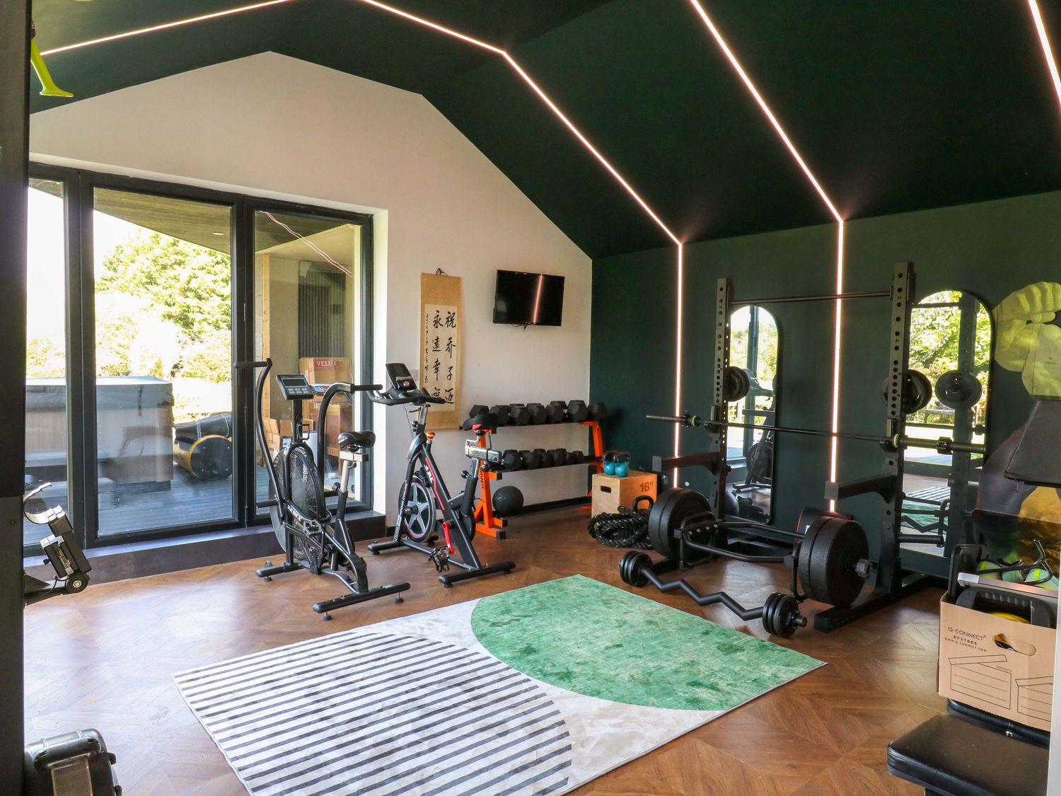 "Manor Farm House, a house consists of a kitchen/diner with electric double oven, electric hob, microwave, fridge/freezer, dishwasher, kitchen island breakfast bar, and dining table for 12, a kitchen with in the annex, a utility with washing machine and tumble dryer, a sitting room with annex, a gym room with gym equipment and sauna, two cloakrooms with basin and golden WC, a study with three armchairs and piano, and a cinema room with cinema sofa, 4k projector, blackout blinds, corner sofa, electric fire, and speakers. The bedrooms consist of a king-size with en-suite, two doubles, double with en-suite, and two ground-floor double with en-suites. There is a bathroom with freestanding bath, walk-in shower, basin, heated towel rail and WC, and a second bathroom all in a Hollywood Hills style. WiFi, fuel, power, bed linen, and towels included in the rent. Outside, there is an enclosed rear garden with decking, furniture, lawn, pizza oven, bar, beer tap, barbecue, hot tub, trampoline and private driveway parking for three cars. One well-behaved pet welcome. Sorry, no smoking. Visit Manor Farm House for your next adventure. Note: Annex connected by a corridor. Note: Pets must stay on the ground floor."