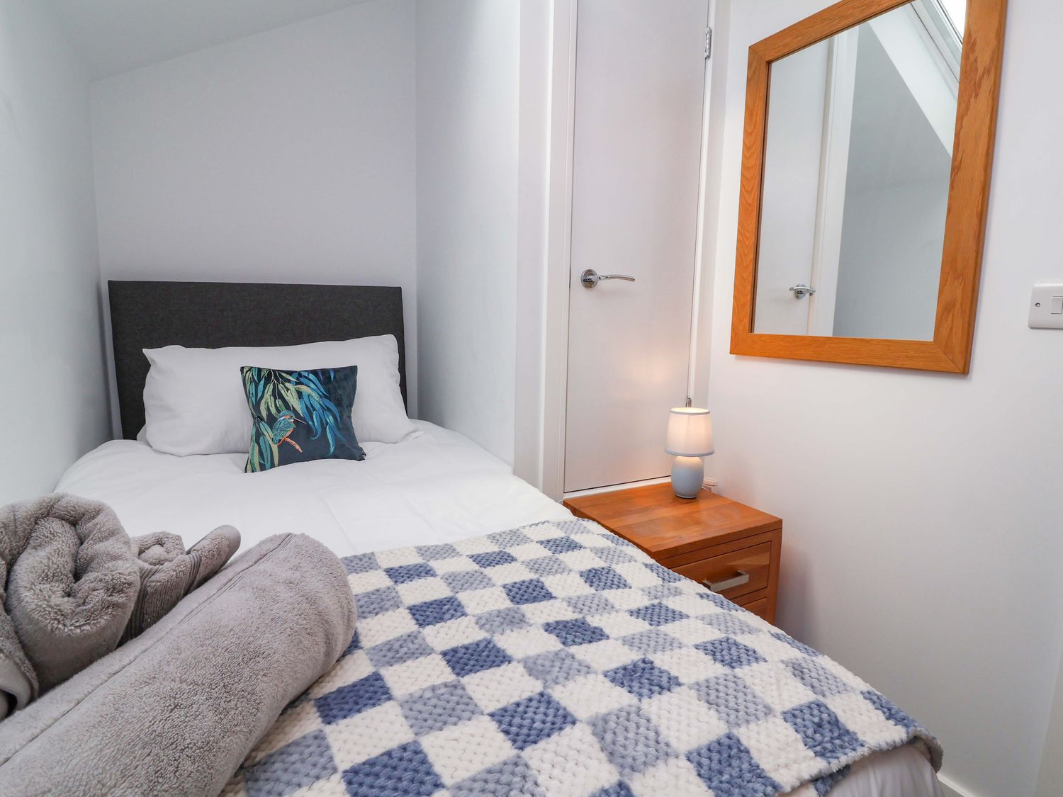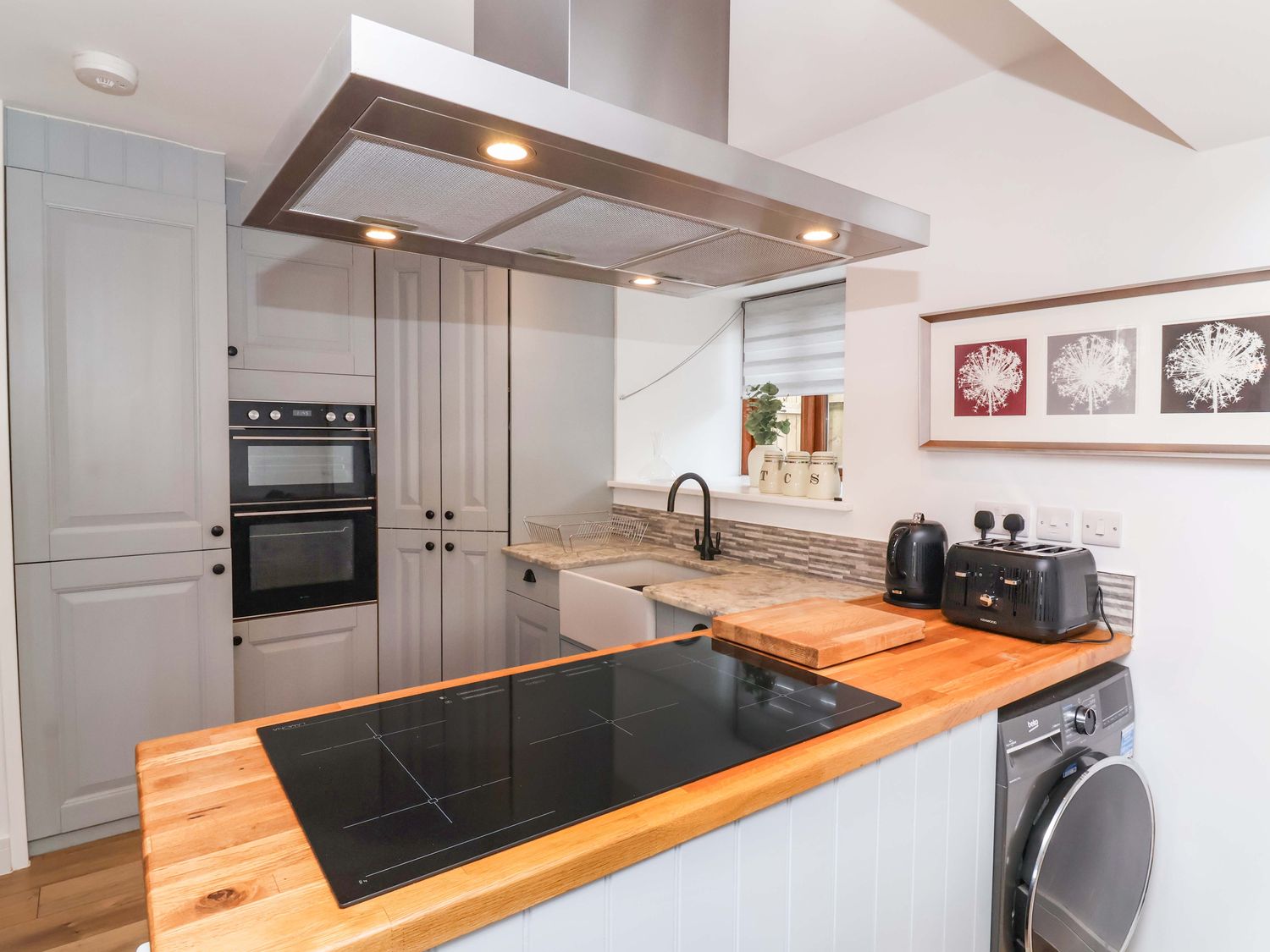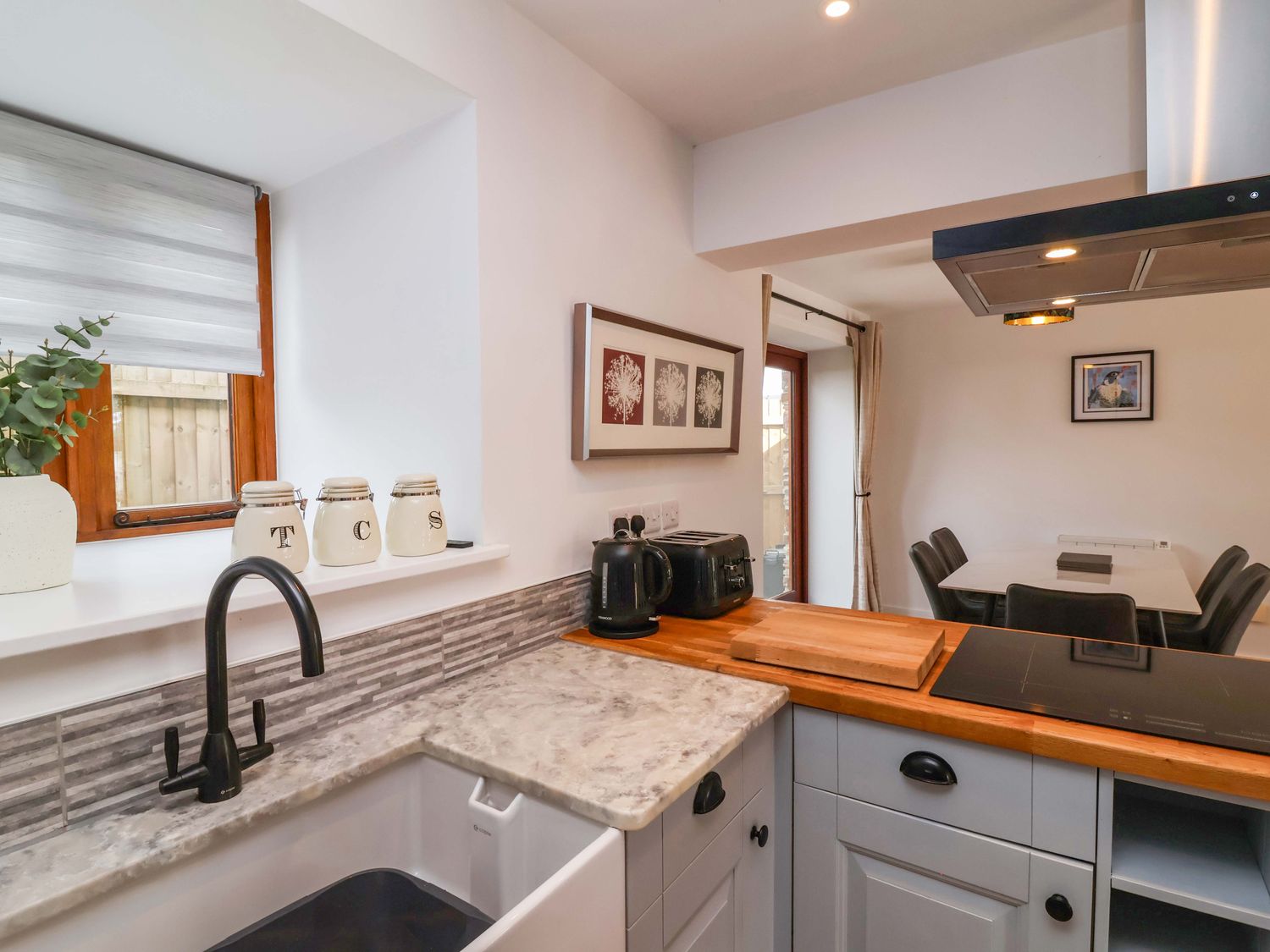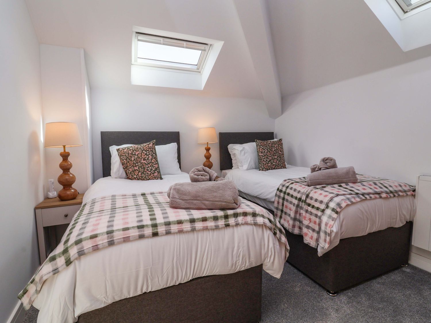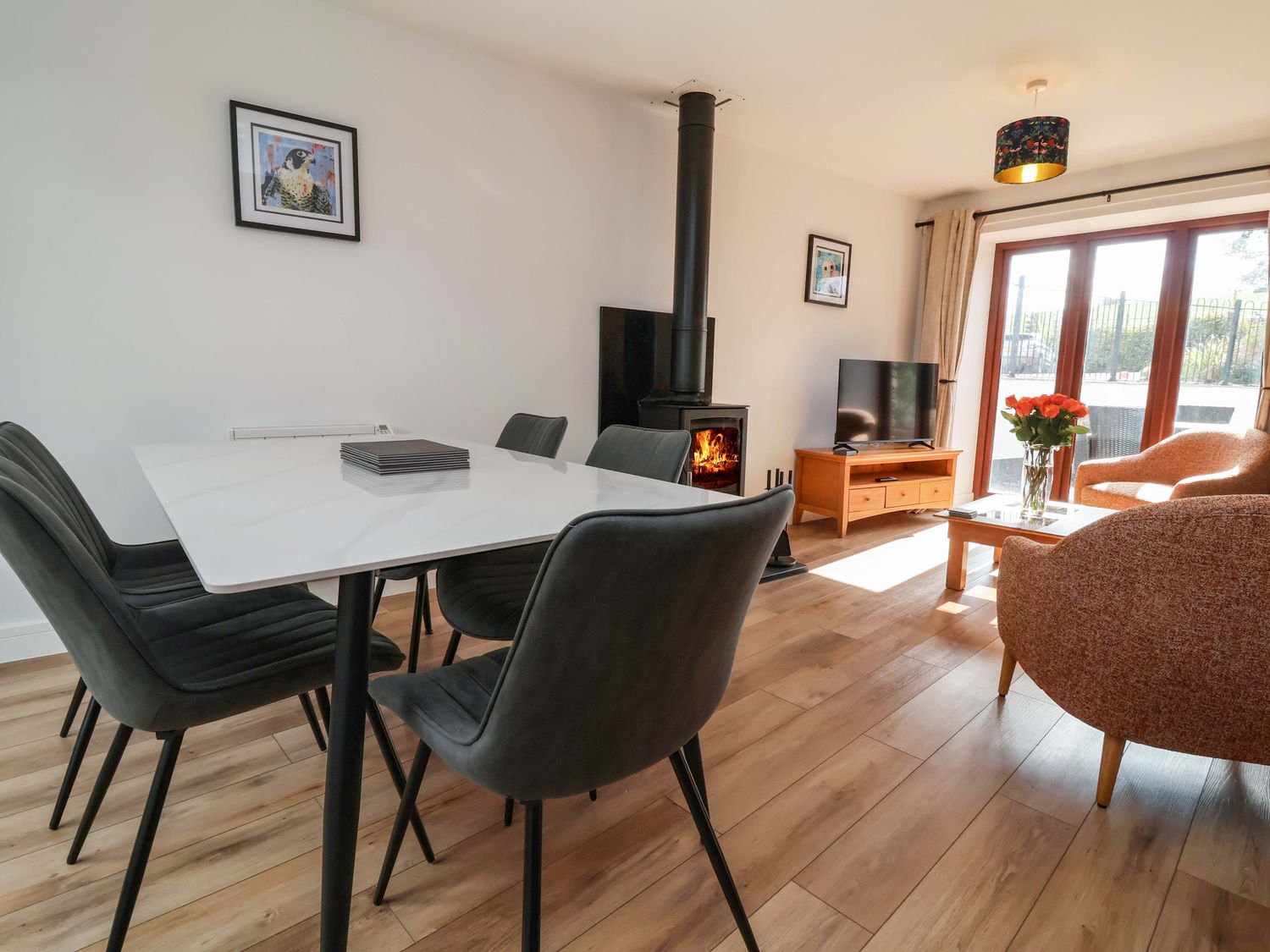 "Three bedrooms: 1 x king-size, 1 x twin, 1 x single. Shower room with walk-in shower, basin and WC. Open-plan living space with kitchen, dining area and sitting area with woodburning stove