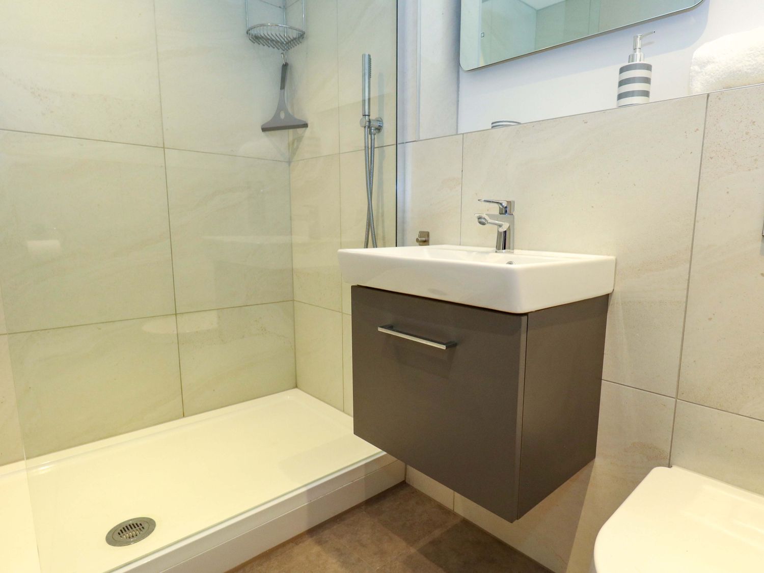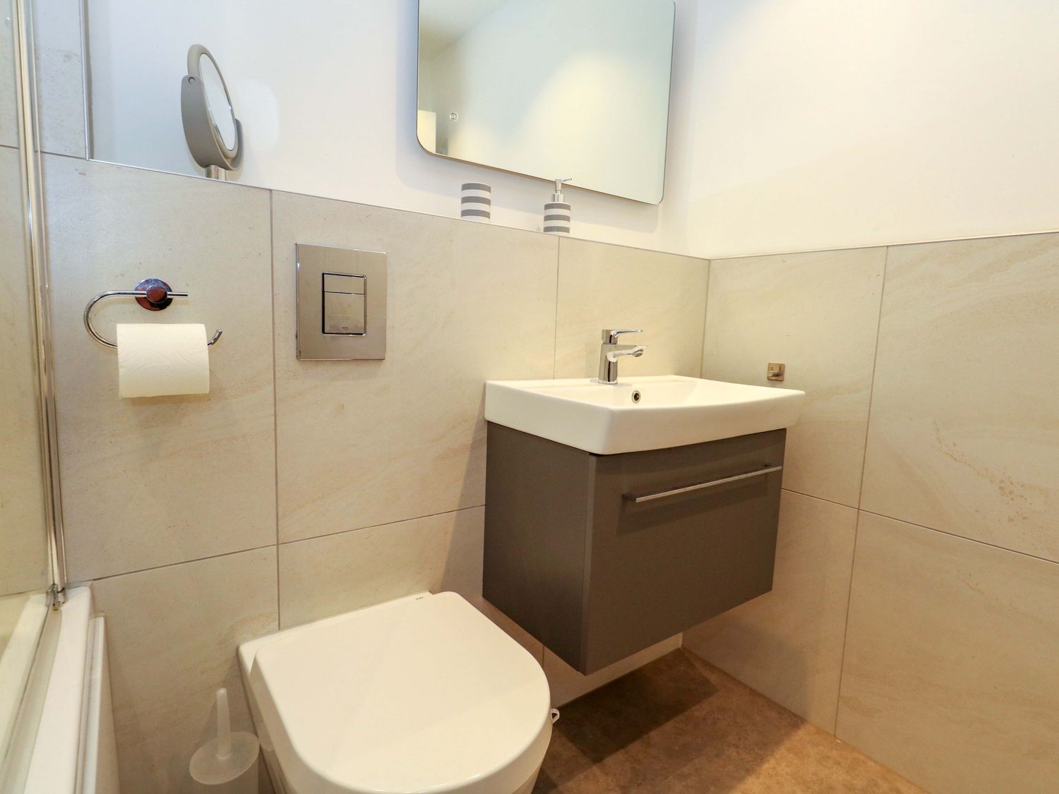 "Second-floor apartment. Two bedrooms: 1 x double with en-suite with walk-in shower and basin and WC, 1 x twin. Bathroom with bath, shower over, basin, WC. Kitchen. Living/dining room"