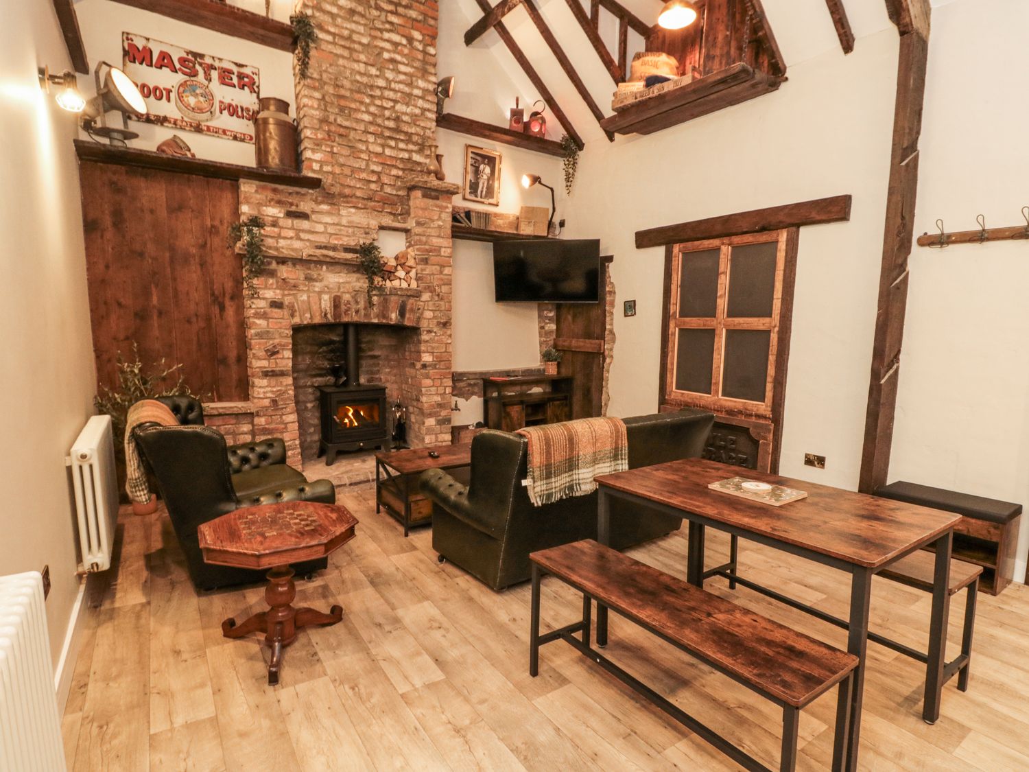 "First-floor apartment. Double mezzanine with TV. Bathroom with bath, shower over, basin and WC. Open-plan living space with kitchen, dining area, and sitting area with woodburning stove"