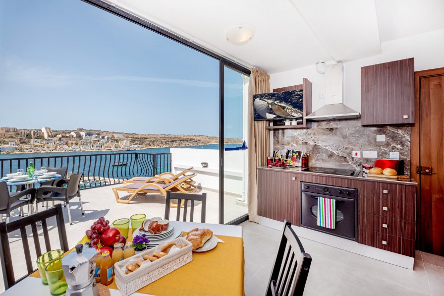 This lovely penthouse has a very large outside terrace with BBQ and enchanting sea views. It is located right in front of the sea and promenade in St Paul's Bay. The penthouse is located in a block of self-catering holiday apartments (penthouse, and 2 bedrooms flats), that enjoys the reflections in the sea of the lights of opposite Xemxija coast. Thus we named it Harbour Lights! The building is served with lift. The apartment has 3 terraces. The largest terrace is 5m x 3m, overlooks the bay and is ideal to sunbathe, have breakfast, lunch, romantic dinner or simply relax over a glass of wine while enjoying the nice sea view. Please refer to the Photos and the Video to see the magnificent view there is from this terrace which is furnished with garden furniture and a gas BBQ set. The second largest terrace is 3mx1m and faces Southeast. Thus this terrace is ideal for a couple to have breakfast and enjoy some morning sun. The smallest terrace is used for the washing machine and is covered to allow the clothes to dry away from our hot sun and rarely rain. This new penthouse has one double bedroom with en-suite bathroom and a kitchen dining living. In this room, there are 2 sofa beds which can accommodate another couple as they can easily be turned into a double bed with a normal mattress. Cots and high chair for children are available on request. The kitchen is fully equipped and the apartment also has a fully automatic washing machine. Fast unlimited WiFi internet in all the rooms and IPTV with hundreds of Channels in different languages. Both are free of charge. All doors and windows have screens to keep out insects, so you can enjoy the fresh sea breeze without worries. Towels and bed sheets are also provided. It is very relaxing and romantic to sit on the terrace or on the balcony to enjoy dinner facing the sea and at the same time watch the sunset. Some additional information: • 24-hour check-in available • No smoking inside the flat. • No "Lost and Found" partygoers • No parties, events or loud noise