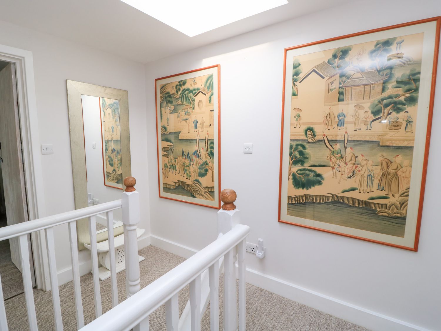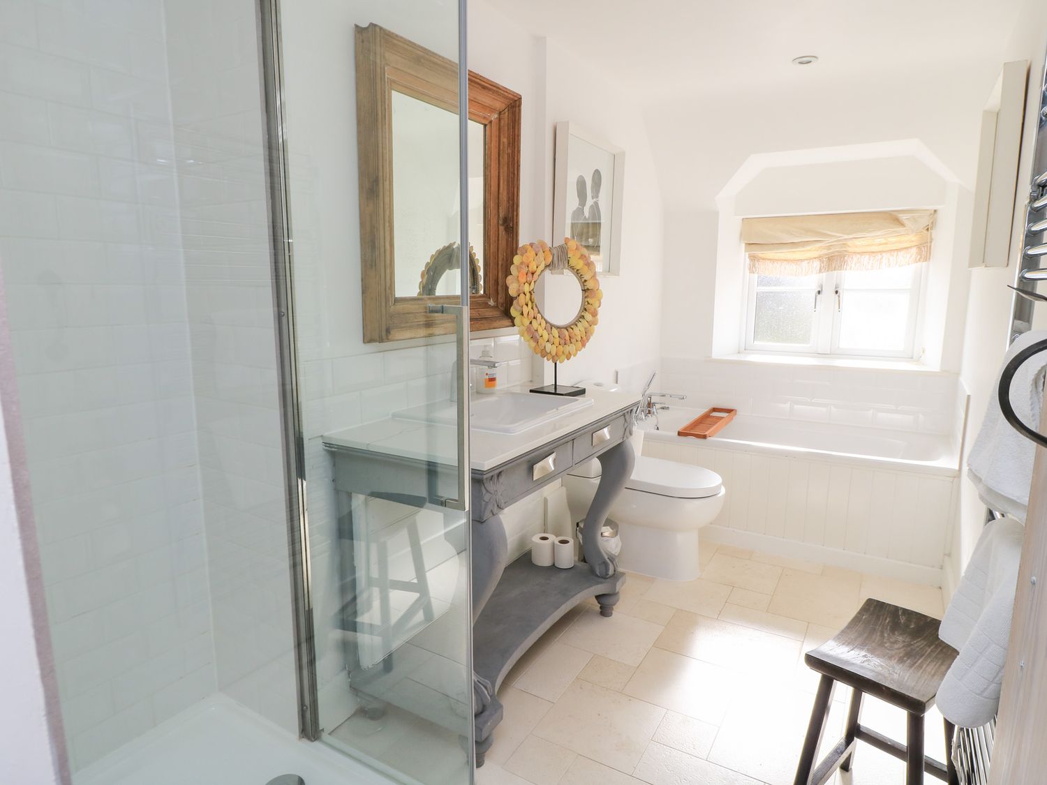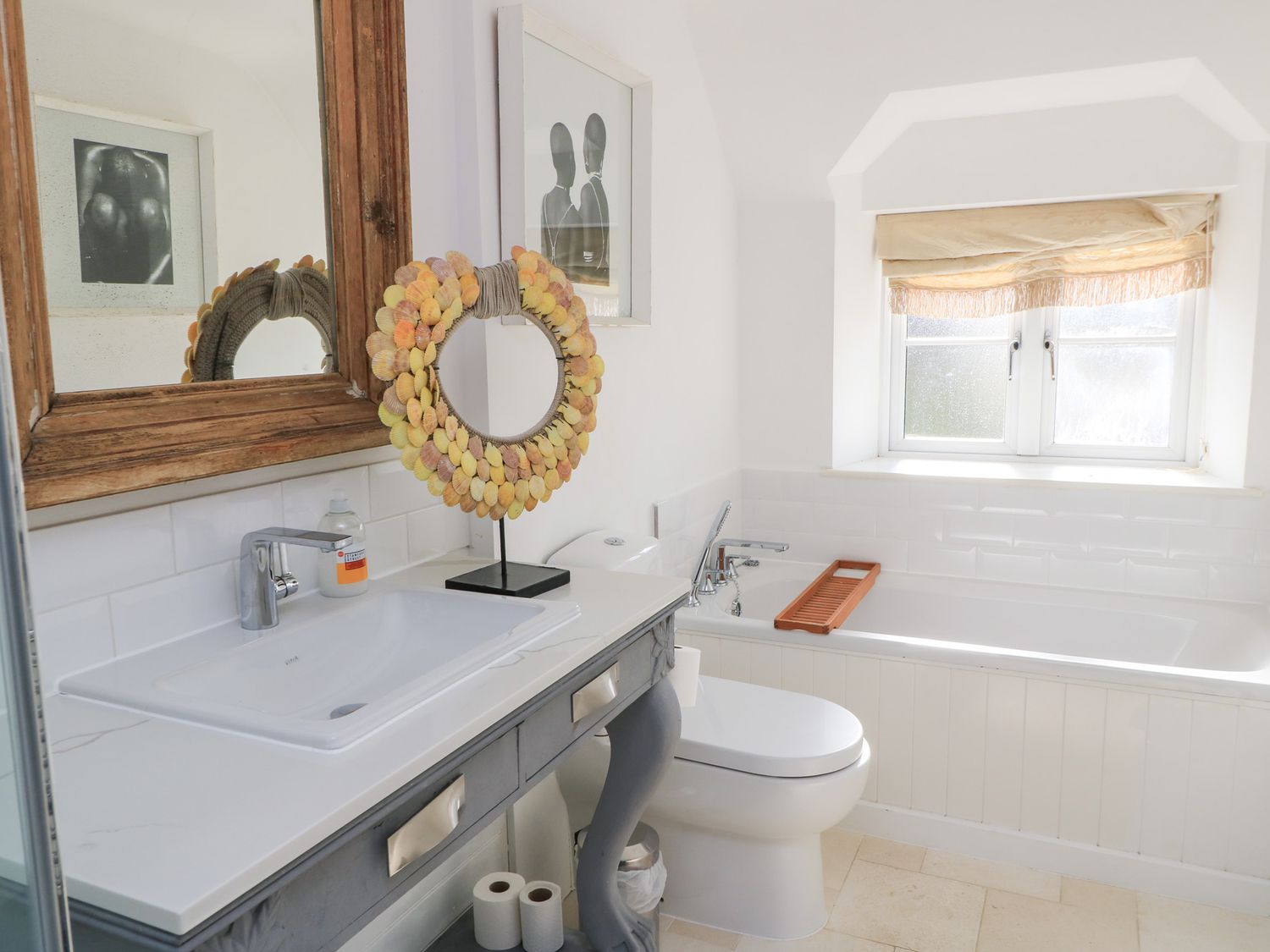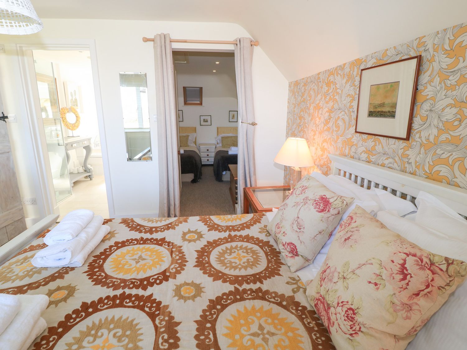 "Due to layout of bedrooms, Fairview Cottage is suitable for 8 adults + 2 children. Four bedrooms: 1 x first floor kingsize double plus en suite bathroom with bath, separate shower, WC and washbasin, 1 x first floor twin which is accessed via bedroom 1 with curtain separation more suitable for children, 2 x first floor king size double both with own en suite shower room with shower, WC and washbasin. 1 x ground floor king size double with en suite bathroom with roll top bath, separate shower and double vanity basins. Ground floor cloakroom with WC and washbasin. Kitchen. Living area. Utility."