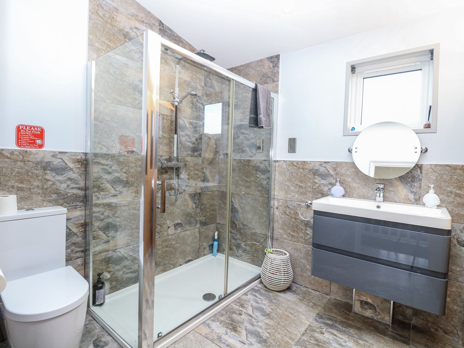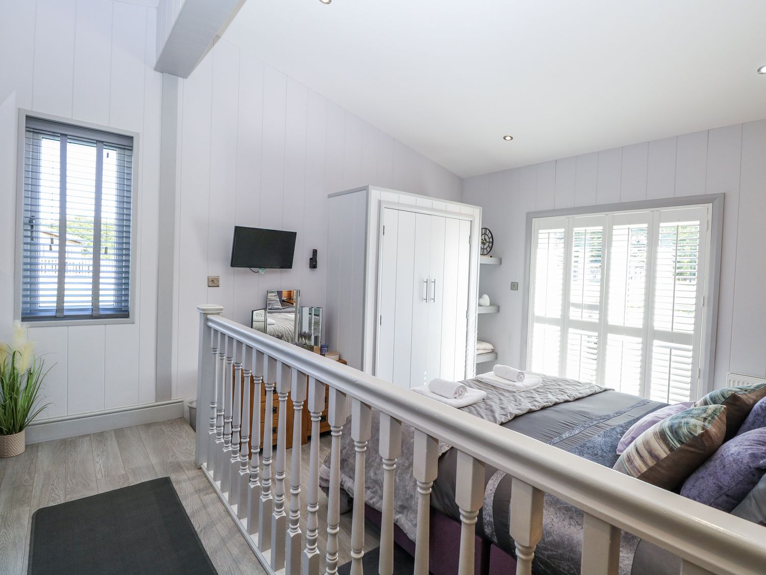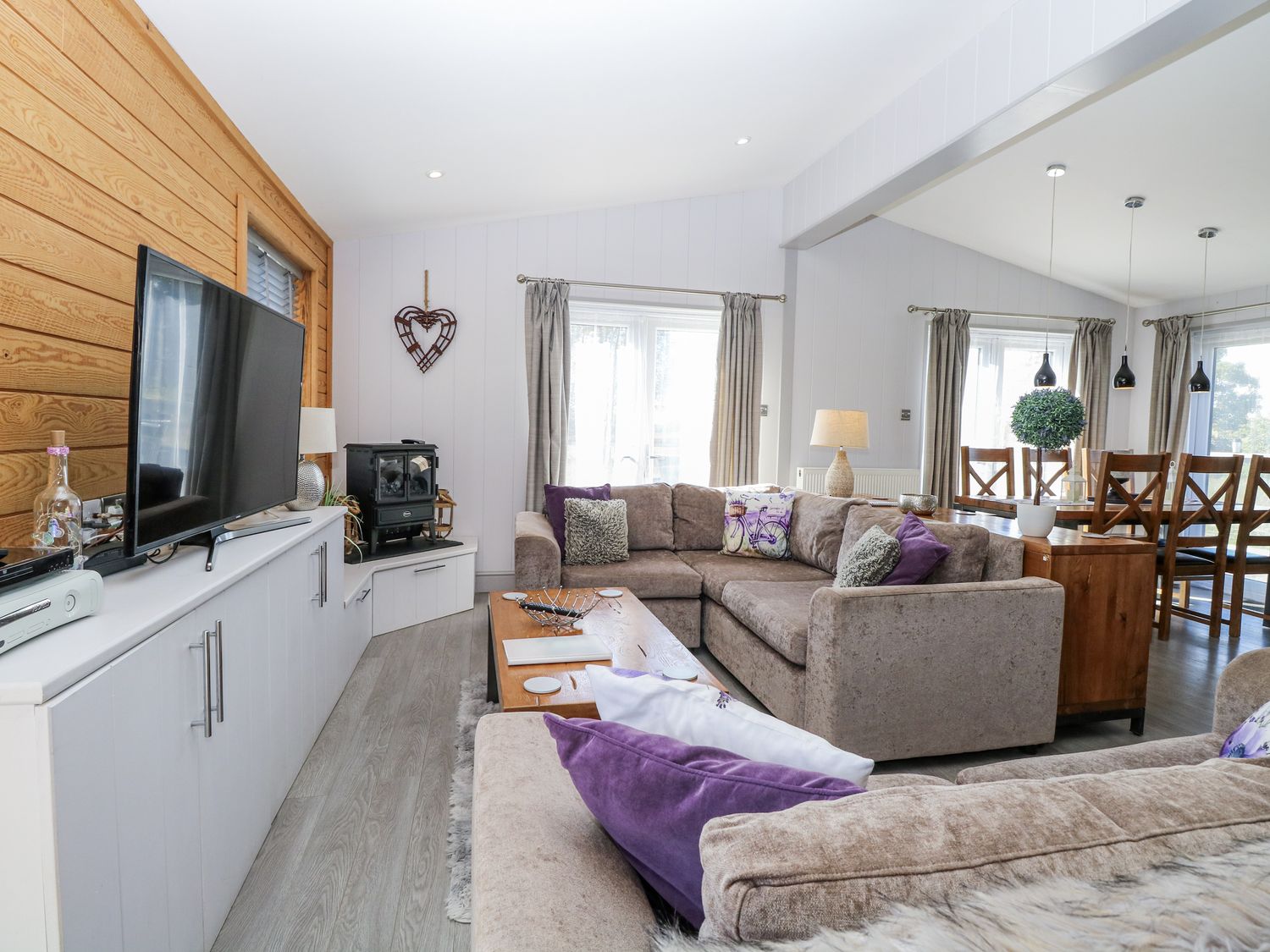 "Single-storey. Three bedrooms: 1 x super king with TV and en-suite walk-in shower, basin, heated towel rail, WC, 1 x double, 1 x twin with jack and gill bathroom. Bathroom with bath, shower over, basin, heated towel rail, and WC. Cloakroom with basin, heated towel rail, and WC. Open-plan living space with kitchen, dining area, and sitting area with electric fire. Utility"