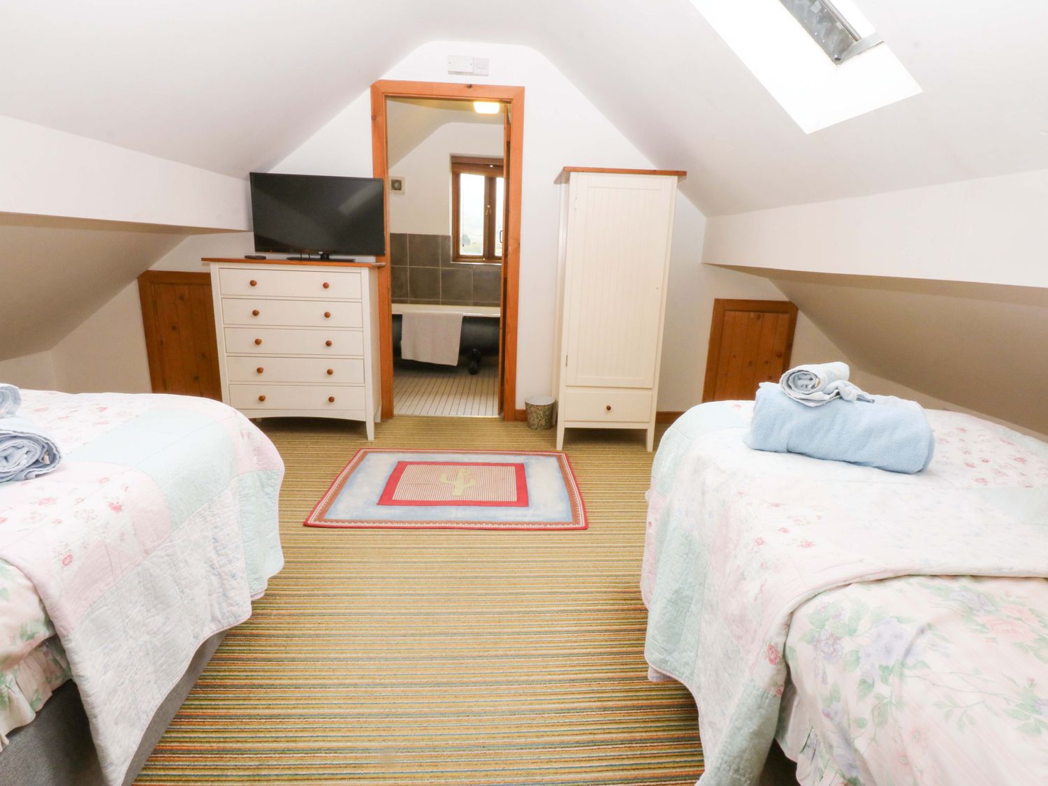 1 x ground floor super king-size bedroom with en-suite shower, basin and WC. 1 x twin bedroom with en-suite bath, basin and WC. Open plan living area with kitchen, dining area and sitting area with multi-fuel stove."