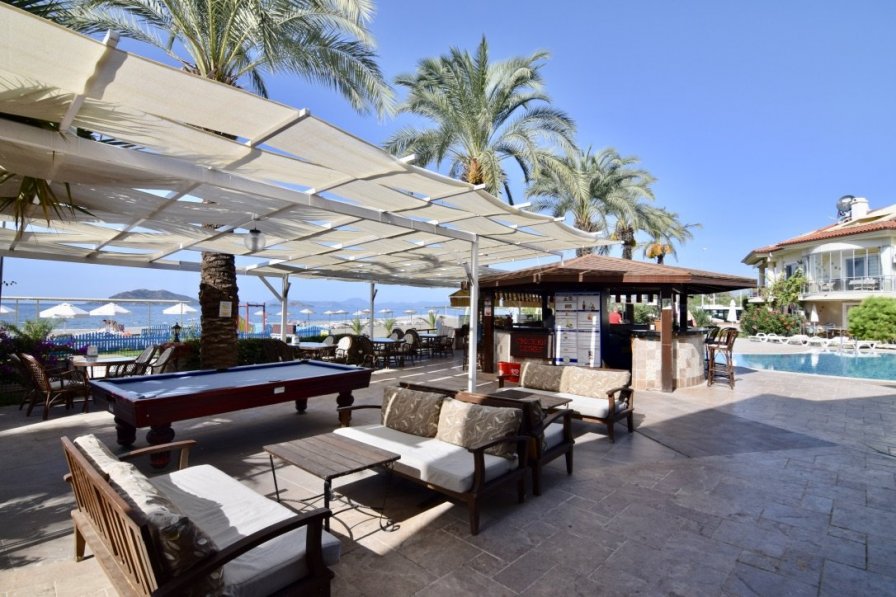 This fully air-conditioned 1 bedroom ground floor apartment has an open-plan kitchen which leads out onto the balcony, 1 bedroom and 1 bathroom (Extra bed/baby cot available). Sunset Beach Club provides you with a fun, family and relaxed atmosphere which will make it a holiday to remember. With a large balcony dining area, you can enjoy your BUILT-IN BBQ or a cocktail whilst watching the poolside or chill out sunbathing around one of our many pools with beautiful sea views. Sunset Beach Club is a self-sufficient 5 stars complex with SECURITY 24/7 and has got everything you need for a wonderful holiday, including a Private beach, Water Sports, 6 outdoor and 1 indoor swimming pools, Restaurant, Café, Pool bar, Fitness Centre, Turkish Bath & Spa & Massage centre, Internet access and Market shop. The beautiful gardens are all well maintained and landscaped. Sunset Beach Club is situated on the beachfront and it is just a 10-minute walk to Calis promenade where you will find an array of shops, restaurants & cafés start at 500 meters from the complex and goes further 500 meters. The main promenade at Calis beach boasts lovely views across the sea to the islands, mountains and hills in the distance. The historic town of Fethiye is approximately 4kms from the Beach Club and just a 20 minutes ride to Fethiye by public buses which depart from the corner of the complex. We have an office located on the complex which is open every day. for any issue we will always happy to help. if you will need we can provide a baby cot and folding bed free. Sunset Beach Club provides you with a fun, family and relaxed atmosphere which will make it a holiday to remember.