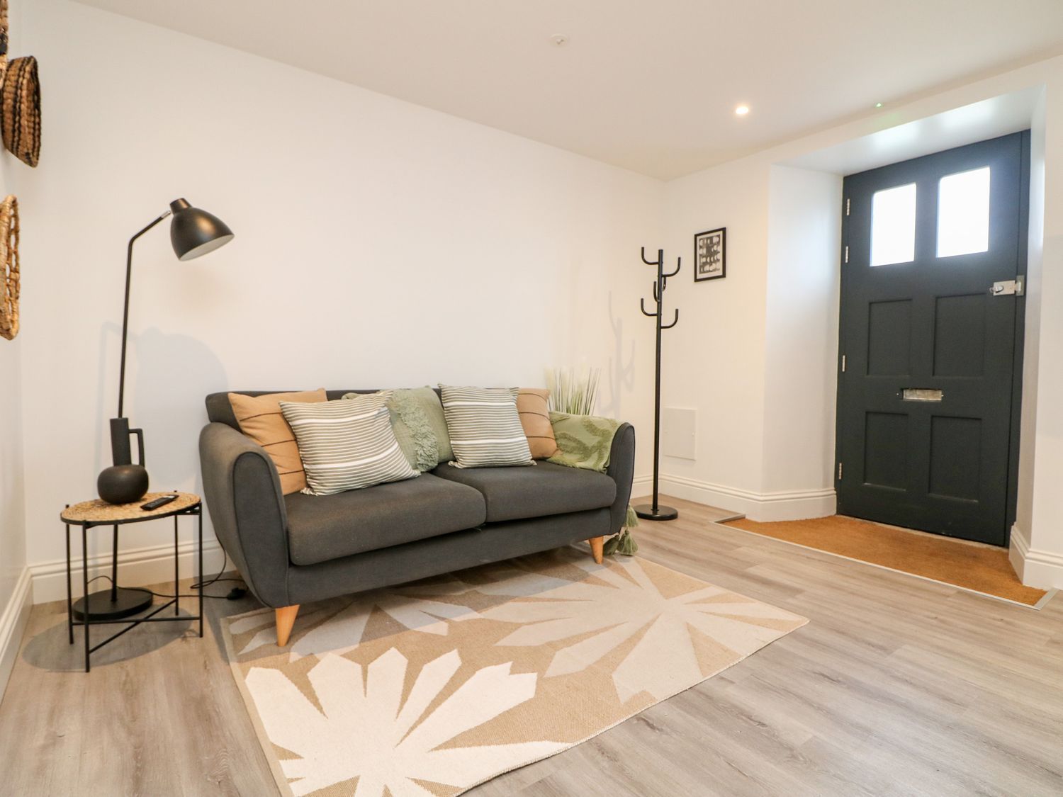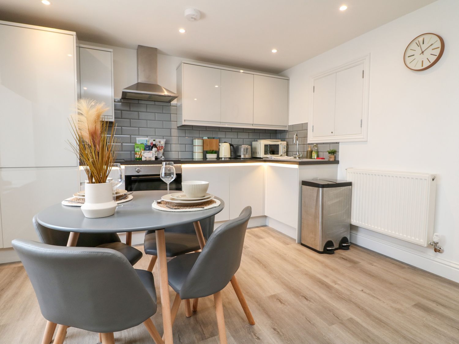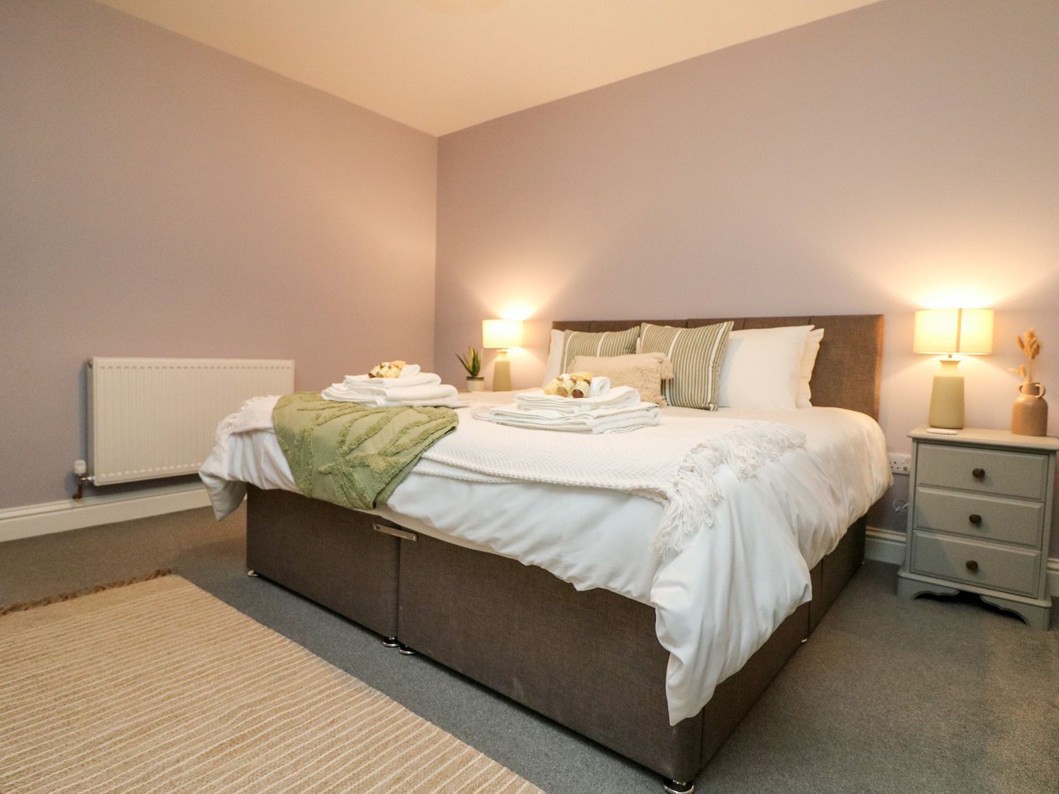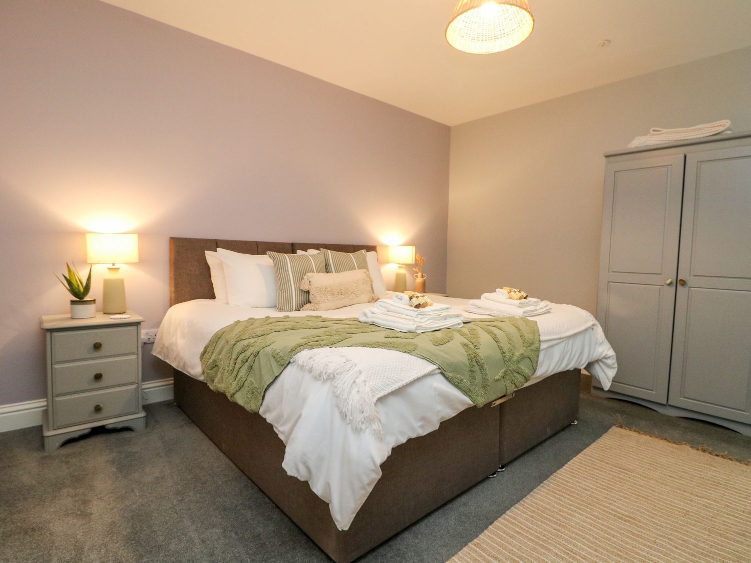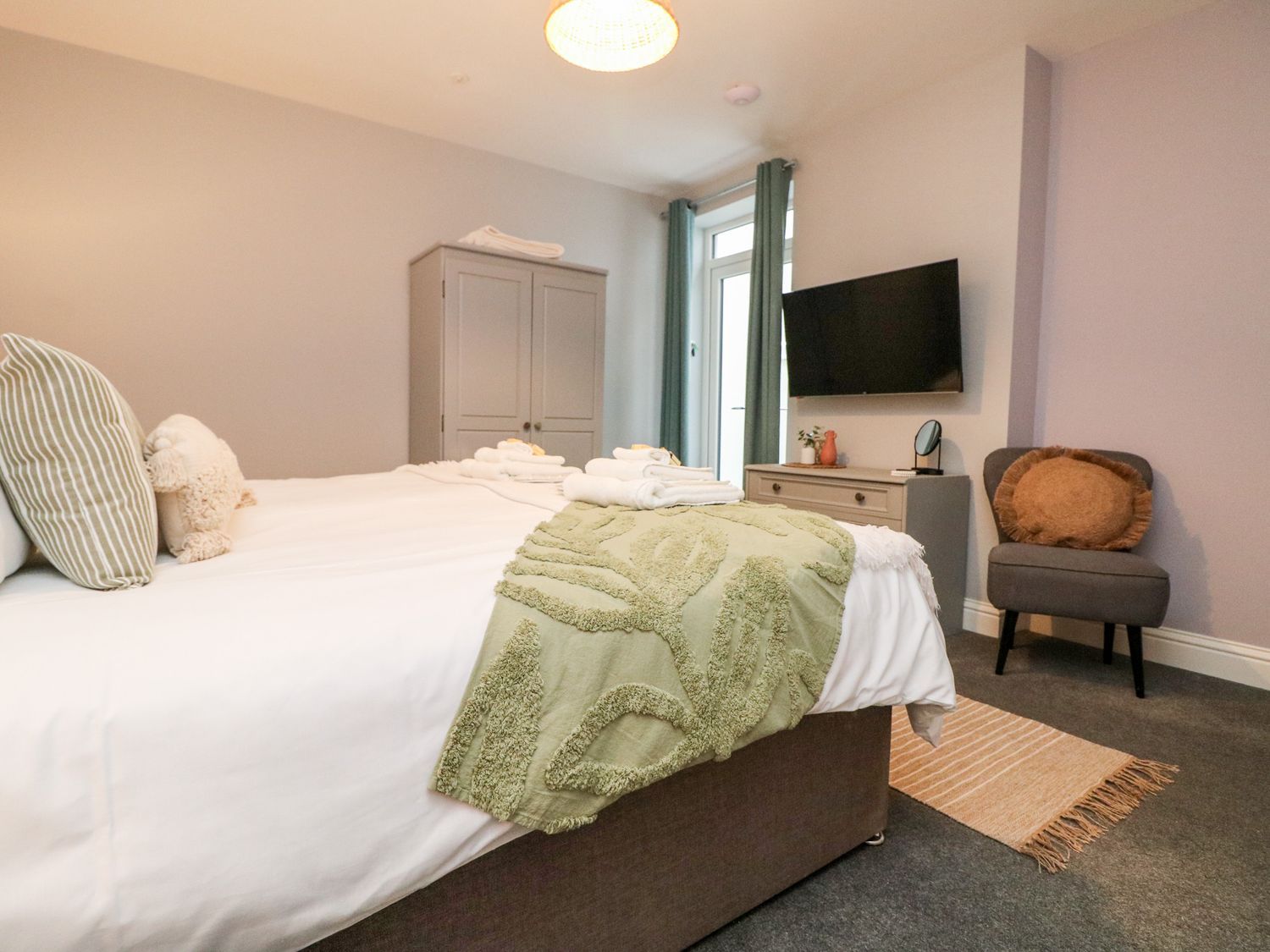 "Ground-floor apartment. One super-king-size bedroom (zip/link, can be twin on request) with Smart TV and en-suite walk-in shower, basin, heated towel rail and WC. Open-plan living space with kitchen, dining and sitting area "