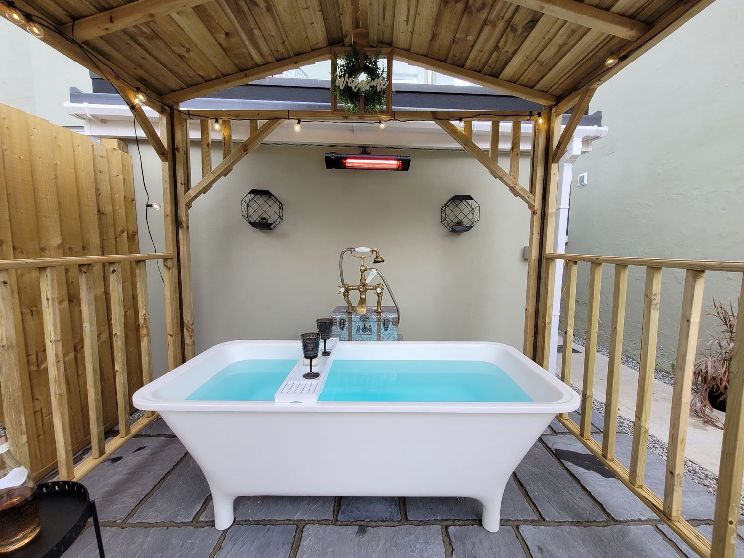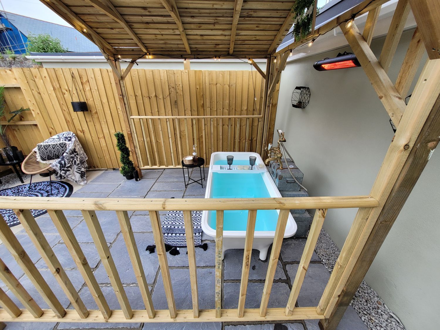 "The living areas in the property consist of an open-plan living area with a kitchen with electric oven and induction hob, microwave, fridge/freezer, washer/dryer, dining seating for two people, and a sitting area with Smart TV with Netflix. There is a super-king-size bedroom with zip/link, Smart TV with Netflix and an en-suite shower room. Outside, there is an enclosed garden with furniture and outdoor bath, as well as off-road parking for one car. Within 0.2 miles, you will find a shop, and within 0.1 miles, a pub, and please note that this is a non-smoking property. WiFi, fuel, power, bed linen and towels are all included in the price. Travel cot and highchair available on request. Two medium size petÔÇÖs welcome. Complimentary toiletries and slippers are provided. Escape to Cornwall in style with a stay at Klysa. Note: there is a Good Housekeeping Bond of 250GBP"
