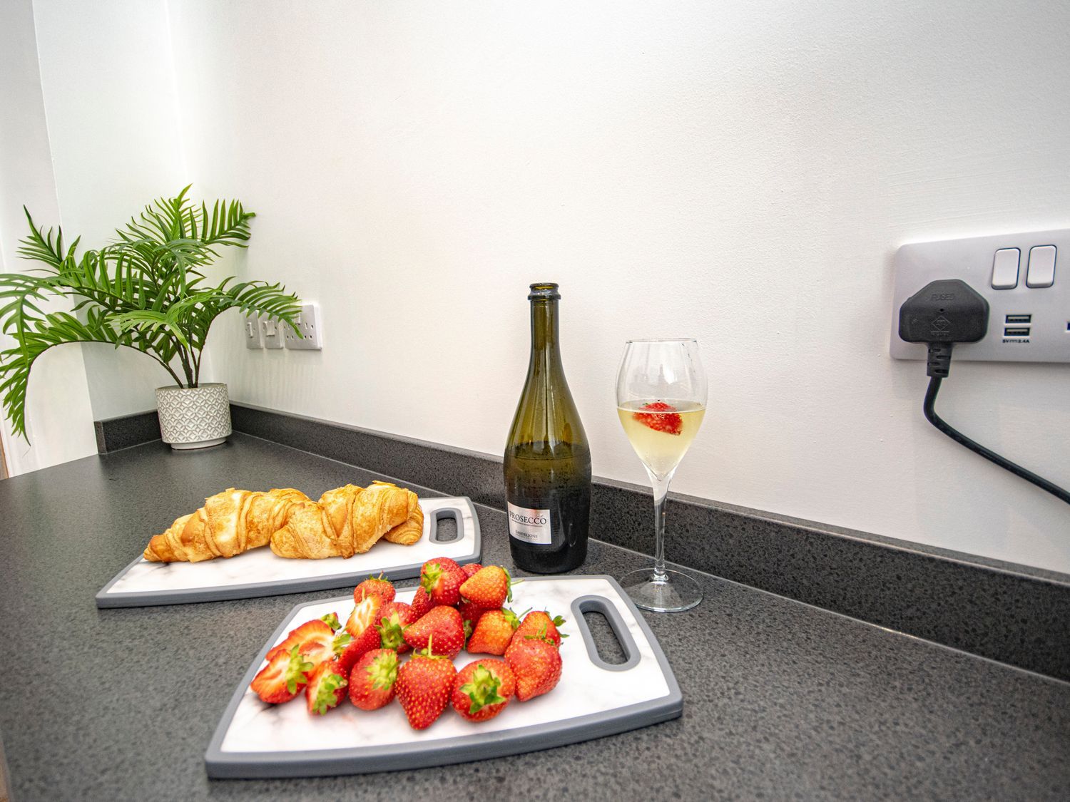 "First-floor, two-storey apartment. One super-king-size (zip/link, can be twin on request) bedroom with Smart TV with Netflix and en-suite walk-in shower, basin, heated towel rail and WC. Open-plan living space with kitchen, dining area and sitting area"