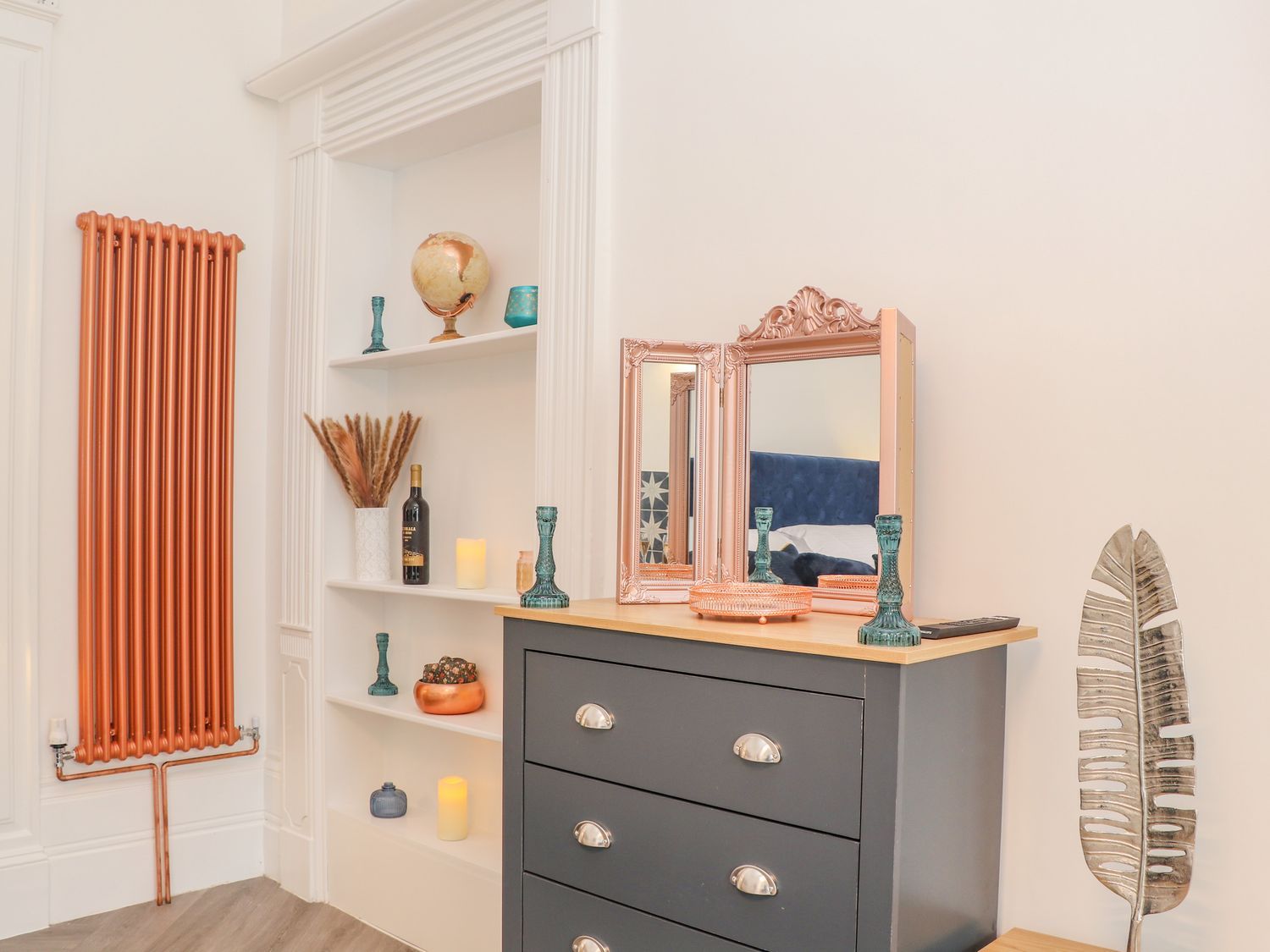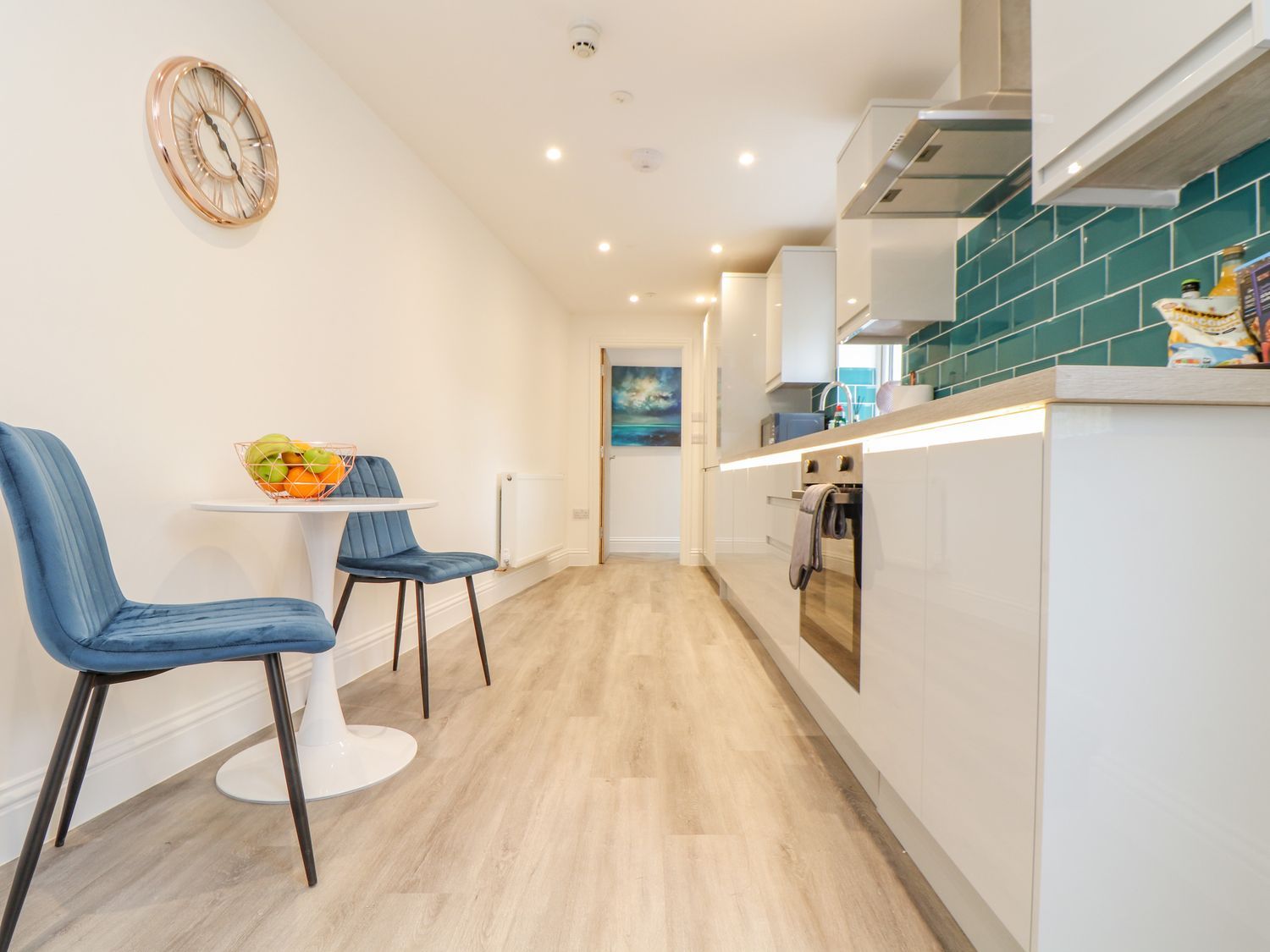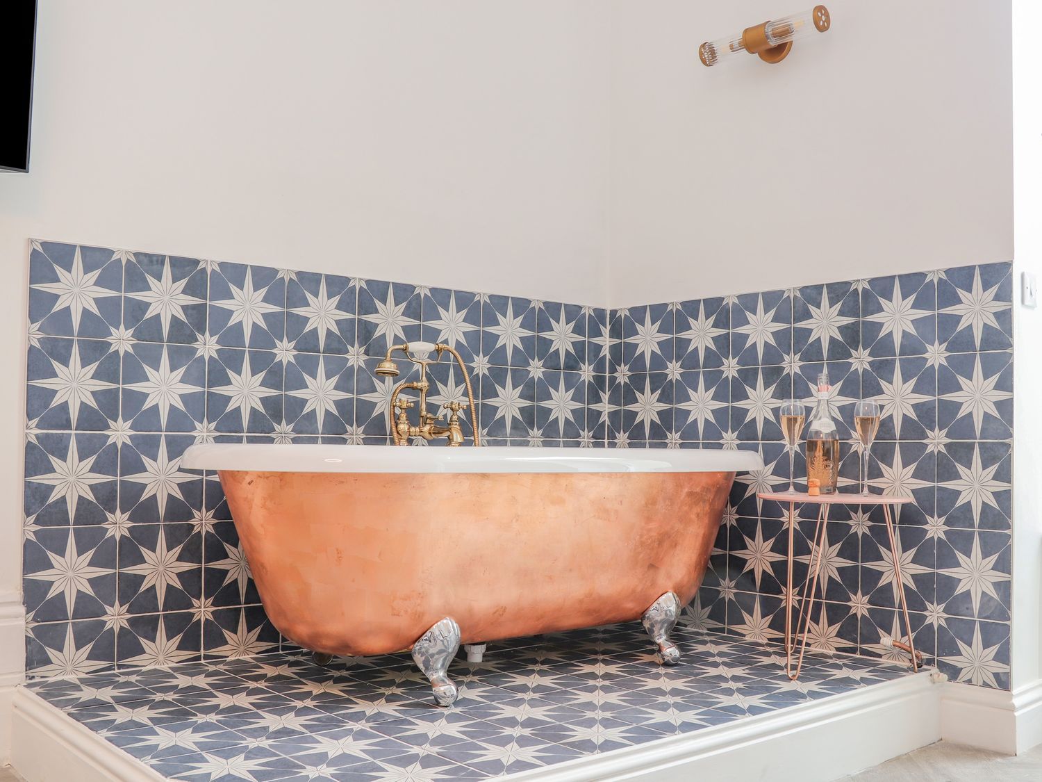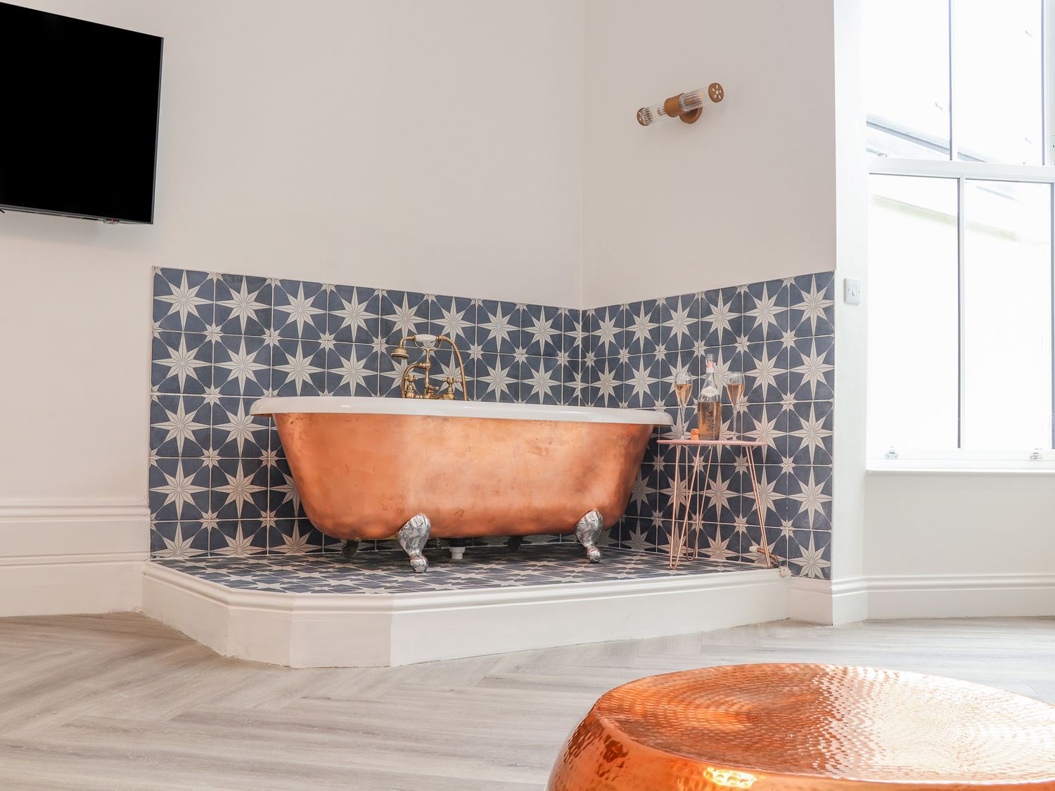 "Ground-floor apartment. One super-king-size bed with free-standing bath and Smart TV. Shower room with walk-in shower, basin, heated towel rail and WC. Kitchen/diner"