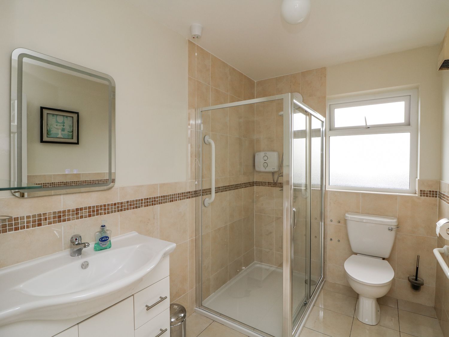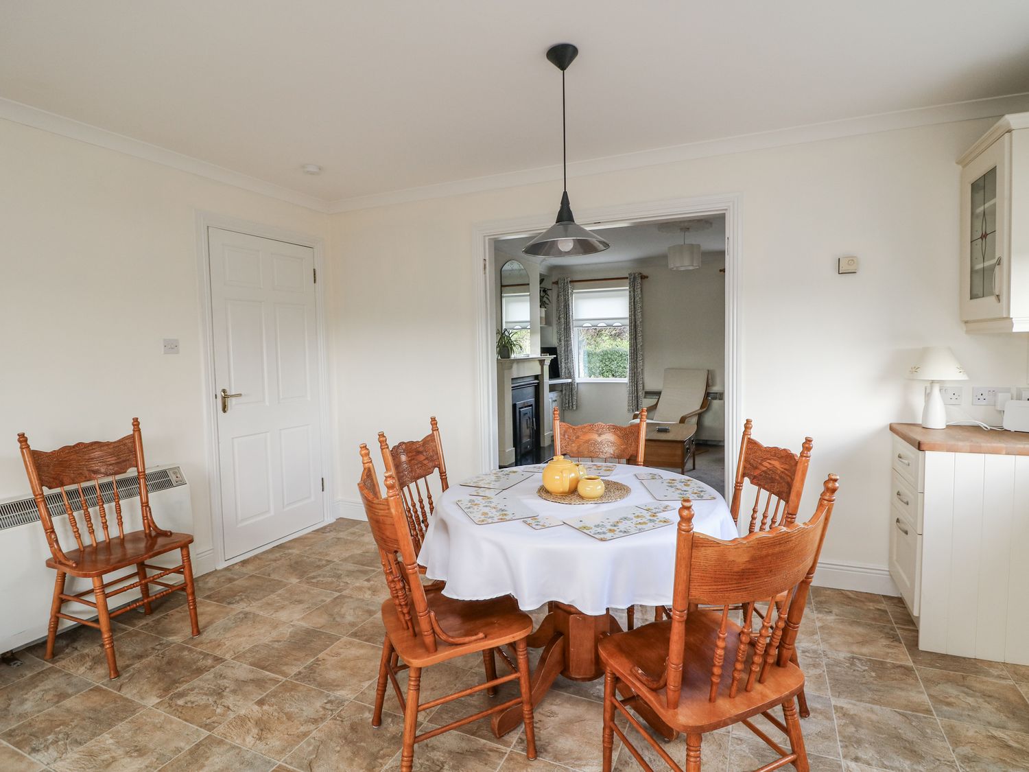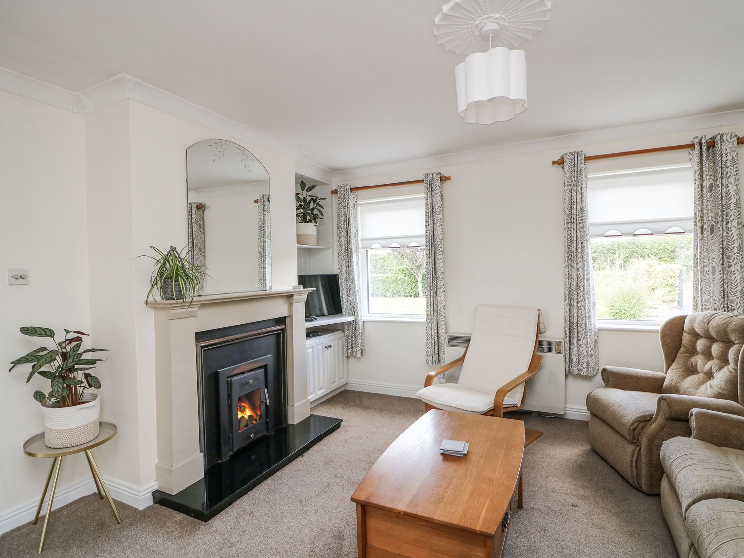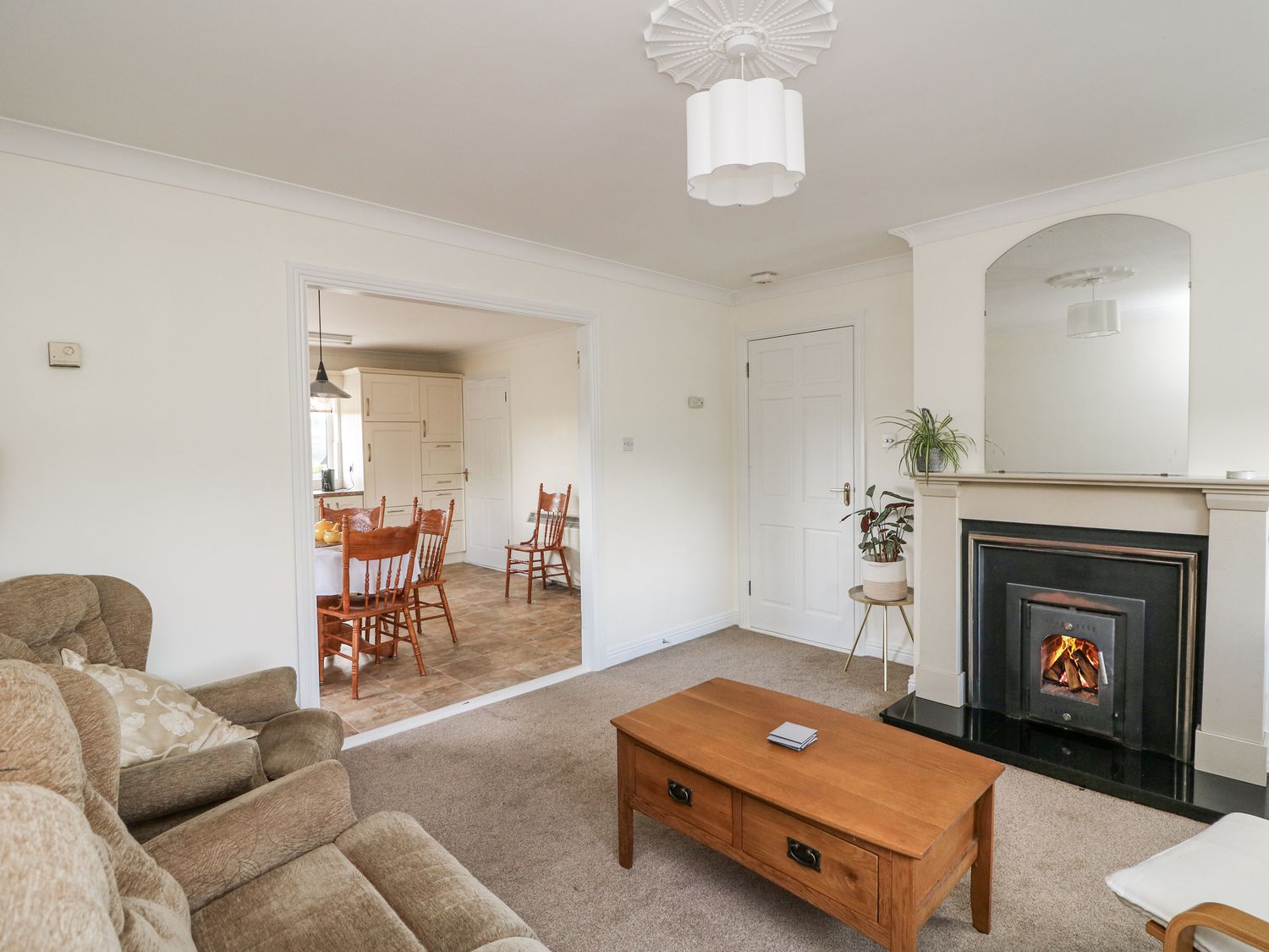 "Single-storey. Two bedrooms: 1 x double, 1 x family room with double and single. Shower room with walk-in shower, basin, WC. Utility. Open-plan living space with kitchen, dining area, and sitting area with woodburning stove"