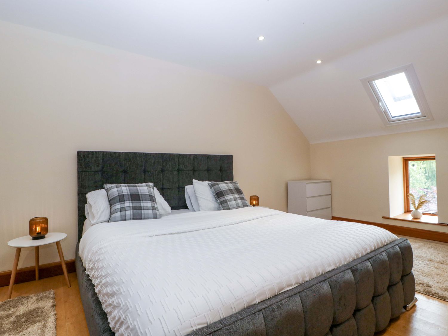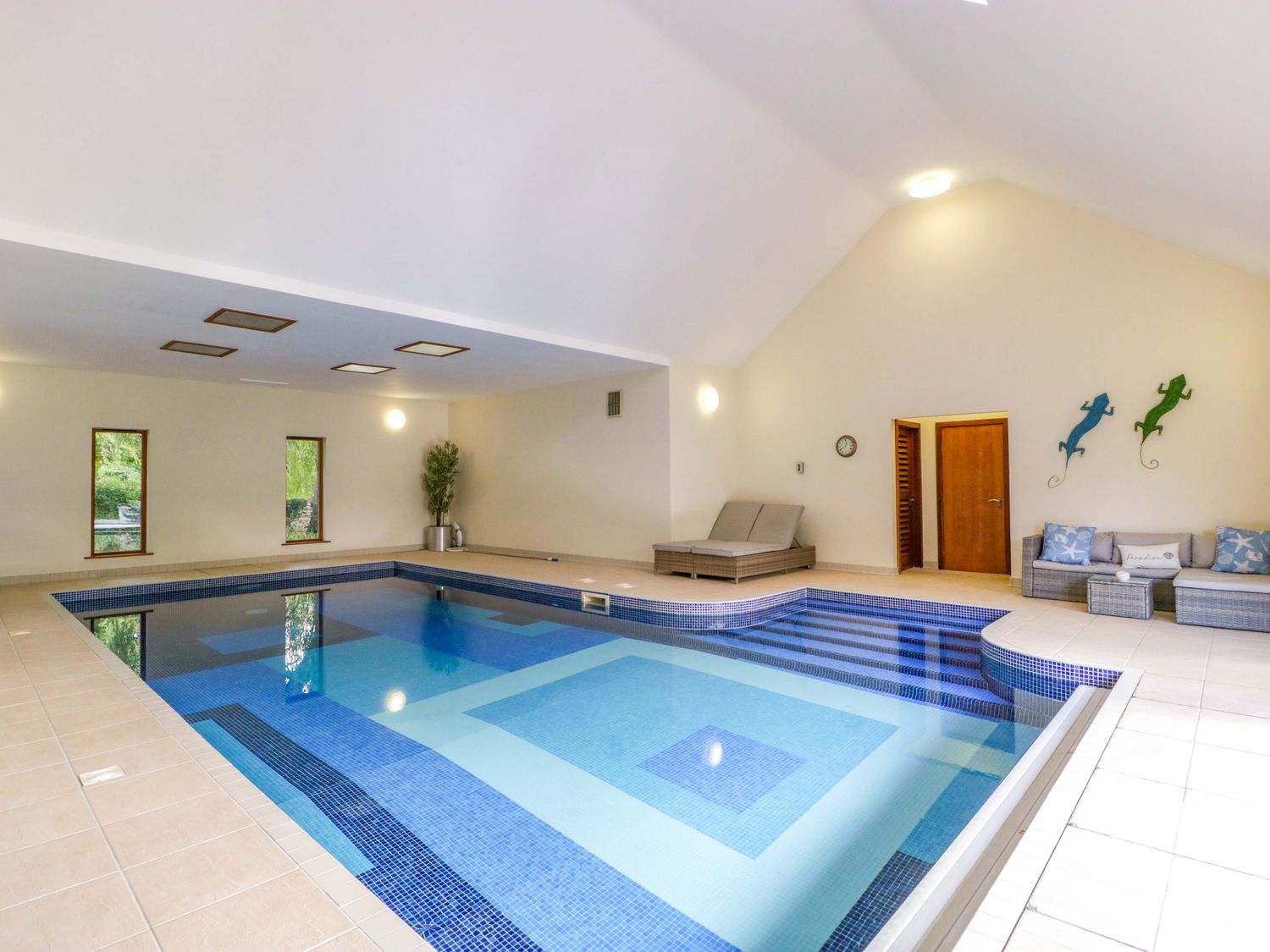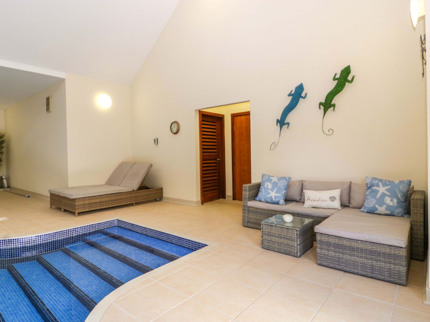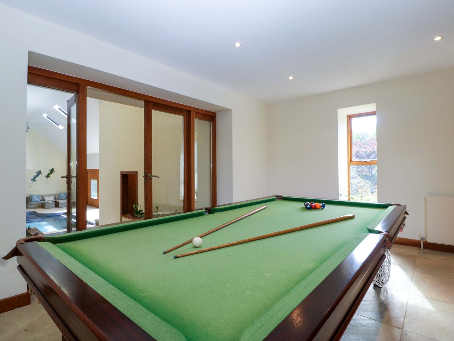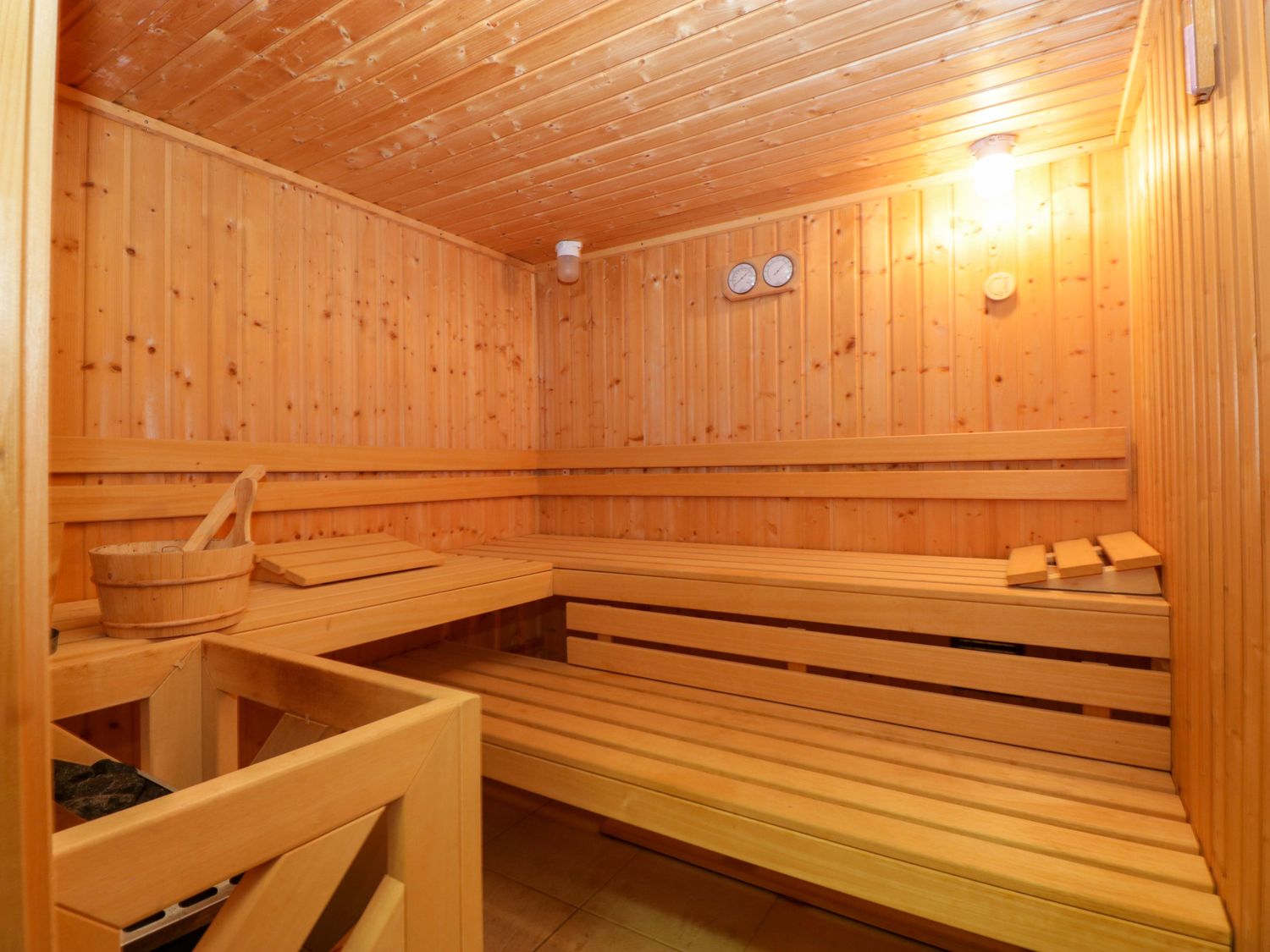 "Two bedrooms: 1 x king-size with en-suite freestanding bath, walk-in shower, basin and WC, 1 x double. Ground-floor shower room with walk-in shower, basin and WC. Ground-floor cloakroom with basin and WC. Kitchen. Open-plan living space with dining area, sitting area and game area. Private indoor swimming pool. Sauna"