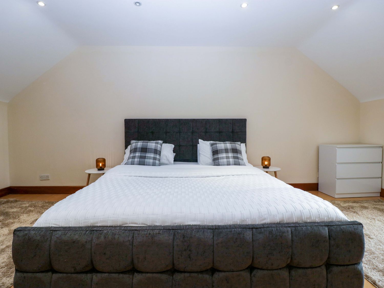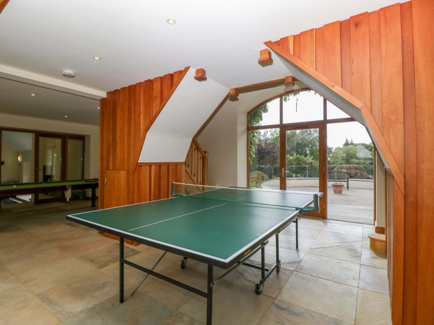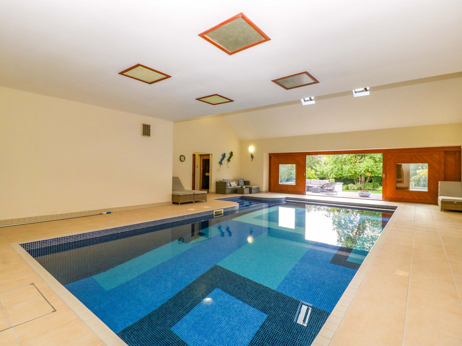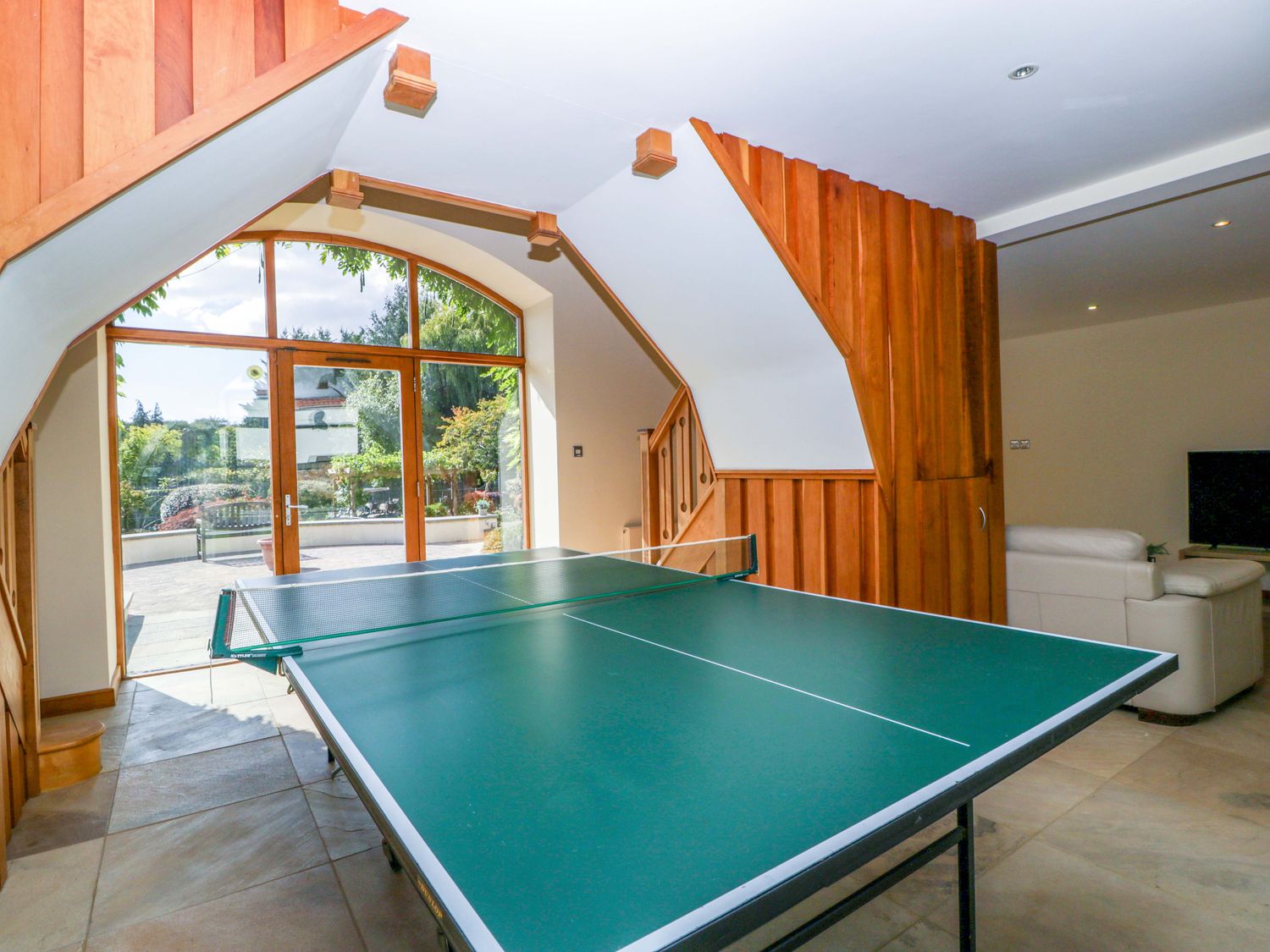 "Two bedrooms: 1 x king-size with en-suite freestanding bath, walk-in shower, basin and WC, 1 x double. Ground-floor shower room with walk-in shower, basin and WC. Ground-floor cloakroom with basin and WC. Kitchen. Open-plan living space with dining area, sitting area and game area. Private indoor swimming pool. Sauna"