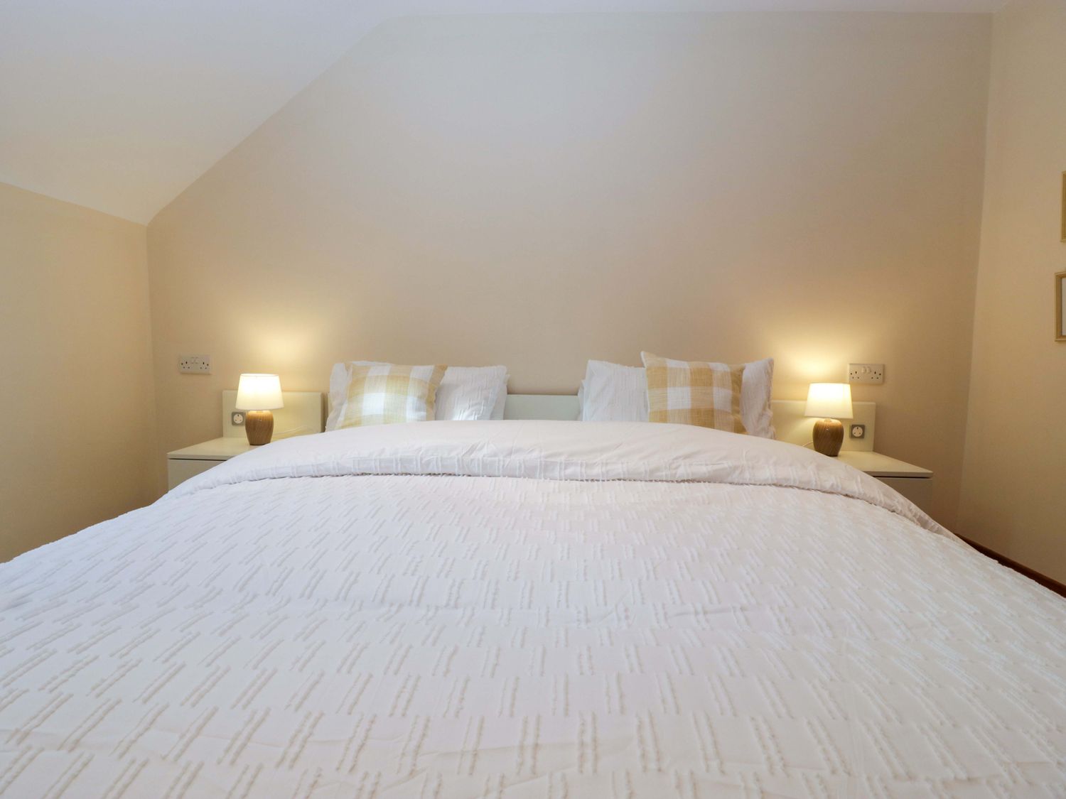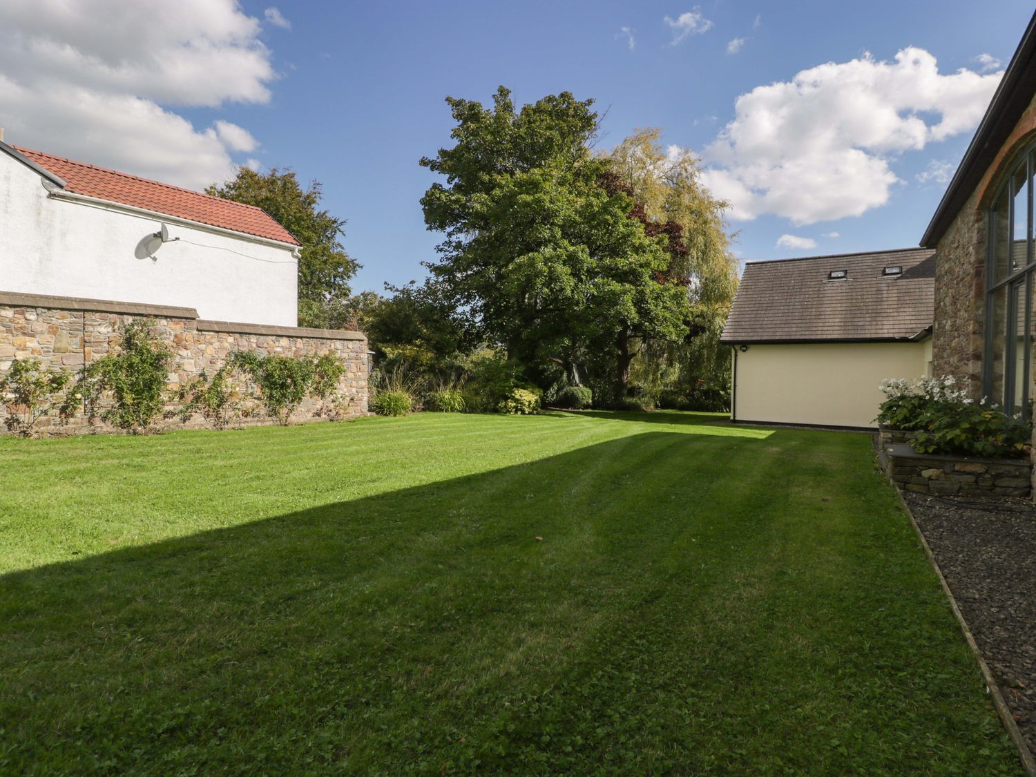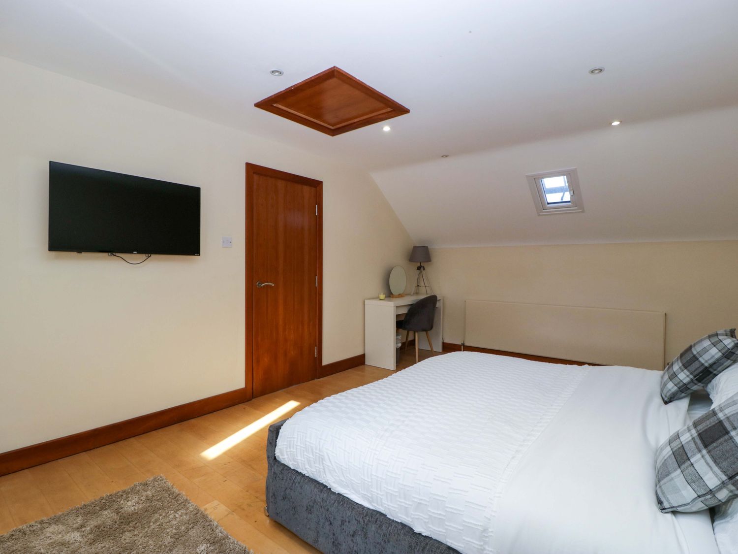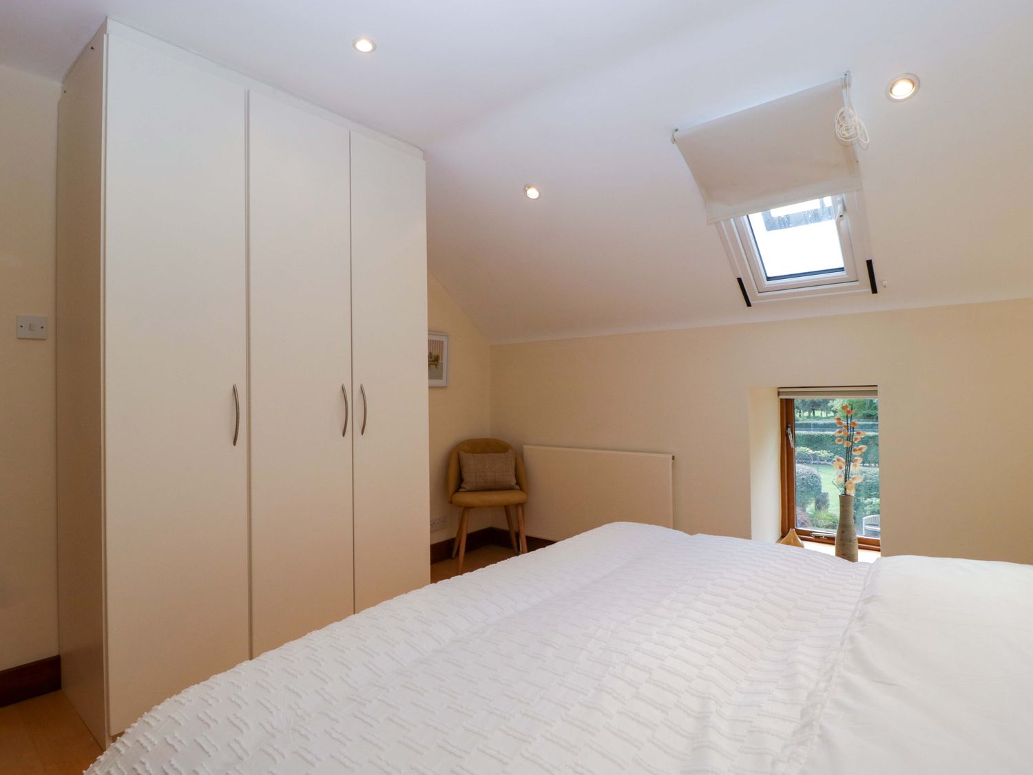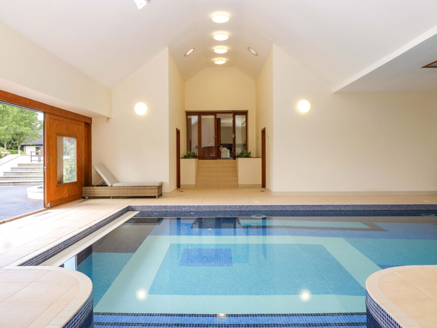 "Two bedrooms: 1 x king-size with en-suite freestanding bath, walk-in shower, basin and WC, 1 x double. Ground-floor shower room with walk-in shower, basin and WC. Ground-floor cloakroom with basin and WC. Kitchen. Open-plan living space with dining area, sitting area and game area. Private indoor swimming pool. Sauna"