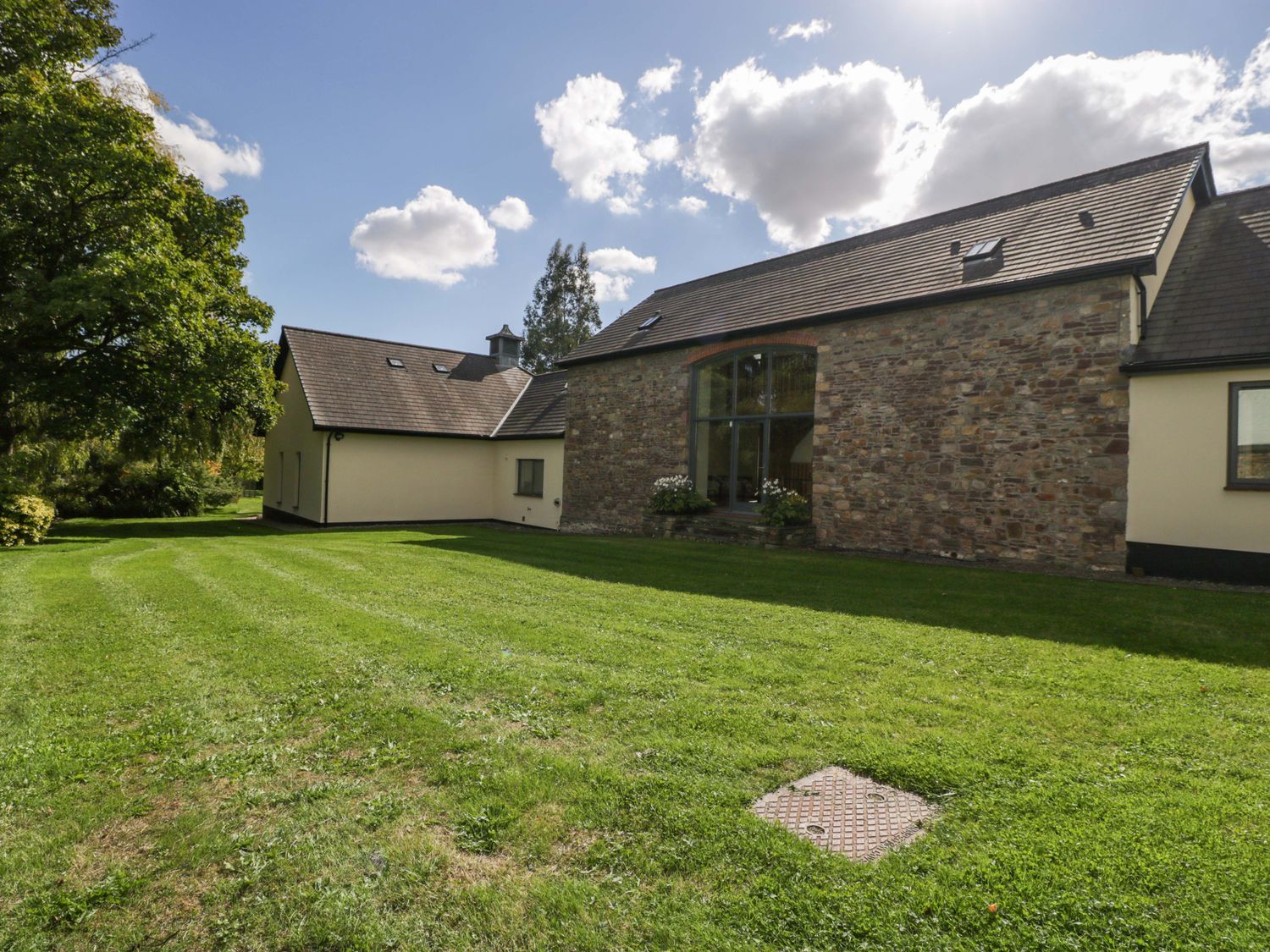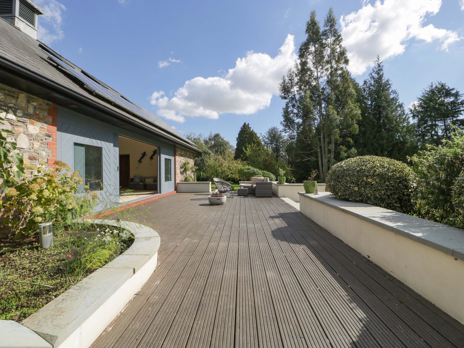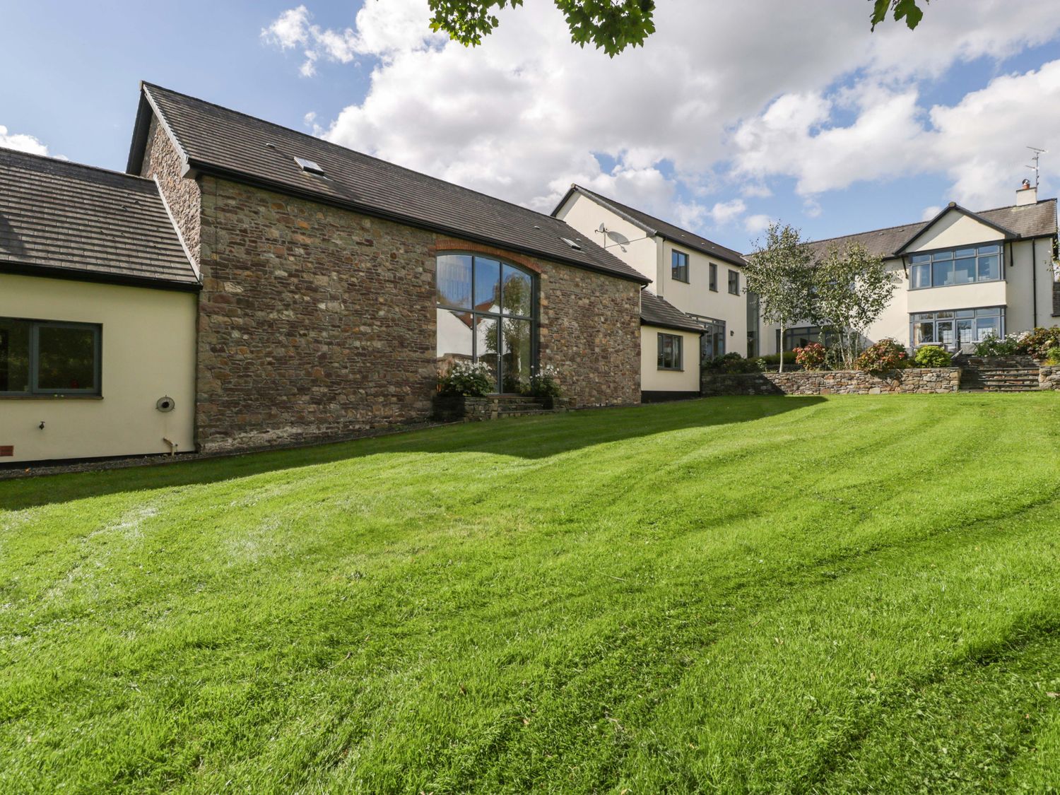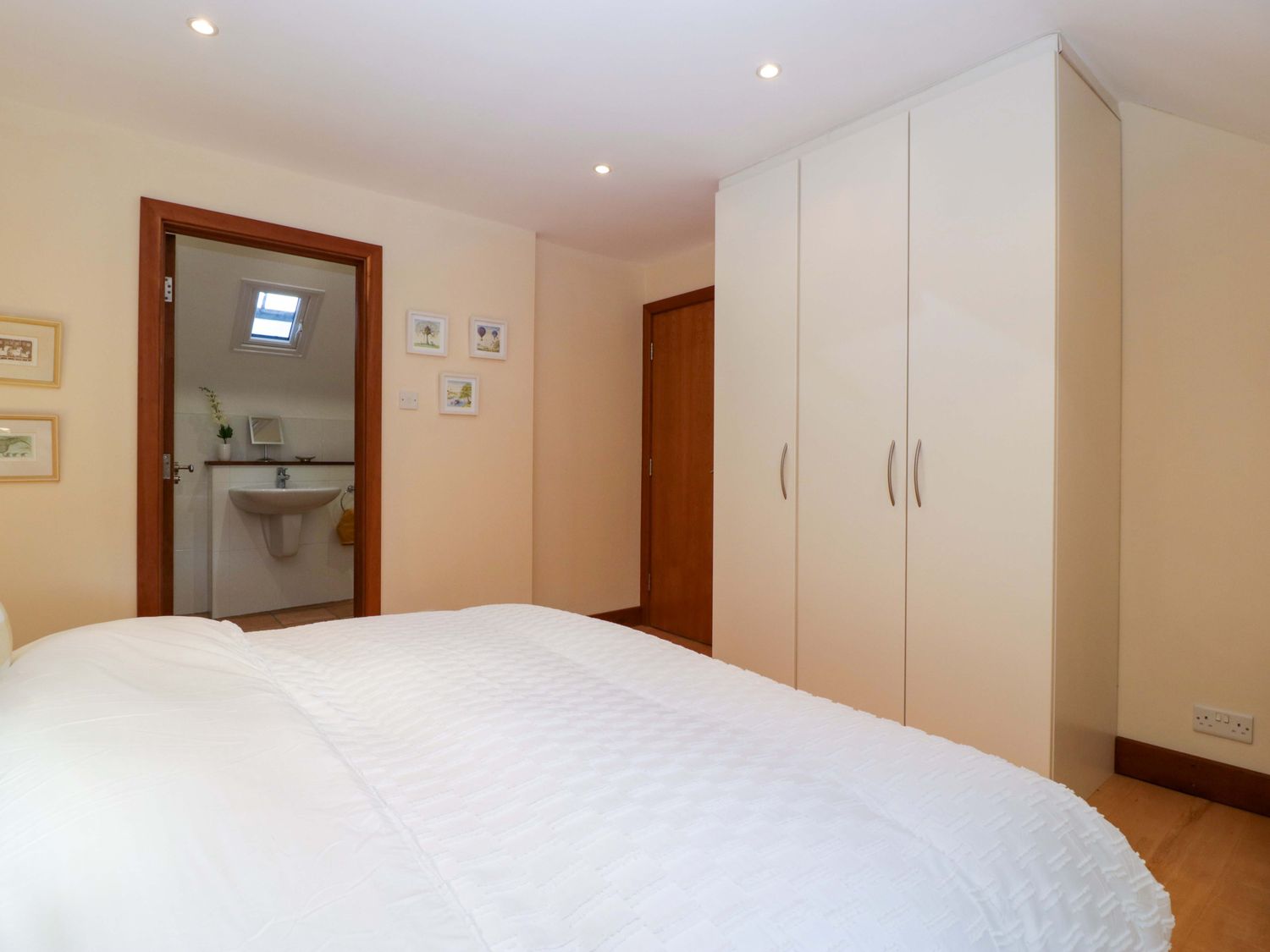 "Two bedrooms: 1 x king-size with en-suite freestanding bath, walk-in shower, basin and WC, 1 x double. Ground-floor shower room with walk-in shower, basin and WC. Ground-floor cloakroom with basin and WC. Kitchen. Open-plan living space with dining area, sitting area and game area. Private indoor swimming pool. Sauna"