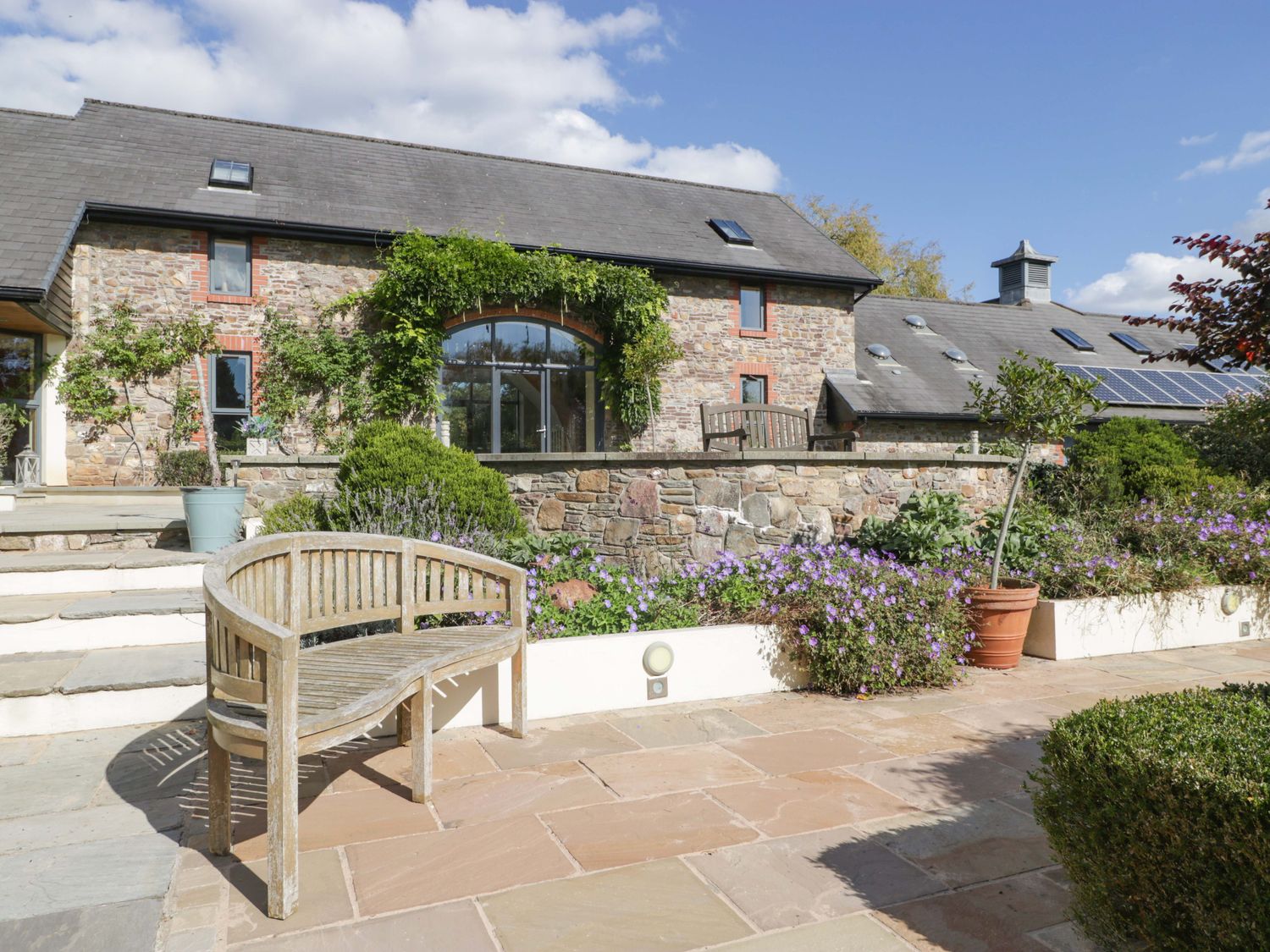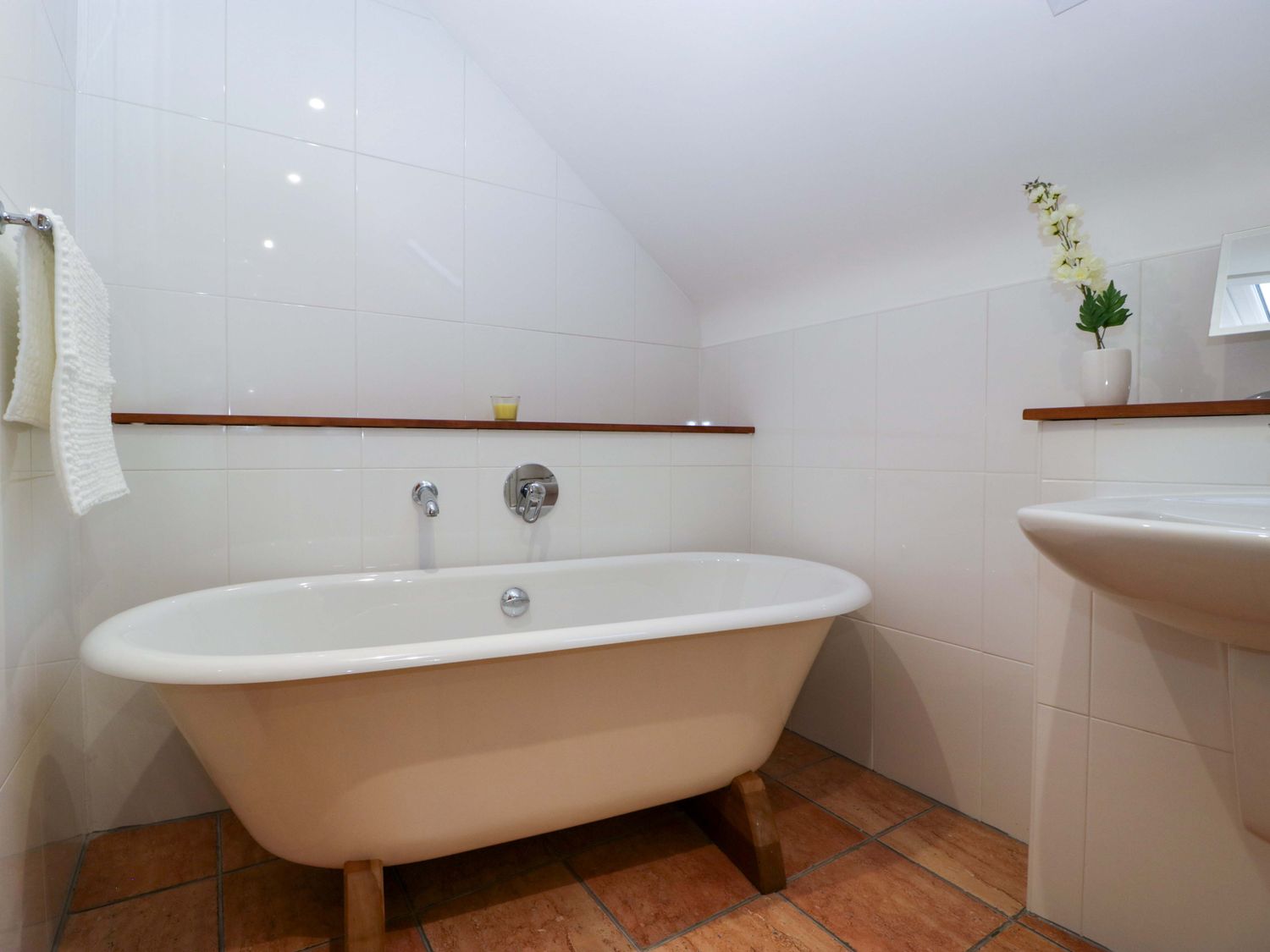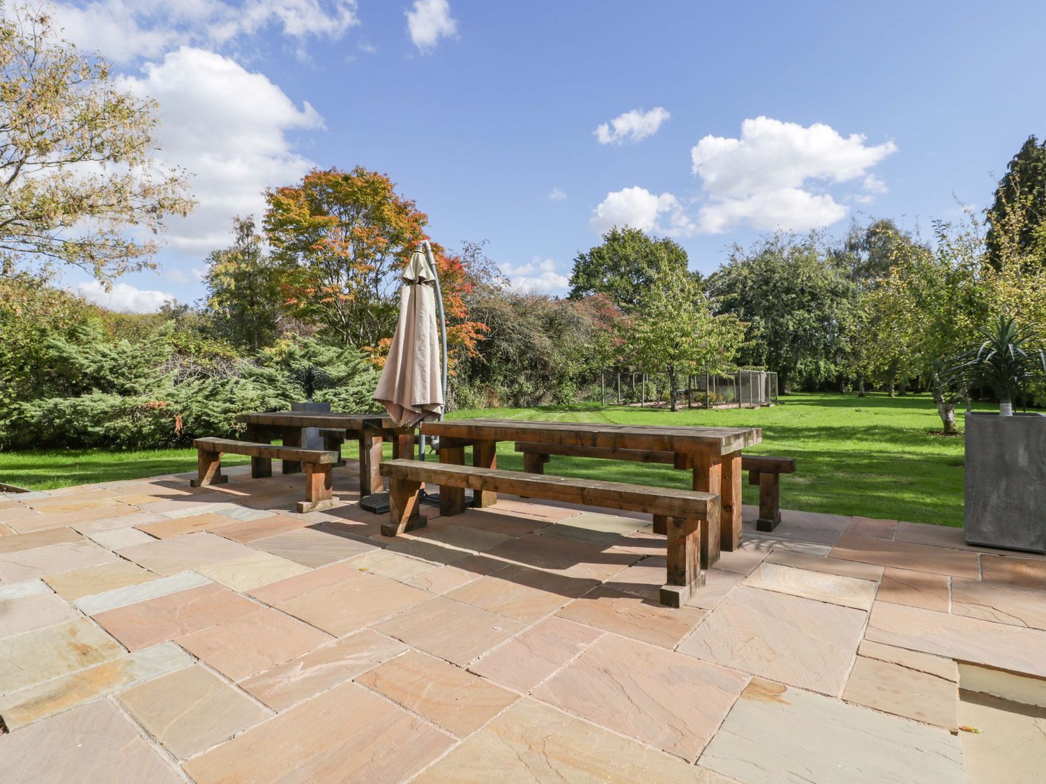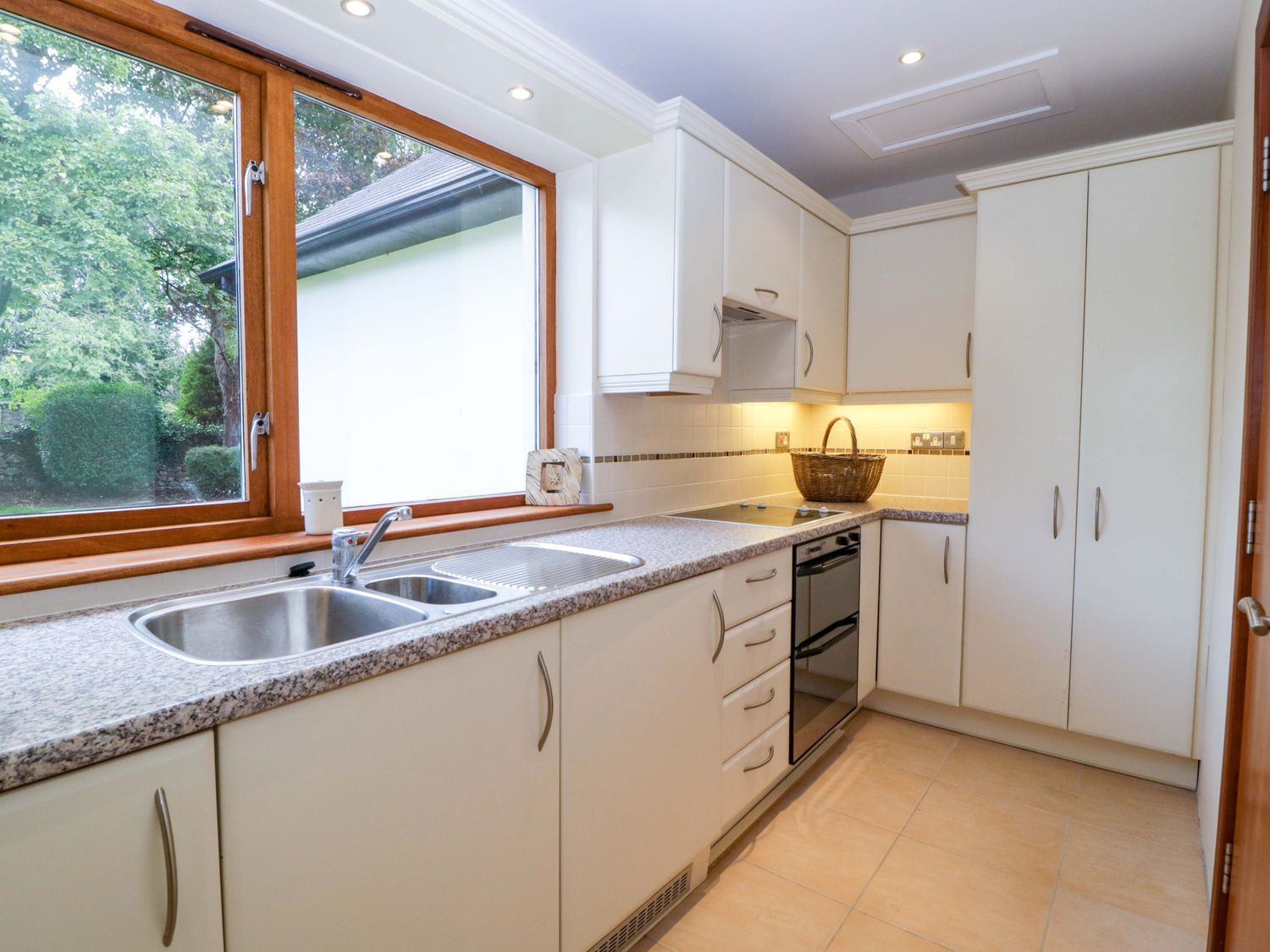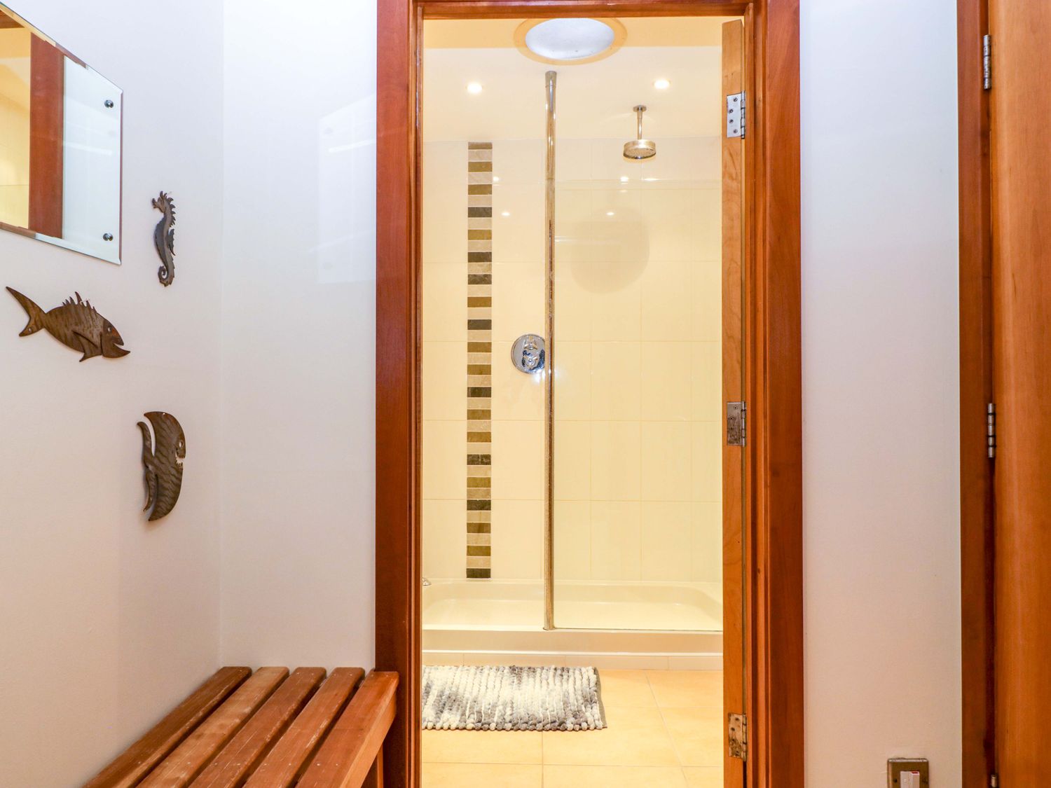 "Two bedrooms: 1 x king-size with en-suite freestanding bath, walk-in shower, basin and WC, 1 x double. Ground-floor shower room with walk-in shower, basin and WC. Ground-floor cloakroom with basin and WC. Kitchen. Open-plan living space with dining area, sitting area and game area. Private indoor swimming pool. Sauna"