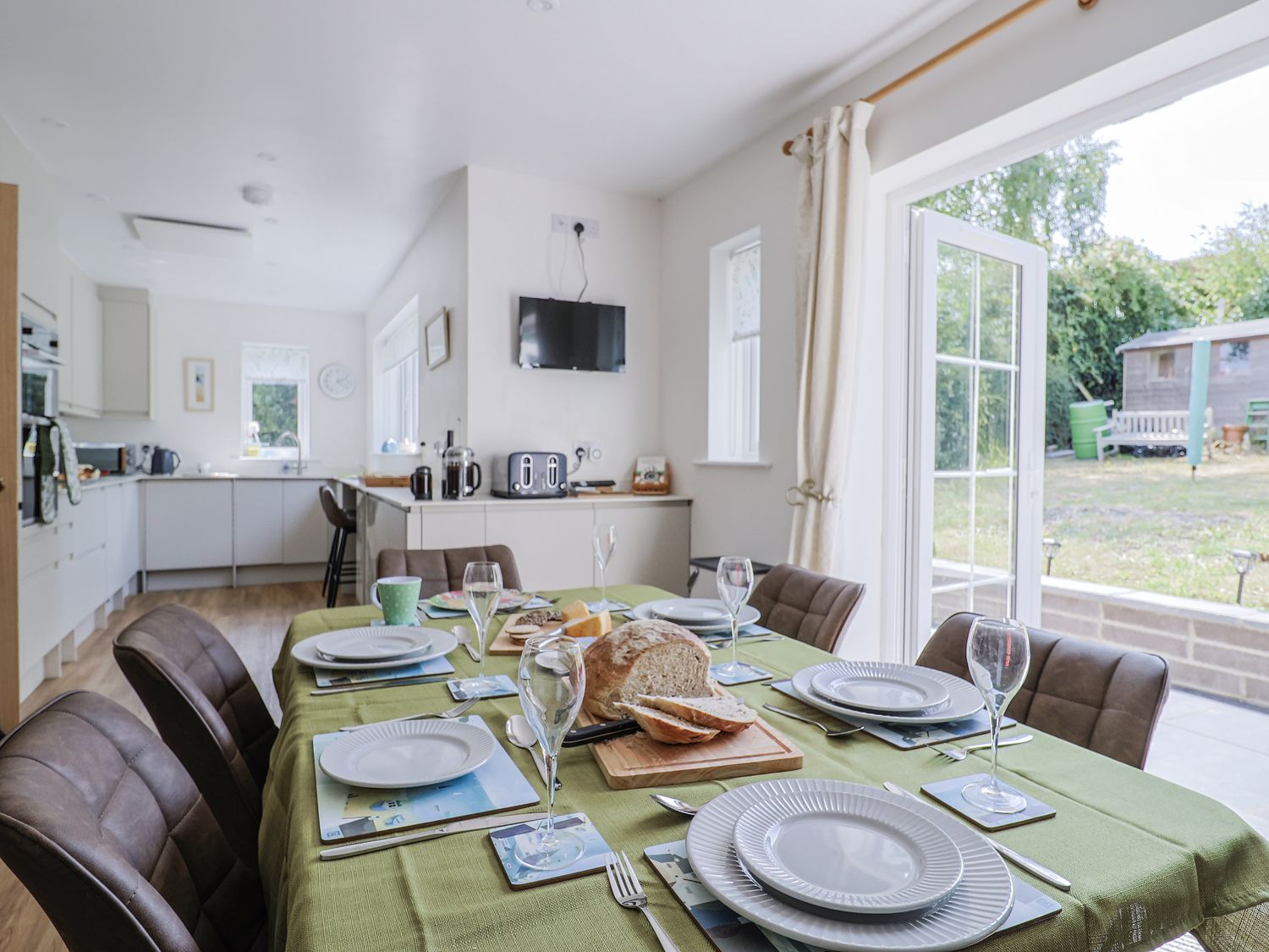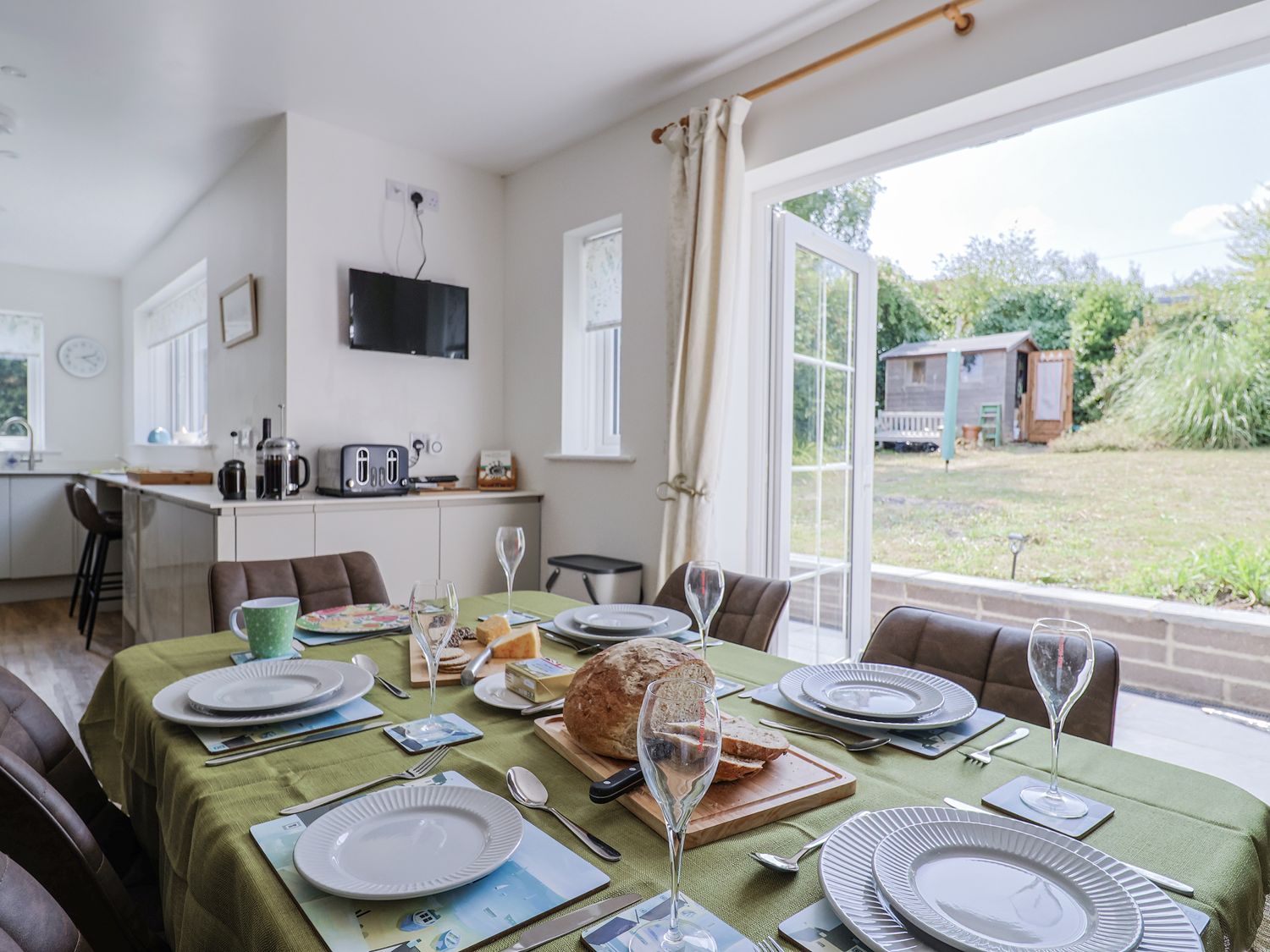 "St Helena consists of a sitting room with large bay windows offering coastal views towards Golden Cap and Portland, comfortable seating, and a welcoming atmosphere. The open-plan kitchen and dining area features dining seating for six, patio doors leading to the rear garden, and a sociable layout ideal for family meals and gatherings. Appliances include an electric oven, induction hob, microwave, larder fridge, freezer, dishwasher, washing machine, and tumble dryer.