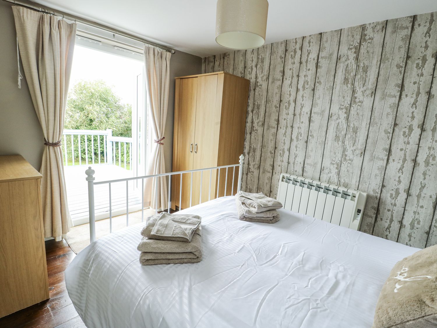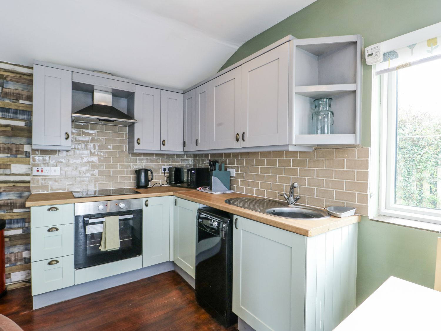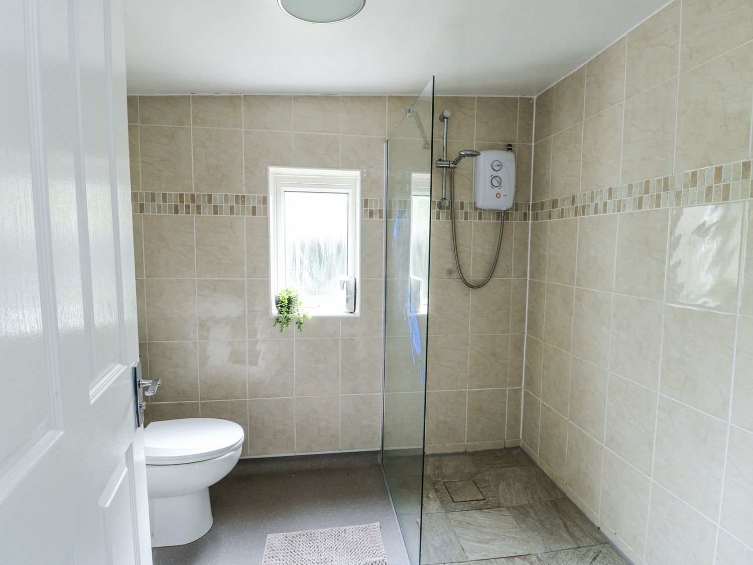 "Single-storey. Three bedrooms: 2 x double, 1 x single. Wet room with level walk-in shower, basin and WC. Open-plan living space with kitchen, dining area and sitting area with woodburning stove"