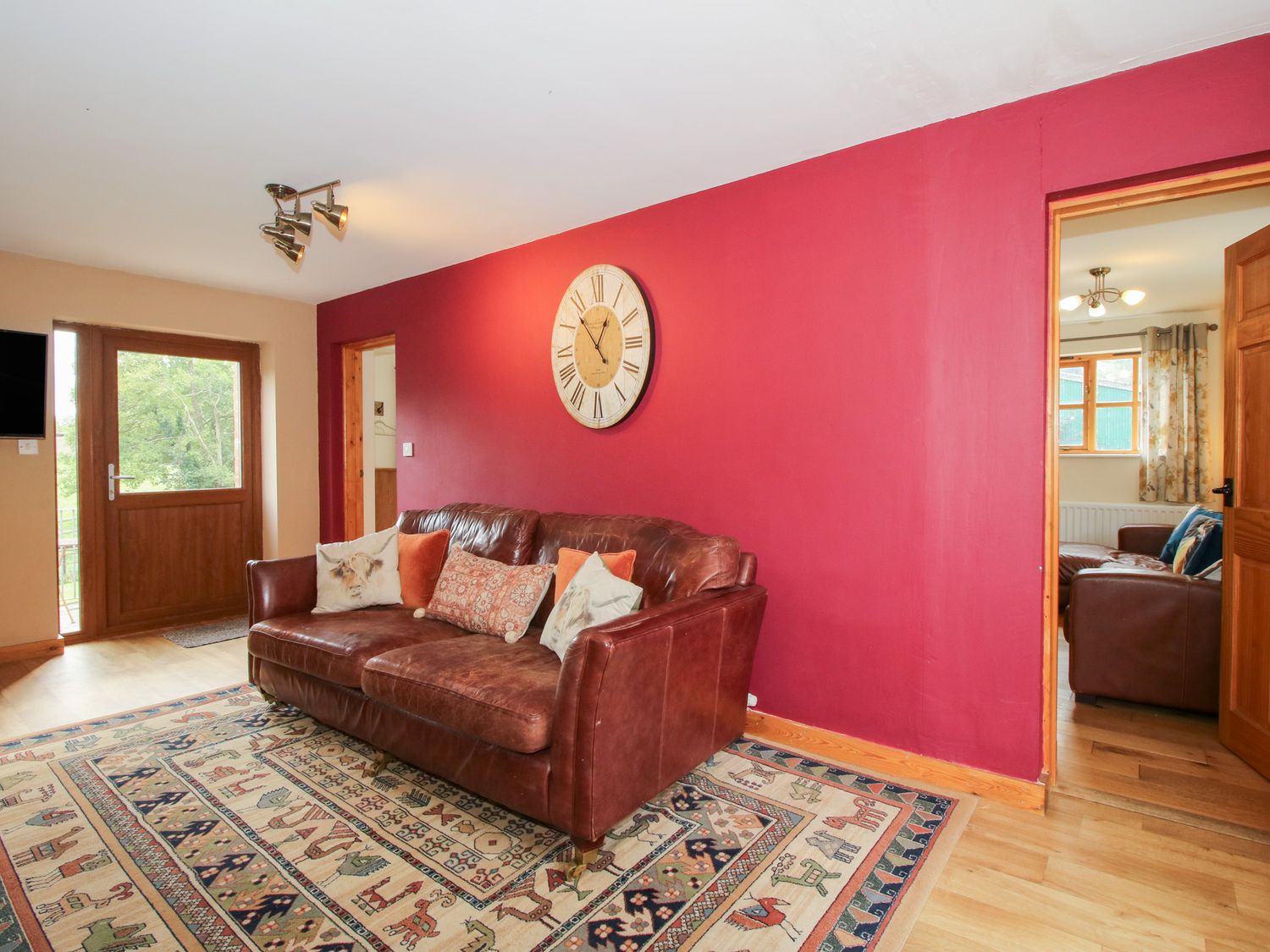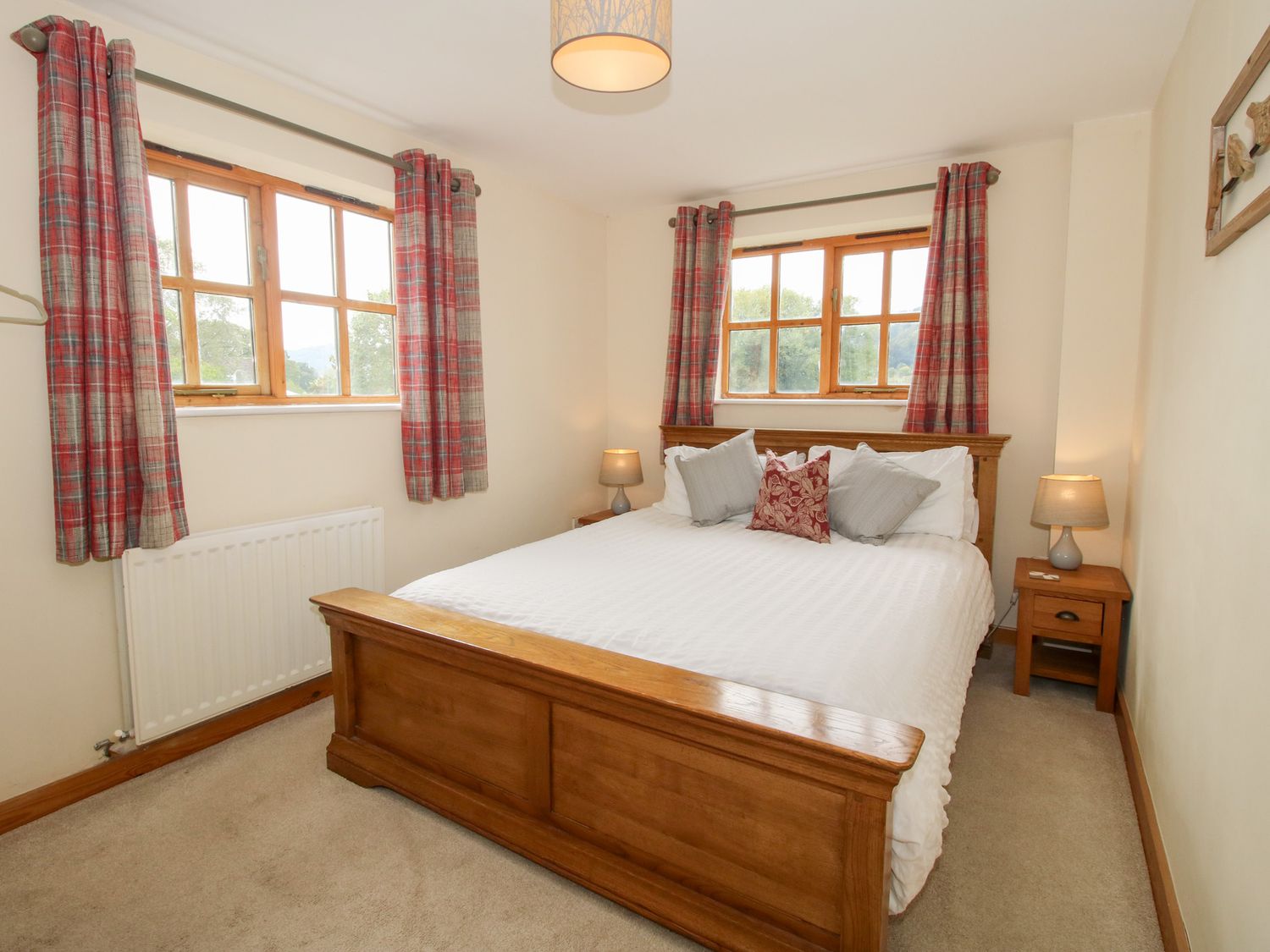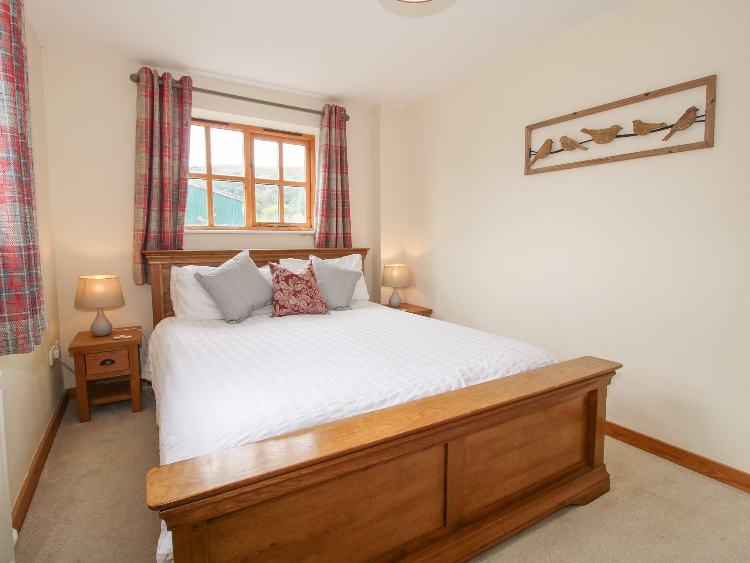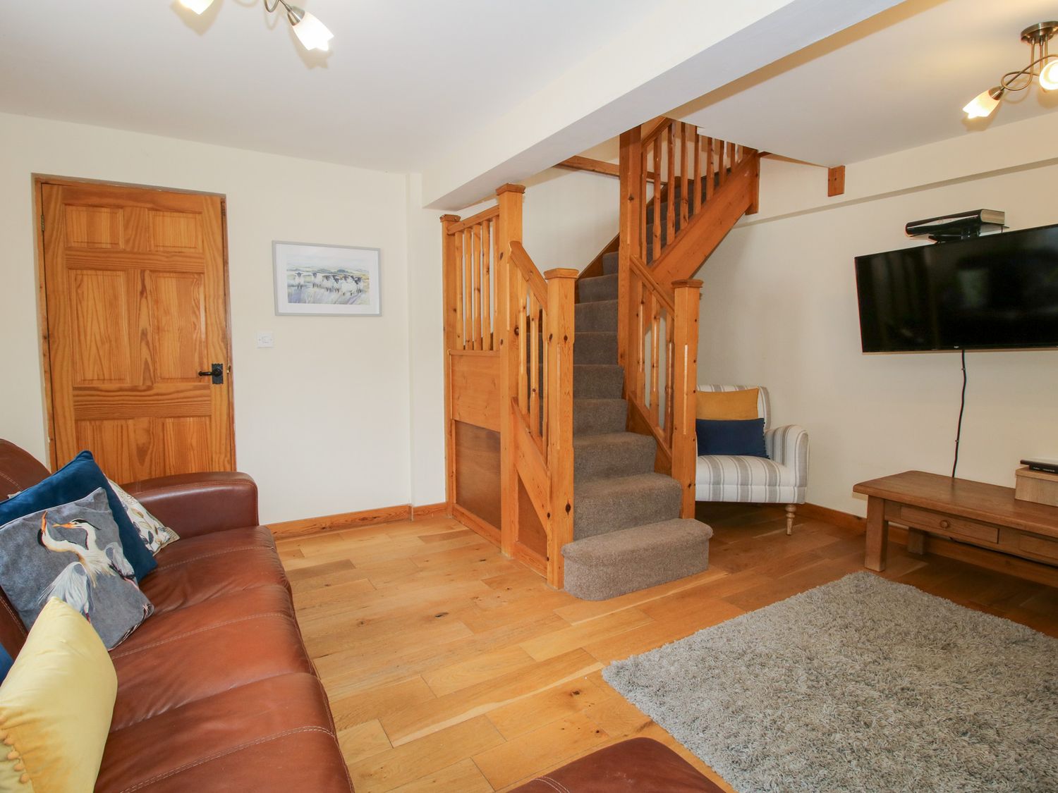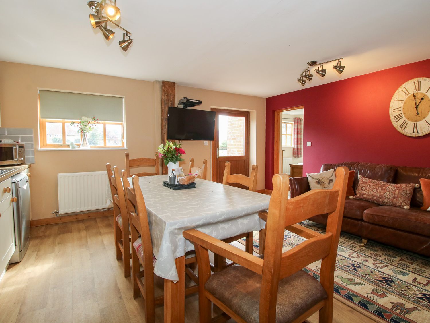 "Three bedrooms: 1 x ground floor king-size double, 1 x double, 1 x single. Bathroom with bath, shower over, basin and WC, ground floor cloakroom. Open-plan living room with kitchen, dining area and sitting area. Sitting room with electric fire."