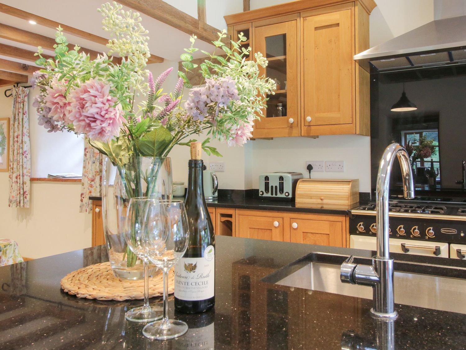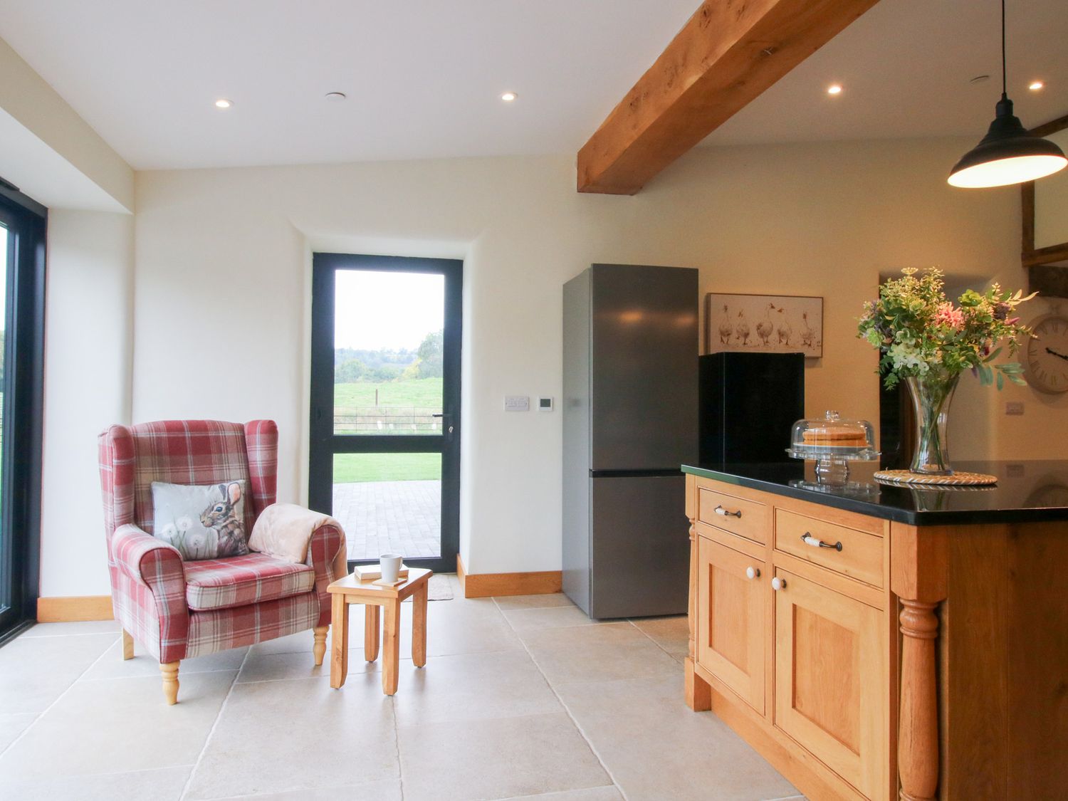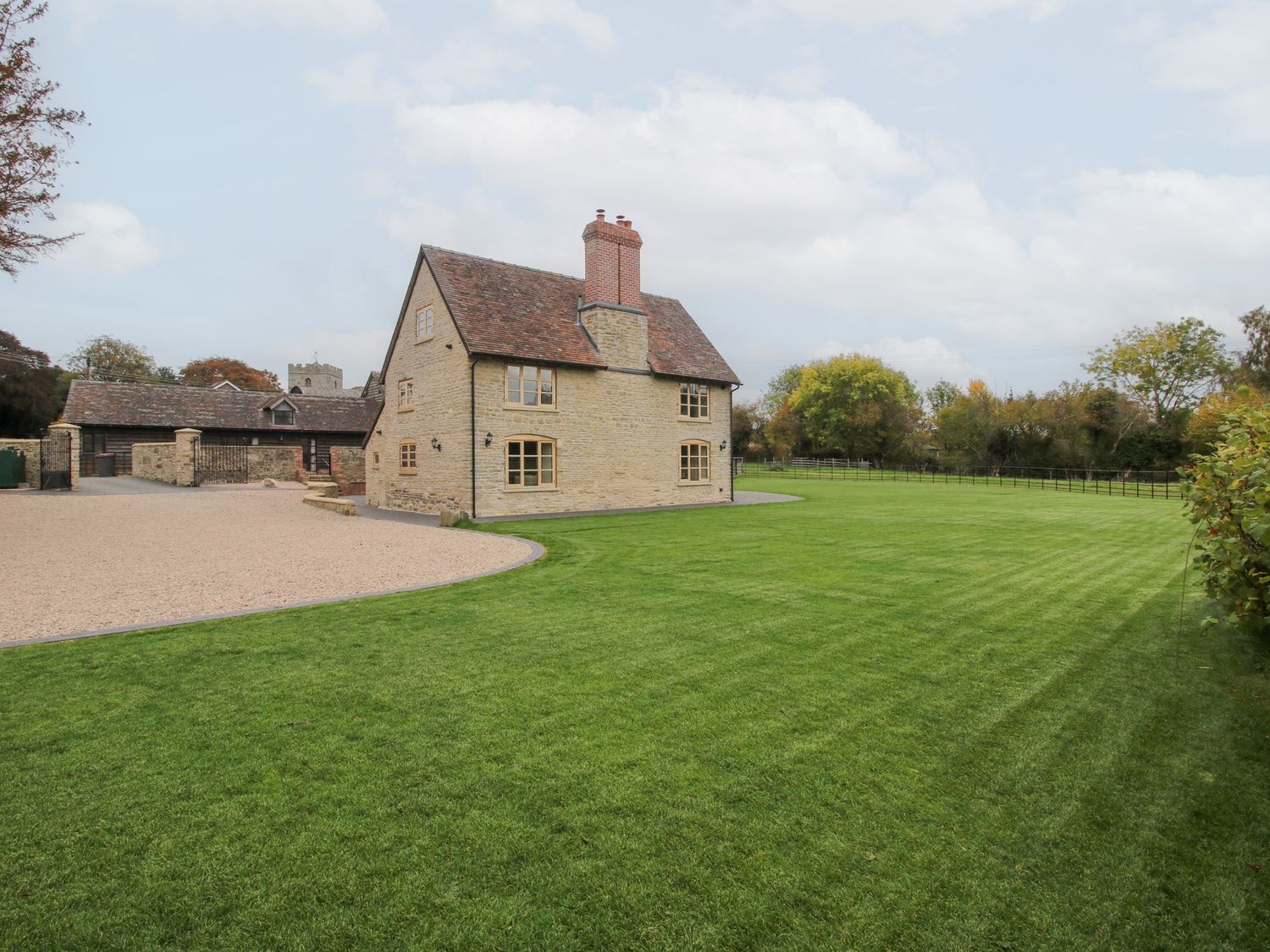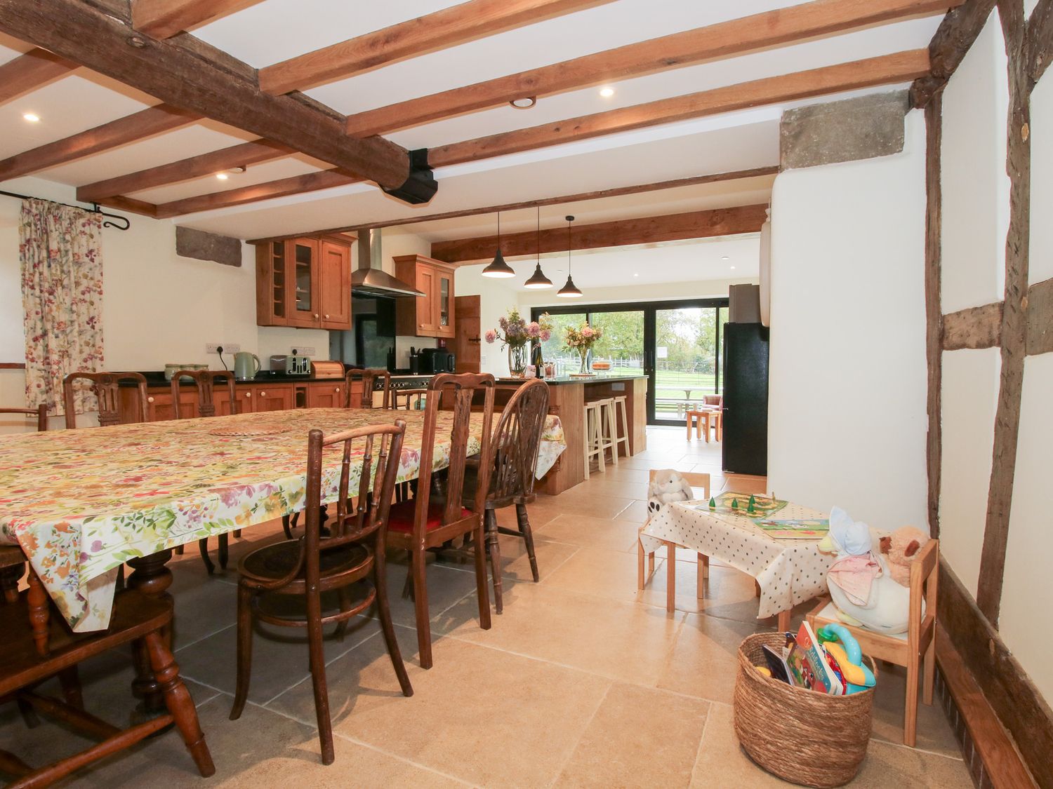 "Grove Farm consists of a kitchen/diner with dining seating for twelve, toaster, breakfast bar, kettle, range cooker with electric oven and gas hob, microwave, fridge/freezer, and dishwasher, a utility with washer/dryer, a sitting room with Smart TV and woodburning stove, and a sitting room with Smart TV and woodburning stove. The bedrooms consist of two second-floor super-king-size with en-suites, two super-king-size with en-suites, second-floor twin with en-suite, and adult bunk bed with en-suite. WiFi, fuel, power, bed linen, and towels are included in the rent. Outside, there is an enclosed wraparound garden with spacious lawn, gravelled area, courtyard, and furniture, and private driveway parking for several cars. Sorry, no pets and no smoking at this property. Guests can find a shop within 4.9 miles and a pub in 0.1 mile. Whatever the weather, a wonderful stay awaits at Grove Farm. Note: This property has a good housekeeping bond of -ú600.Note The wndows on the first floor and second floor are quite low and it is recommended they are locked using the key for the safety of young children