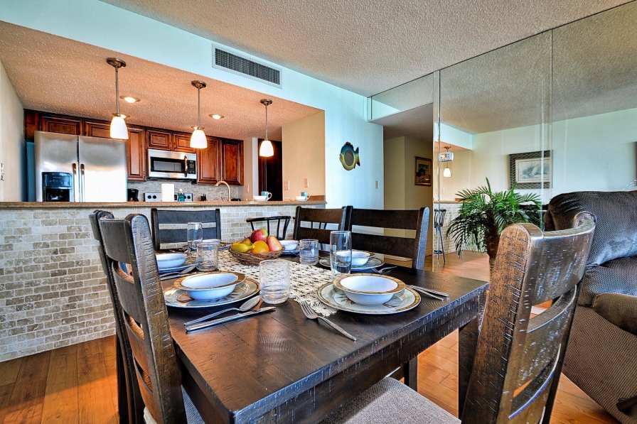 Be welcomed by this spacious 2 bedroom, 2 bathroom unit located on the 8th floor of the 440 West building, with a sparkling view of the Gulf of Mexico. This unit accommodates up to 6 guests. Granite counters greet you as you walk into the updated kitchen. This kitchen has all the conveniences of home, including a hidden washer and dryer in the kitchen cabinets. The breakfast bar is a great place for guest to have a quick meal. If you are feeling more formal, the dining table is perfect with its seating for 6. Enjoy watching the flat screen TV on the comfy couch and recliner in the living room. Walk out the living room sliders to the balcony with its beautiful Gulf of Mexico view. The view from the balcony is a great place to watching for dolphins, manatees and boats on the water. Come snuggle up in the king size bed while watching the flat screen TV. The master bedroom has an attached full bathroom with walk in shower. A roomy guest bedroom has a queen size bed and two twin beds in the room. This room also has a flat screen TV and is a great place to have a little quiet time. The guest bathroom has a walk in shower, the perfect place to wash off the salt and sand. Outside you will find the amazingly expansive pool deck with deck chairs, shuffle board, and a heated swimming pool, all on the waterfront. This property is a monthly rental. HOUSE RULES and Special requirements: You must be 25 years of age to book any of our homes. The person booking the home must also be one of the occupants. Monthly Minimum Rentals. \'No Broken Months allowed\' 14 Days advance booking normally required for Association approval Lease application to be completed along with payment of the $100.00 application fee after booking has been approved. No Smoking. No Pets \'Srickly enforced by the Condo Association\' No Parties. No Trailers. Check-in is after 4pm Check-out is before 10am Be welcomed by this spacious 2 bedroom, 2 bathroom condo. Unit accomodates up to 6 guests. This unit is located on the 8th floor. Sit on the balcony and enjoy the view of the water. The updated full kitchen has granite counters and beautiful cabinets with all the conveniences of home. The breakfast bar is a great place for guests to has quick meal. Beautiful new dining table has seating for 6 guests. Enjoy watching the flat screen TV in the living room on the new couch and recliner. Watch TV in bed in the comfortable master bedroom with attached full bath. The bathroom has walk-in shower. There is an additional vanity area outside of the bathroom too. A roomy guest bedroom has 1 queen bed and 2 twin size beds with a flat screen TV. Guest bathroom has walk in shower combo. In addition, there is a washer and dryer in the unit. Outside you will find the amazingly expansive pool deck with deck chairs, shuffle board, and a swimming pool, all on the waterfront.