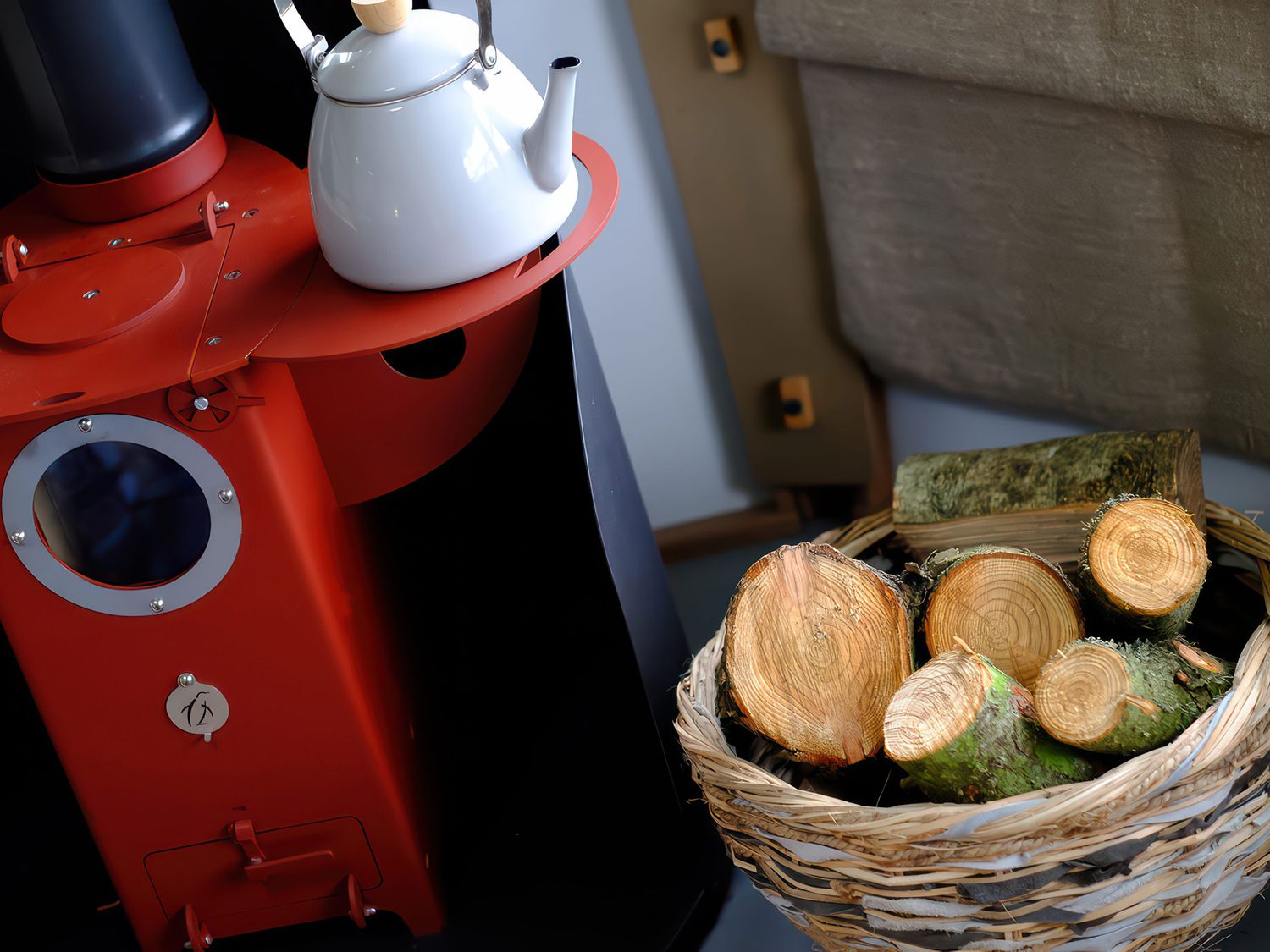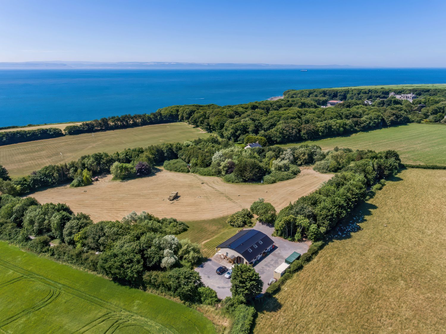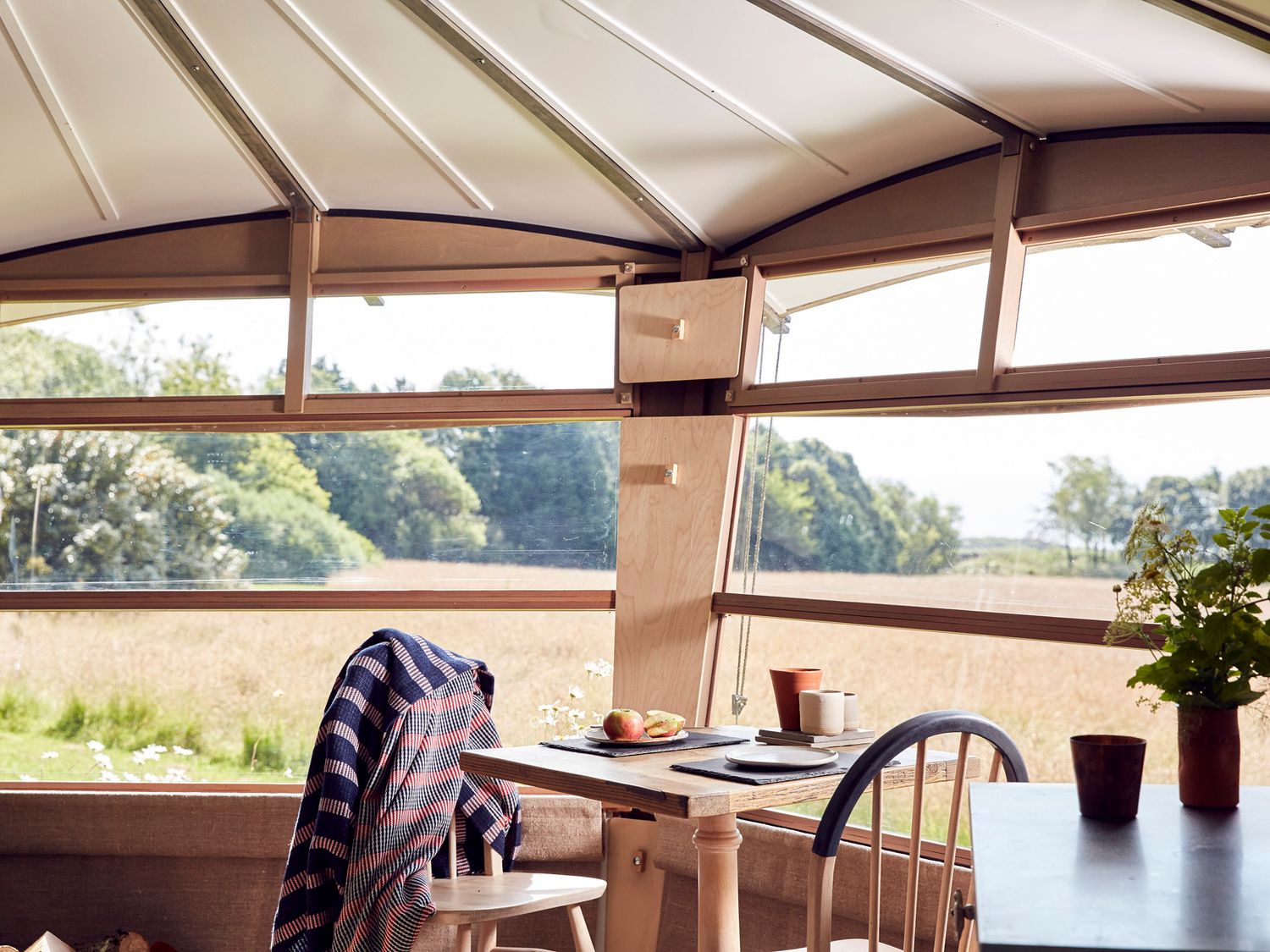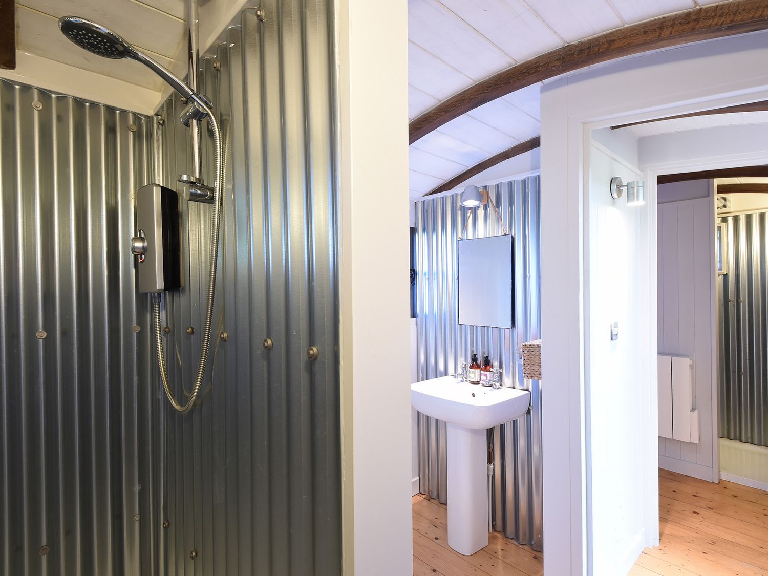 "Sea View. Single-storey. Open-plan living space with double bed, dining area, and woodburning stove. Private external shower room with walk-in shower, basin, WC. Private external kitchen"