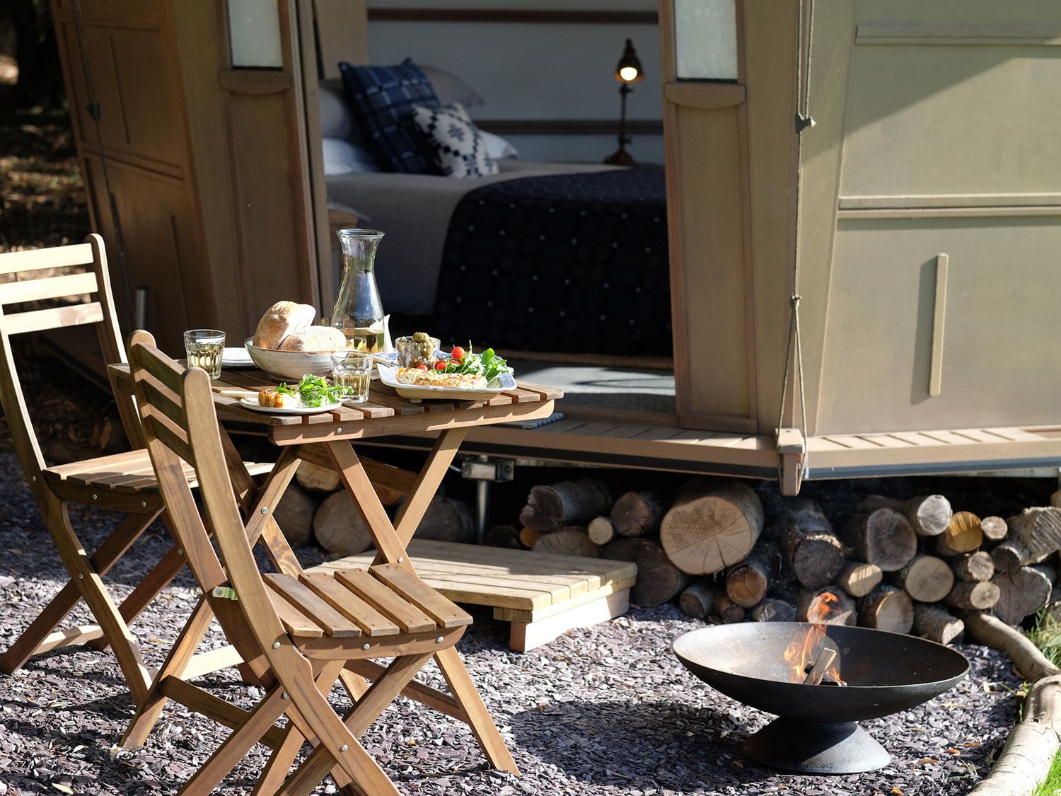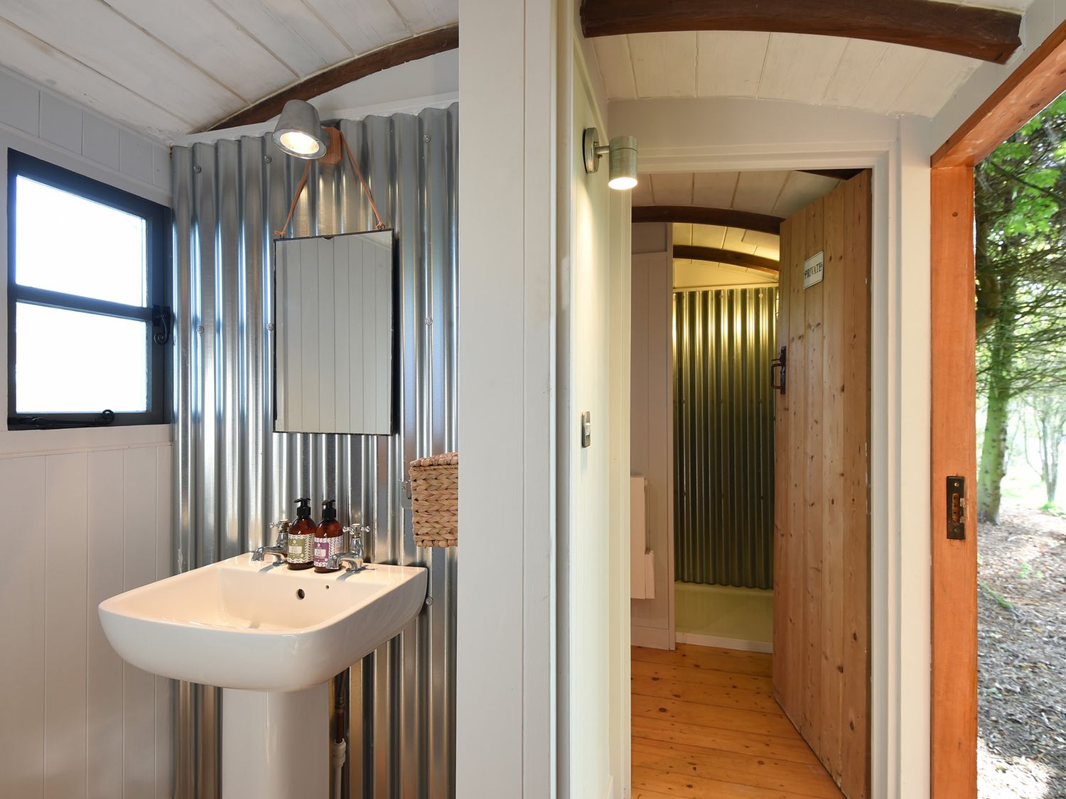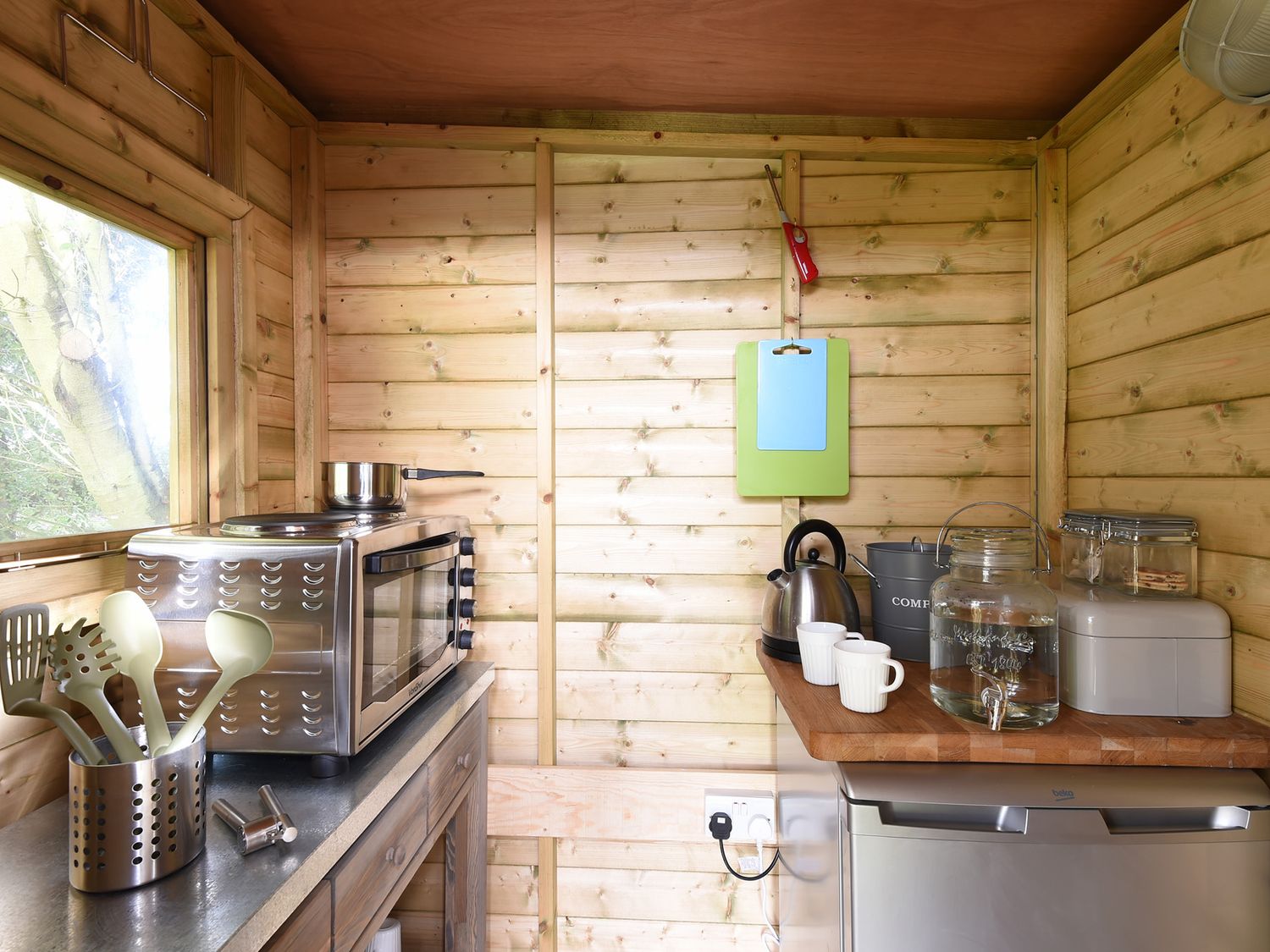 "CABAN MERIOS, a single-storey cabin, consists of an external kitchen with mini-oven, electric hob, fridge/freezer, and kettle, and an open-plan living space with double bed, dining seating for two people, and a woodburning stove, serviced by an external shower room. Outside, there is a non-enclosed garden with lawned space, a charcoal barbecue, fire pit, and a terrace with furniture and designated off-road parking. Sorry, no pets and no smoking. You'll find a shop in 2.3 miles, pub in 2 miles, river in 0.4 miles, and beach in 1.2 miles. Fuel, power, starter pack for woodburning stove, bed linen, and towels are included in the rent. Wherever your exploration takes you, enjoy all this with a stay at CABAN MERIOS. Note: Good Housekeeping Bond of 150 GBP. Note: Shower room and kitchen are external buildings. Note: External pot-wash available. Note: No WiFi, but 4G available."
