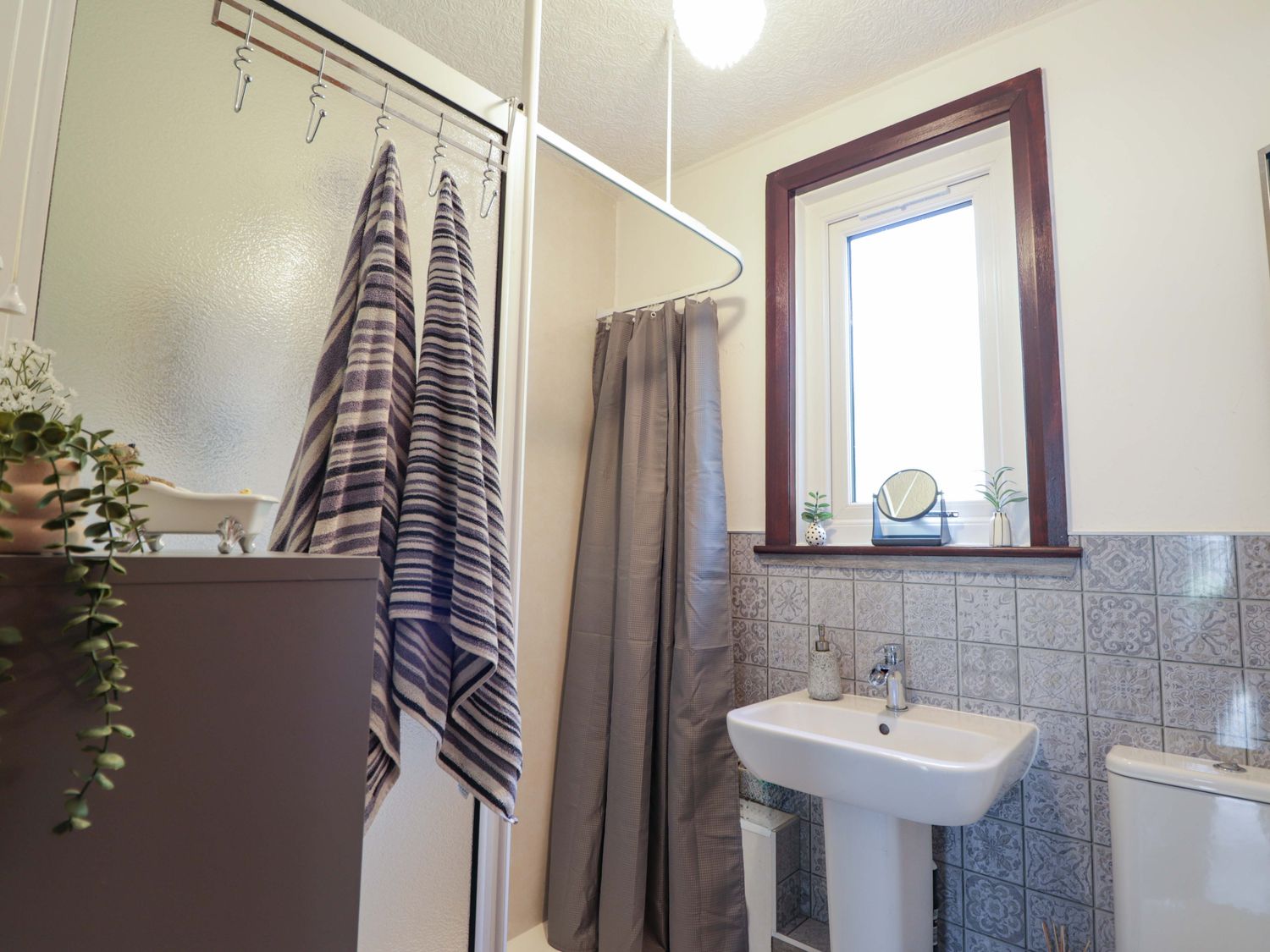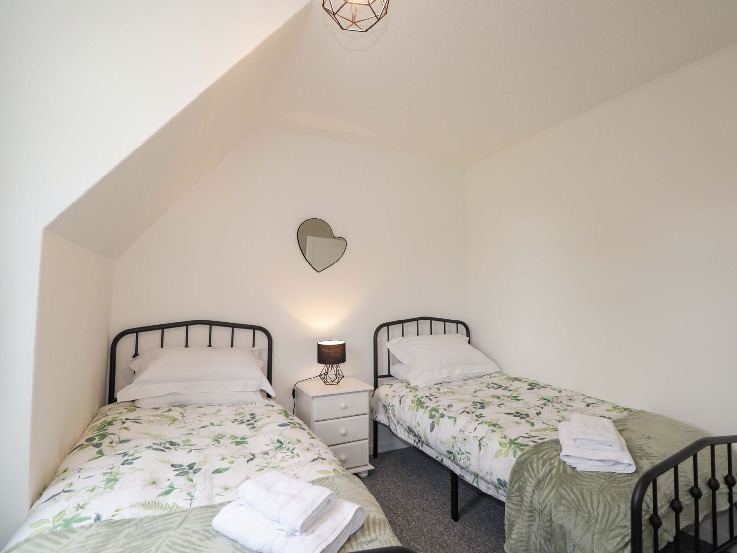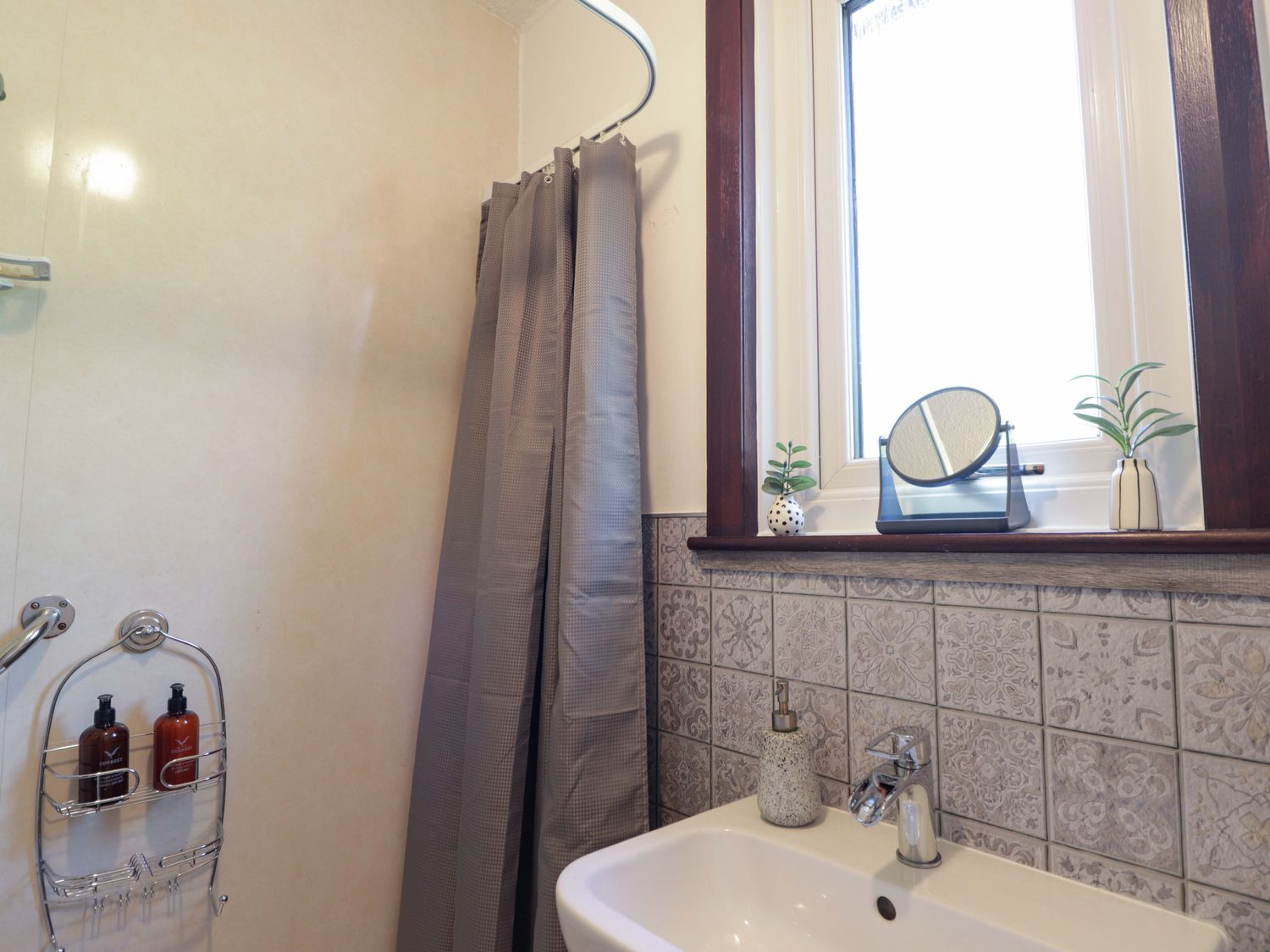 "Two bedrooms: 1 x double, 1 x twin. Ground-floor shower room with walk-in shower, basin and WC. Kitchen. Dining room. Sitting room with electric fire. Conservatory