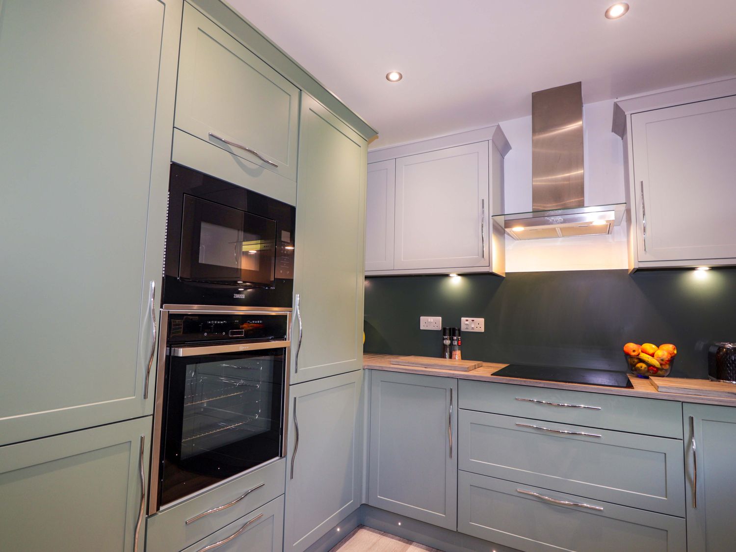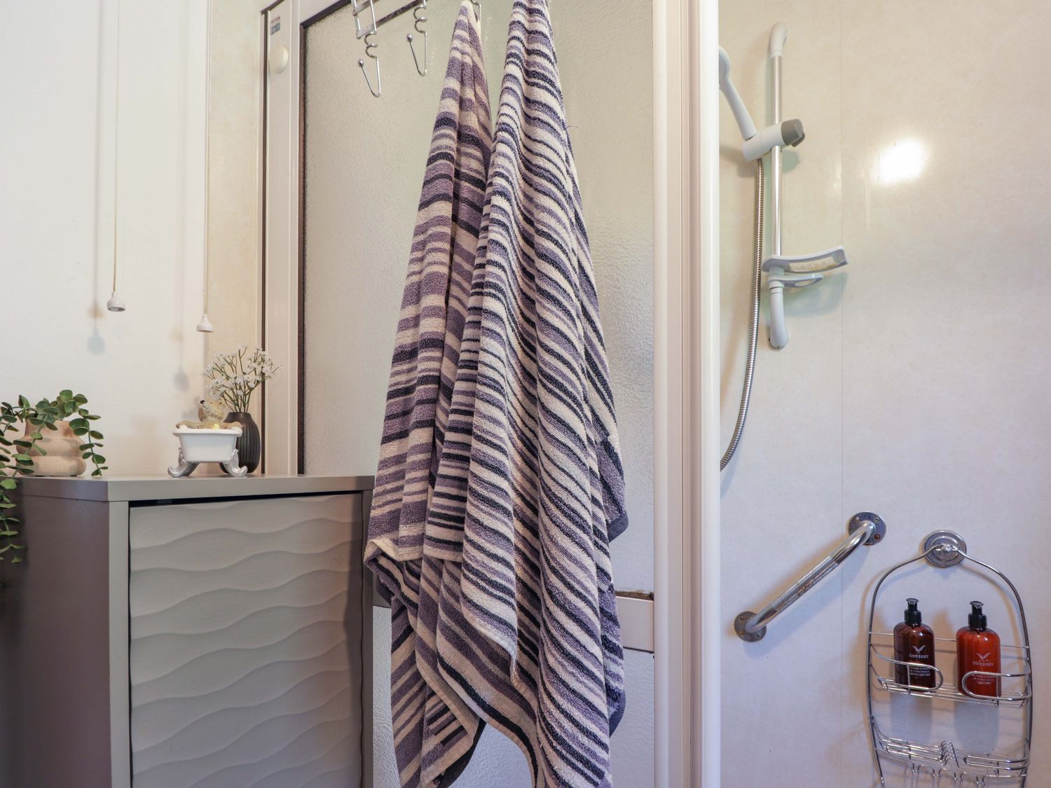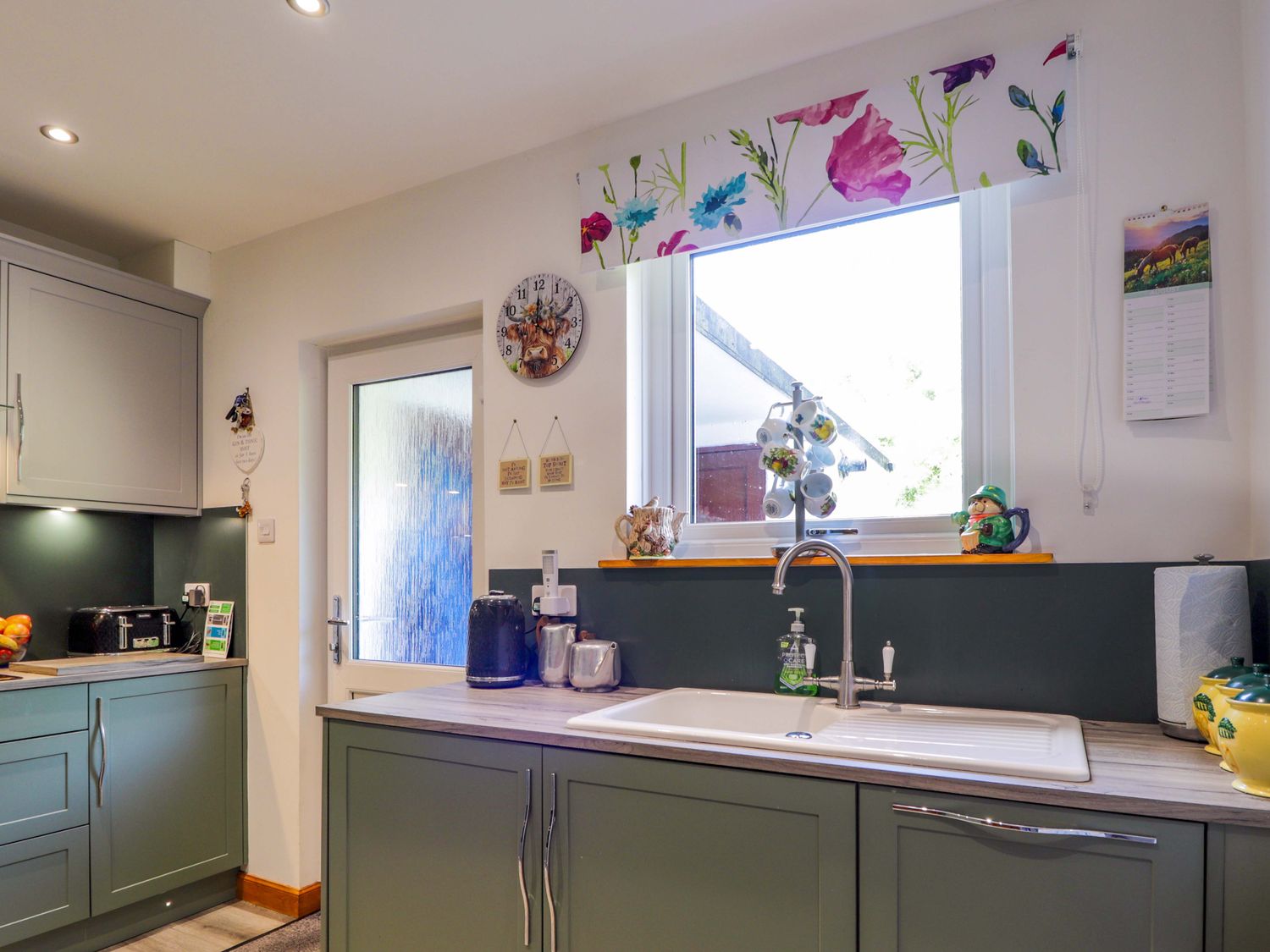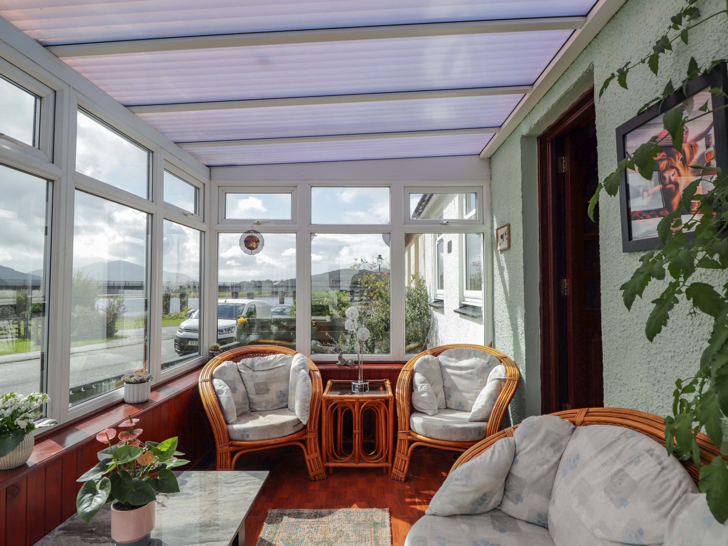 "Two bedrooms: 1 x double, 1 x twin. Ground-floor shower room with walk-in shower, basin and WC. Kitchen. Dining room. Sitting room with electric fire. Conservatory
