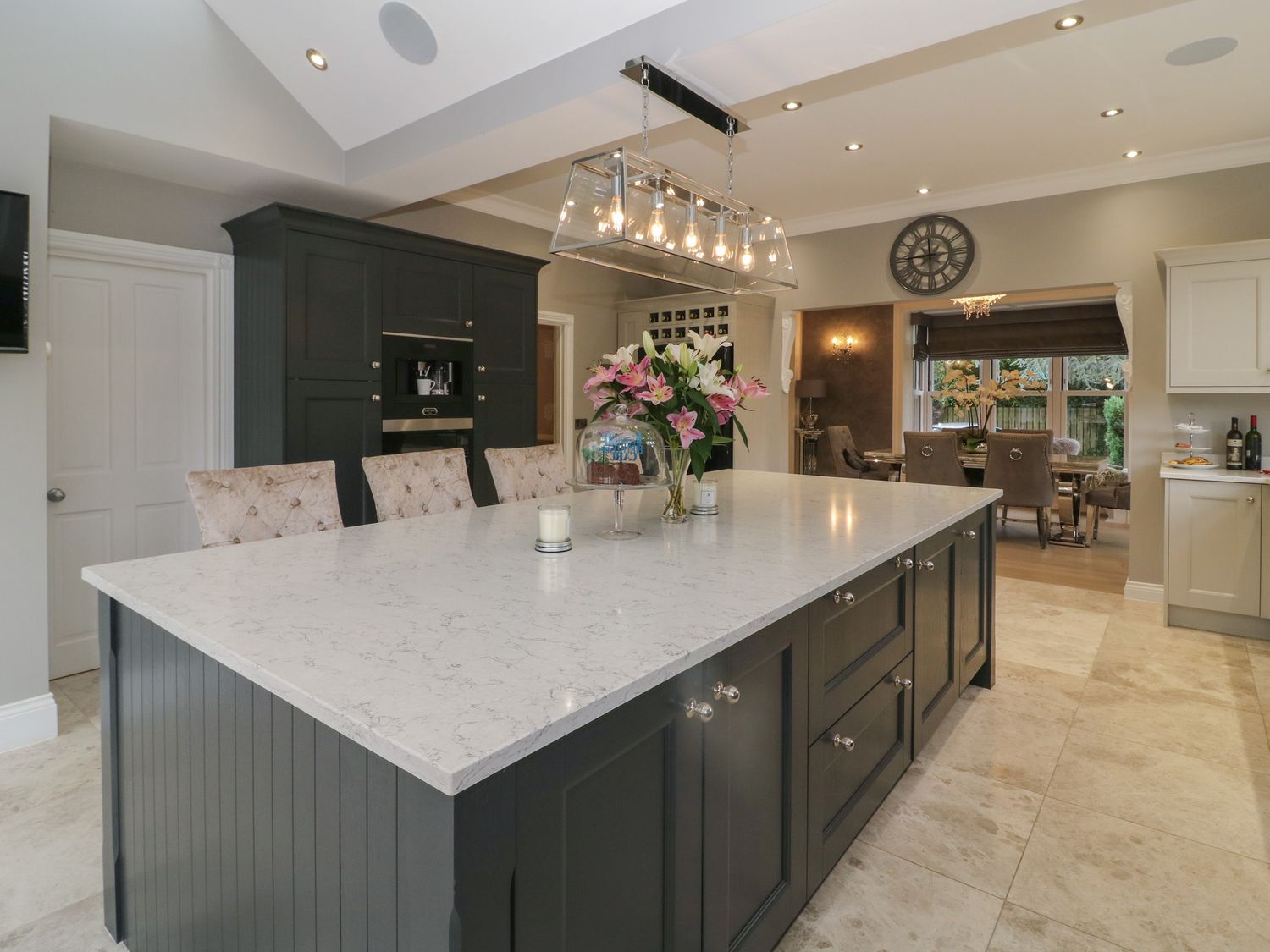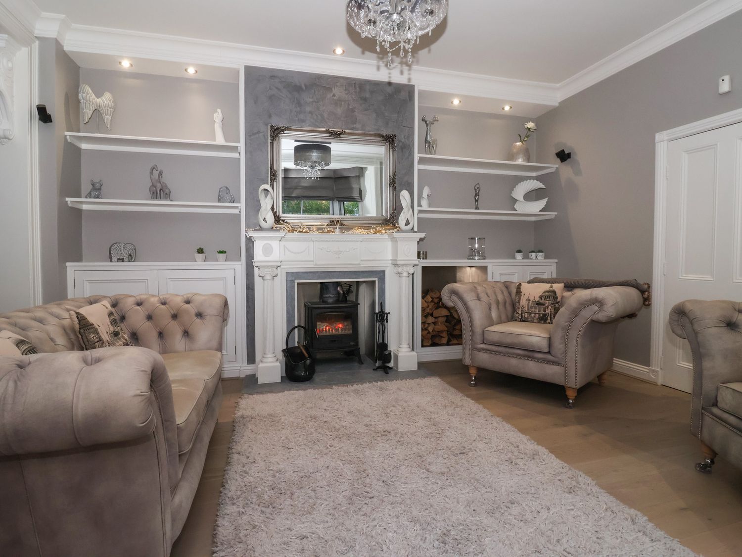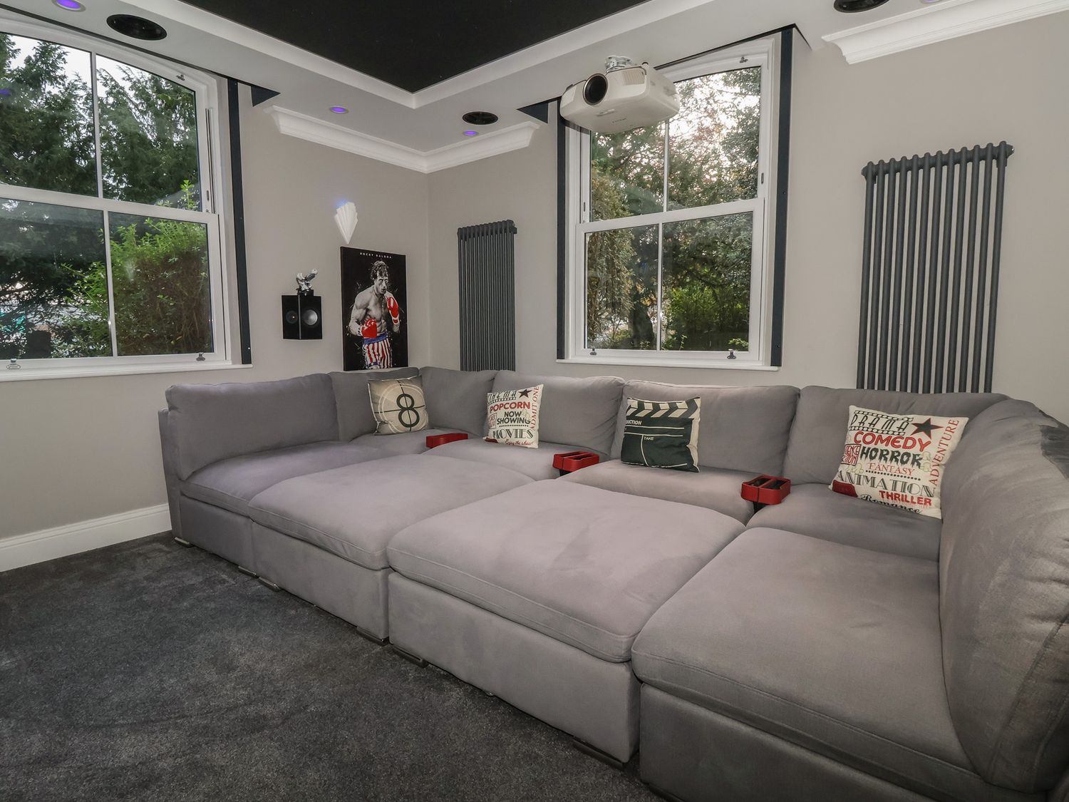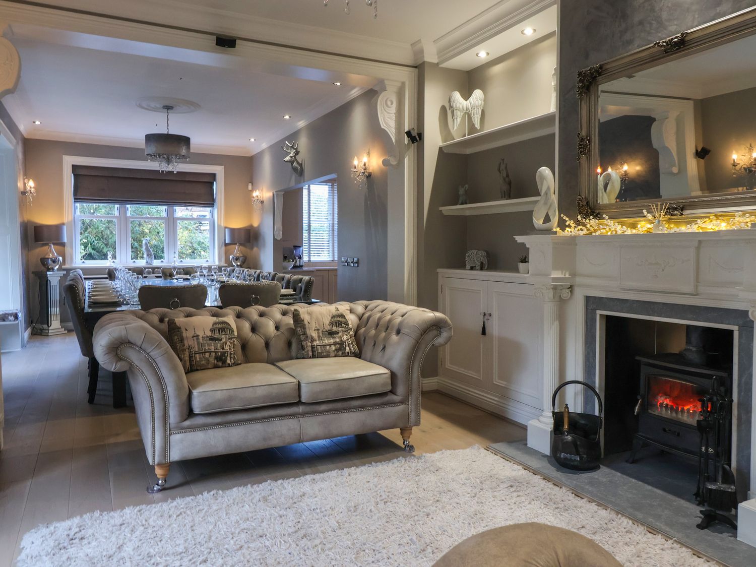 "Seven bedrooms: 1 x ground-floor king with walk-in shower & WC opposite, 1 x family double & king with en-suite and walk-in shower, 2 x king with en-suite walk-in shower, basin and WC, 1 x double, 2 x king-size. Bathroom with bath, basin, and WC. Ground-floor shower room with walk-in shower. Shower room with walk-in shower, basin, and WC. Cloakroom with basin and WC. Kitchen/diner. Utility. Living/dining room with log burner. Cinema room with full surround sound and LED lighting"