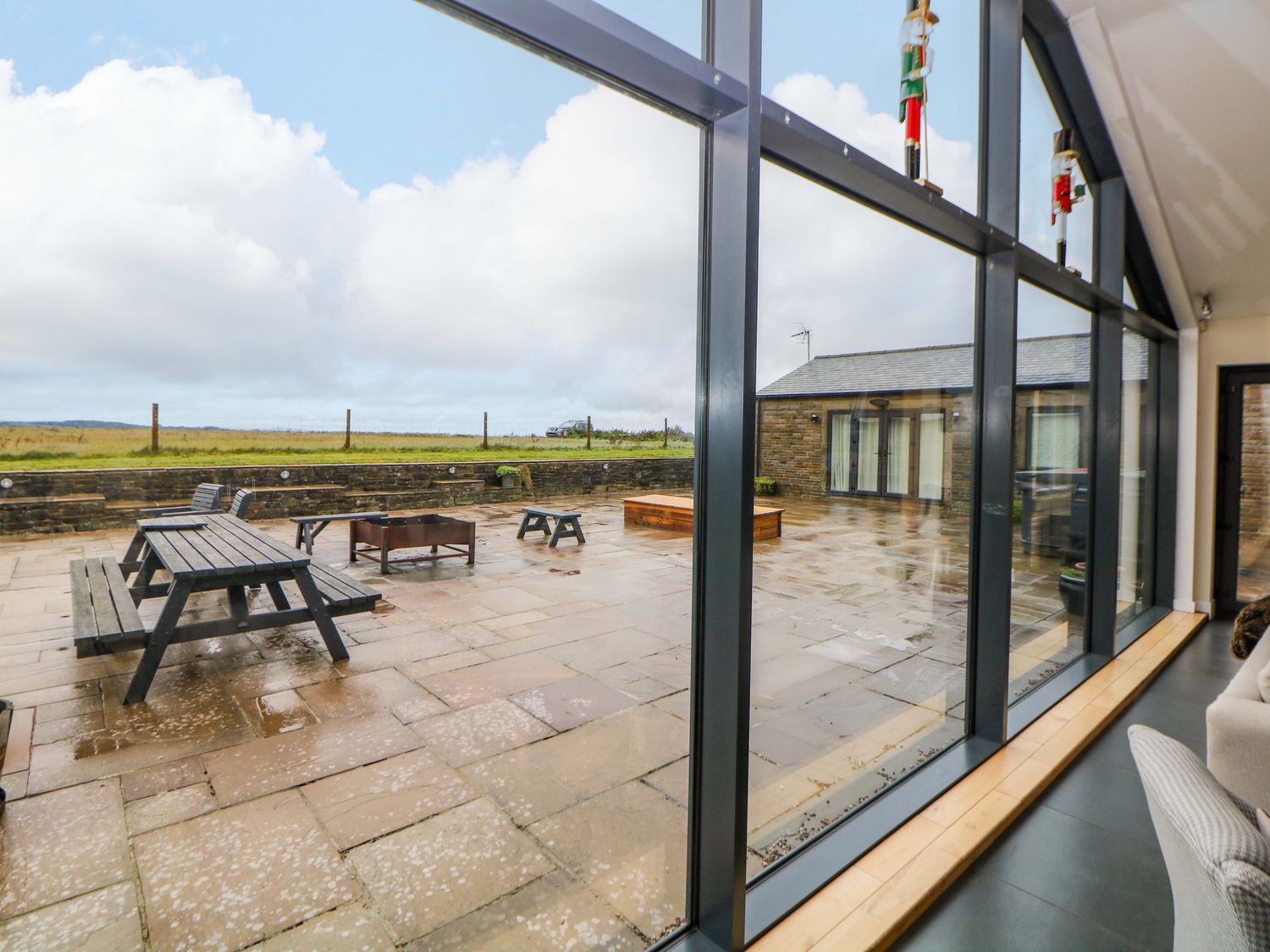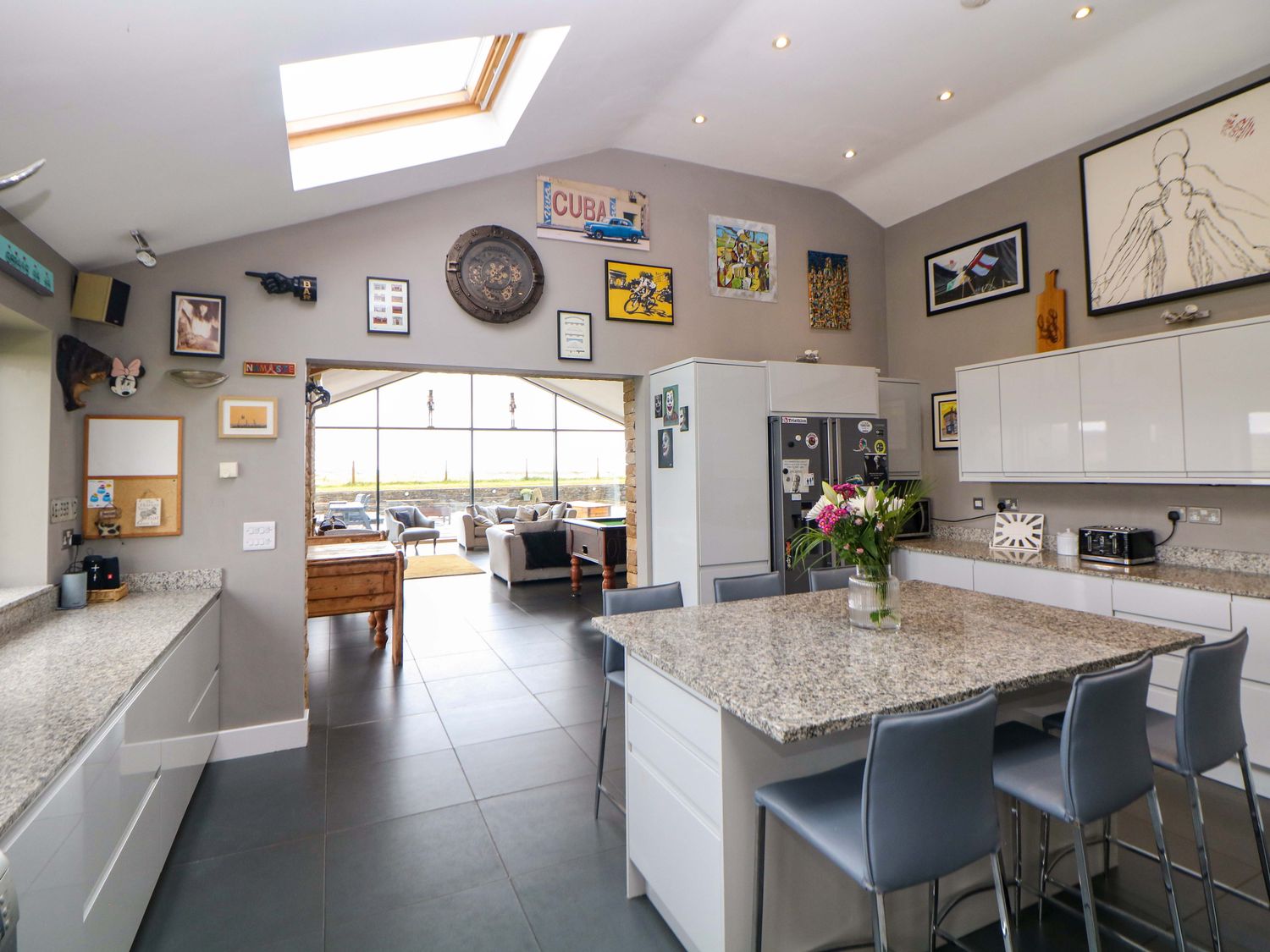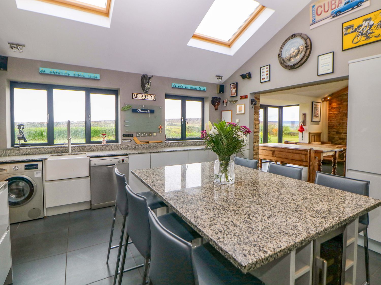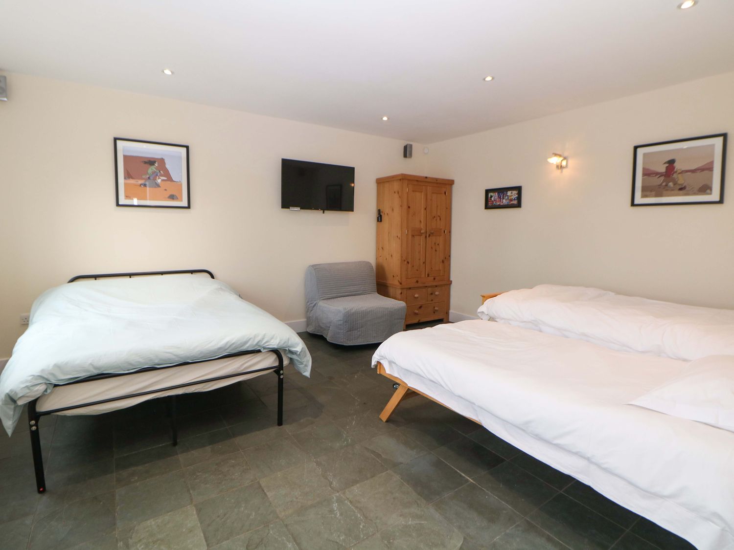 "Single-storey. Four bedrooms: 1 x king-size with TV, 1 x single sofa bed, TV with jack and Jill basin and wc, 1 x double with Jack and Jill WC, 1 x double bed, 1 x small double sofa bed with en-suite walk-in shower, basin and WC, 1 x family room with 1 x double, 2 x single with additional single sofa bed. Cloakroom with basin and WC. Bathroom with freestanding bath, walk-in shower, basin and WC. Open-plan living space with kitchen, dining and sitting area with woodburning stove"