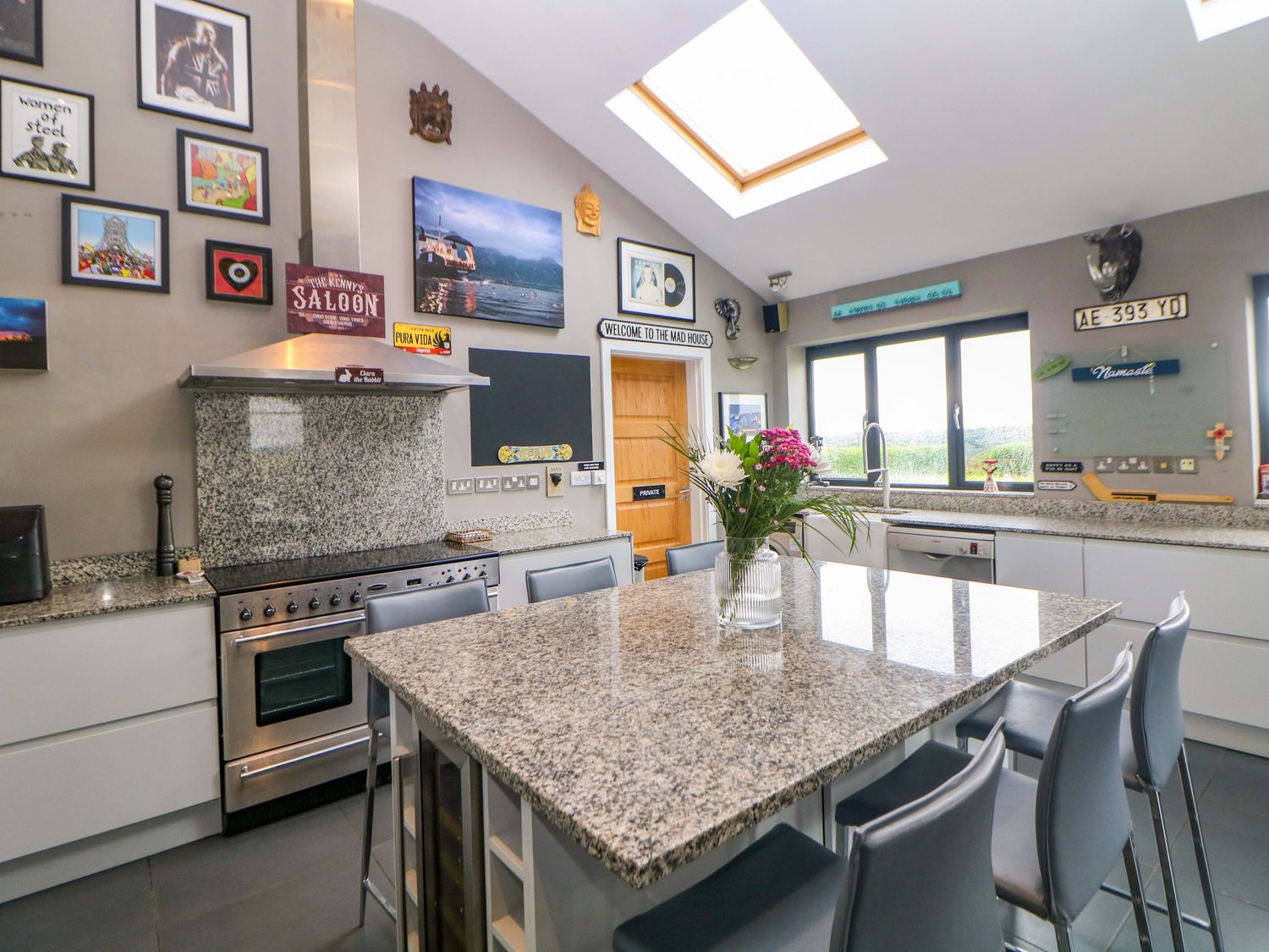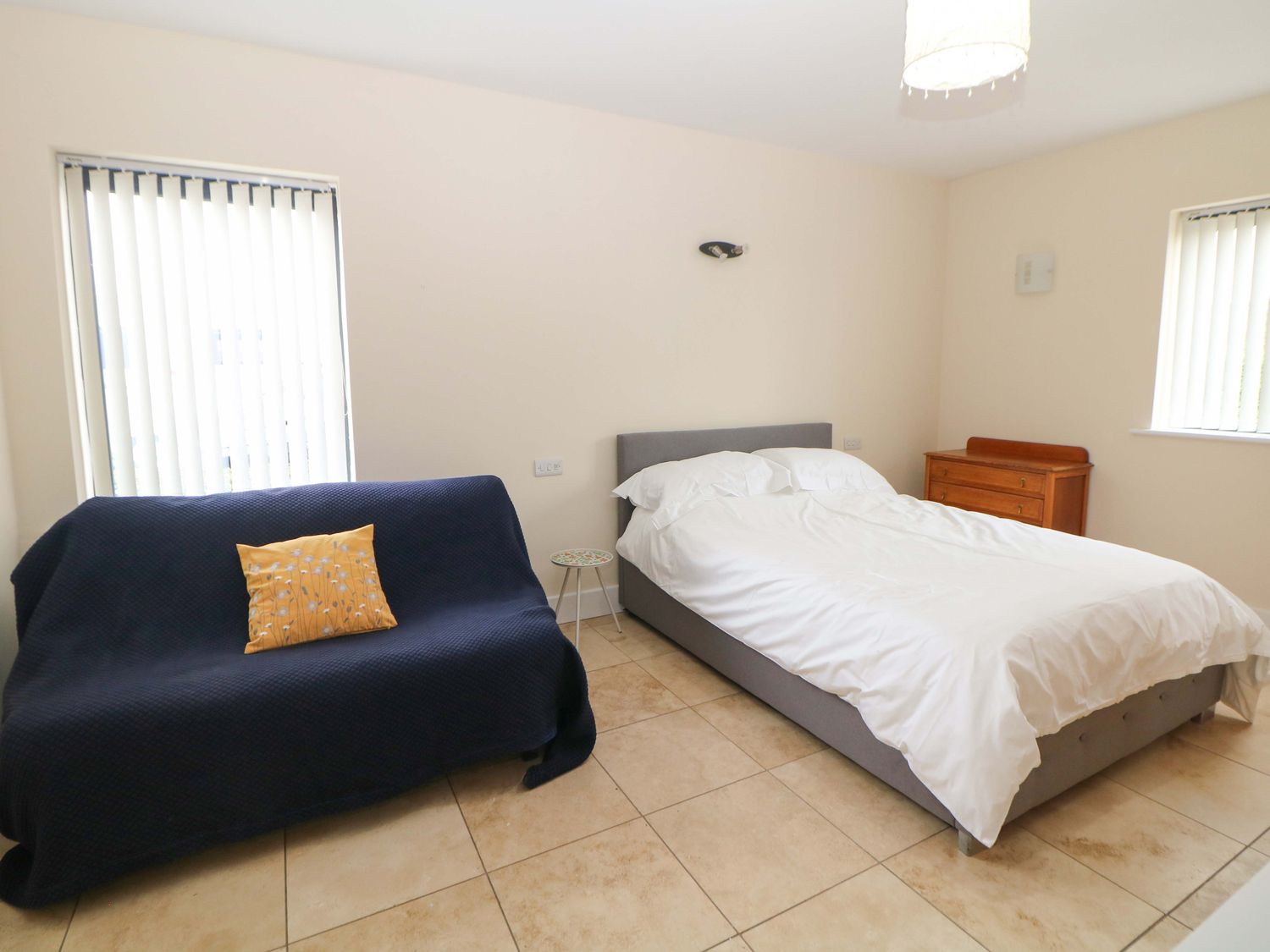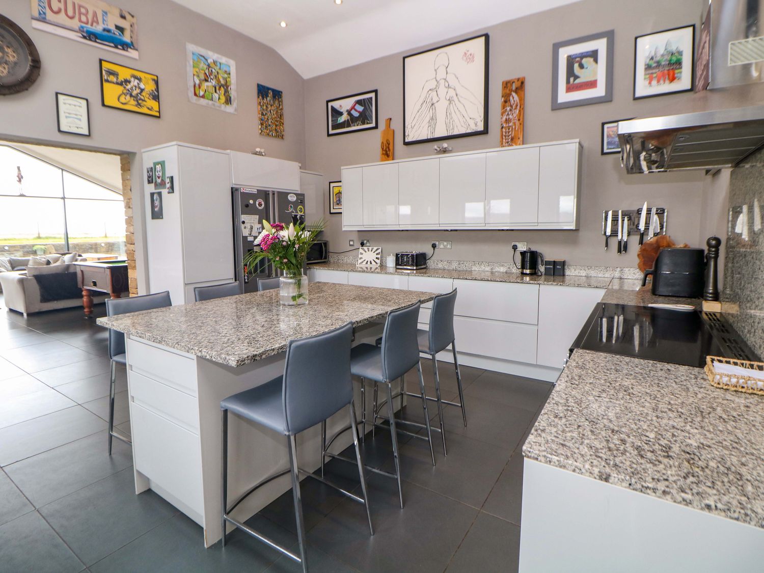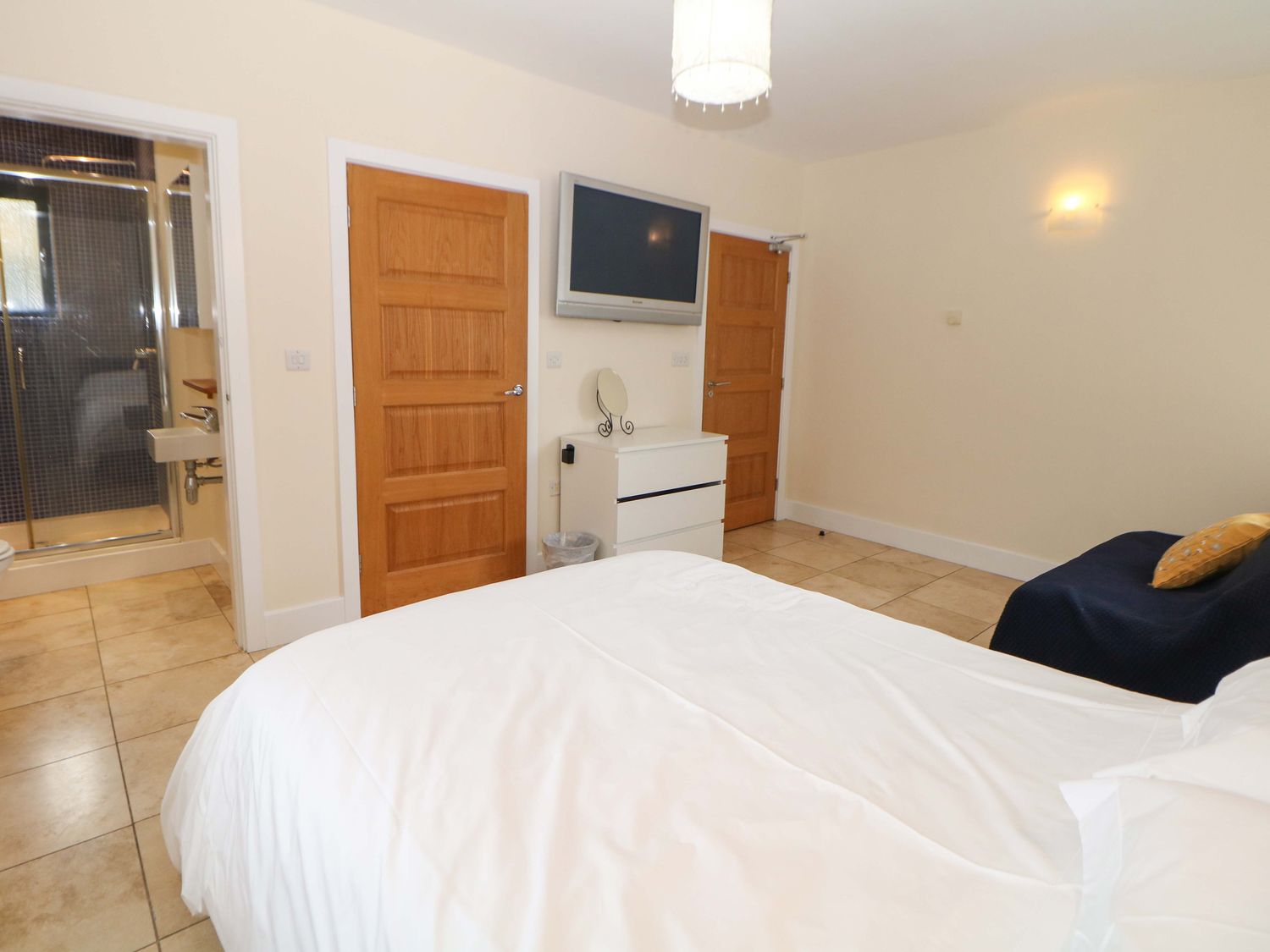 "Single-storey. Four bedrooms: 1 x king-size with TV, 1 x single sofa bed, TV with jack and Jill basin and wc, 1 x double with Jack and Jill WC, 1 x double bed, 1 x small double sofa bed with en-suite walk-in shower, basin and WC, 1 x family room with 1 x double, 2 x single with additional single sofa bed. Cloakroom with basin and WC. Bathroom with freestanding bath, walk-in shower, basin and WC. Open-plan living space with kitchen, dining and sitting area with woodburning stove"