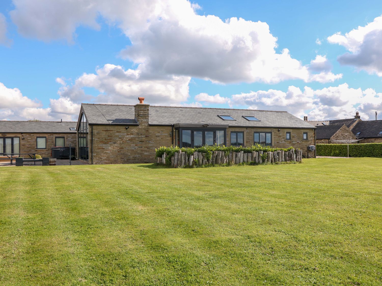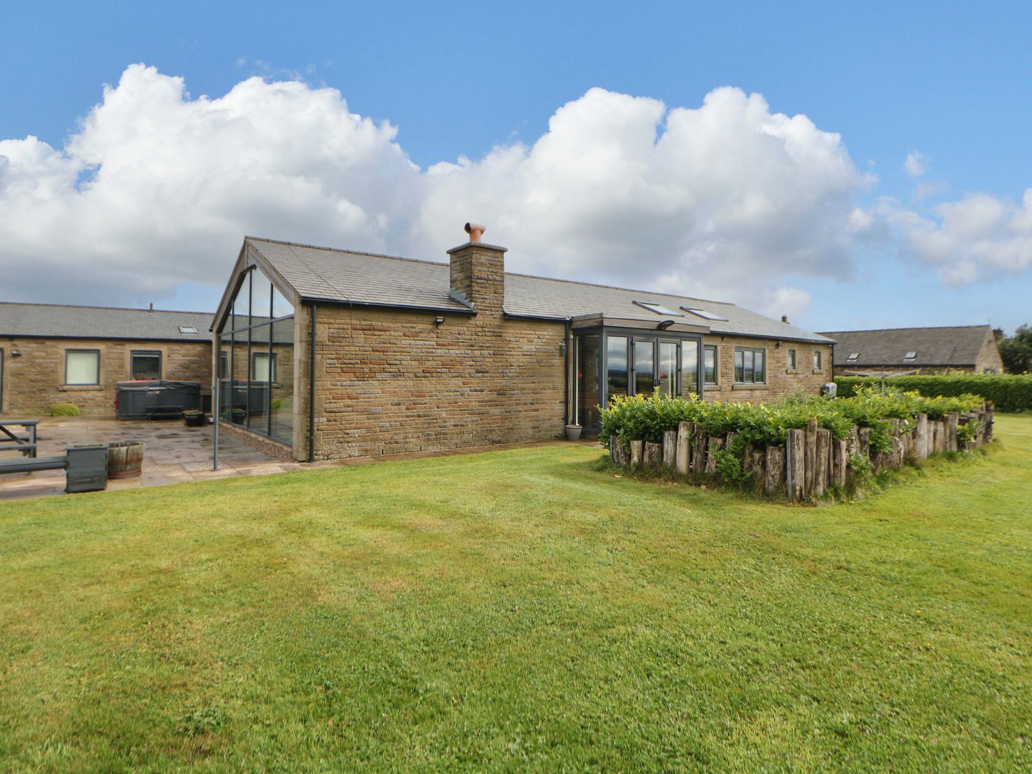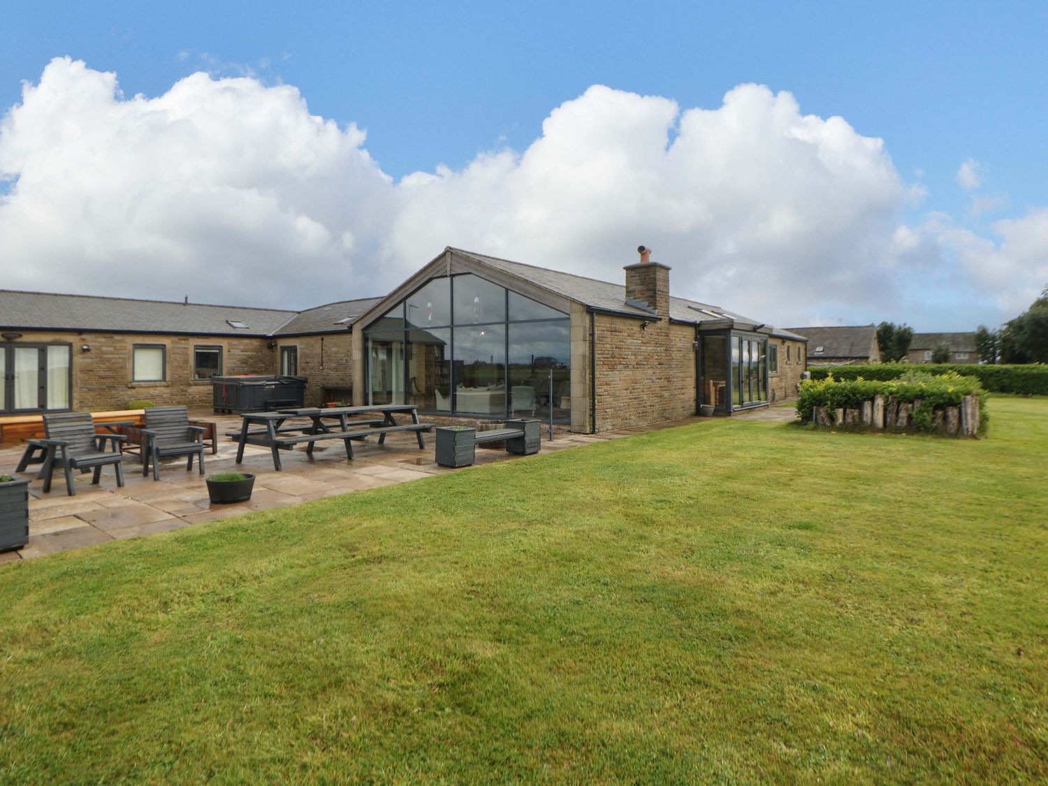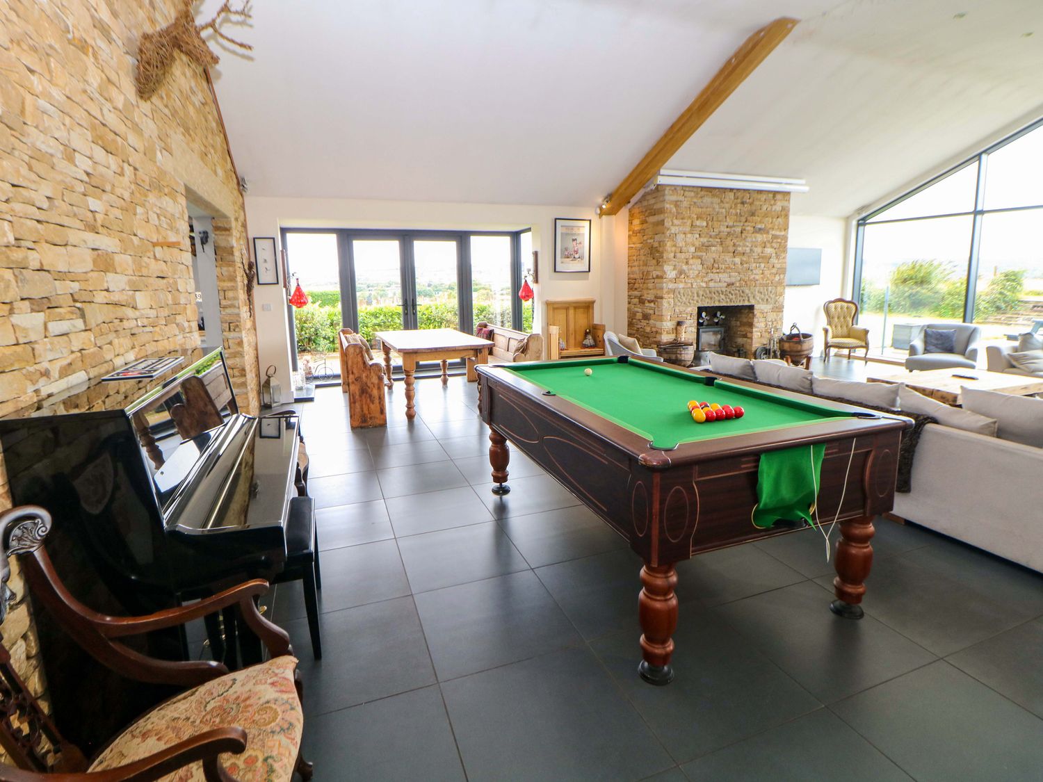 "Highgate House consists of an open-plan living space with kitchen, dining and sitting area with woodburning stove, a cloakroom with basin and WC, a Jack-and-Jill cloakroom with basin and WC, and a bathroom with freestanding bath, walk-in shower, basin and WC. 1 x king-size, 1 x single sofa bed, TV with jack and Jill basin and wc, 1 x double with Jack and Jill WC, 1 x double bed, 1 x double sofa bed with en-suite walk-in shower, basin and WC, 1 x family room with 1 x double, 2 x single with additional single sofa bed. Central heating. Rangemaster oven and hob, microwave, fridge/freezer, dishwasher, washing machine. TV, WiFi, pool table, piano. Fuel, power, bed linen and towels are all included in the price. Off-road parking. Front patio with furniture. Enclosed rear garden with lawn, patio, furniture and hot tub. Sorry, no pets and no smoking. Shop 2.2 miles, pub 1.1 miles. Note: There is a 200 GBP Good Housekeeping bond to be paid directly to the owner."